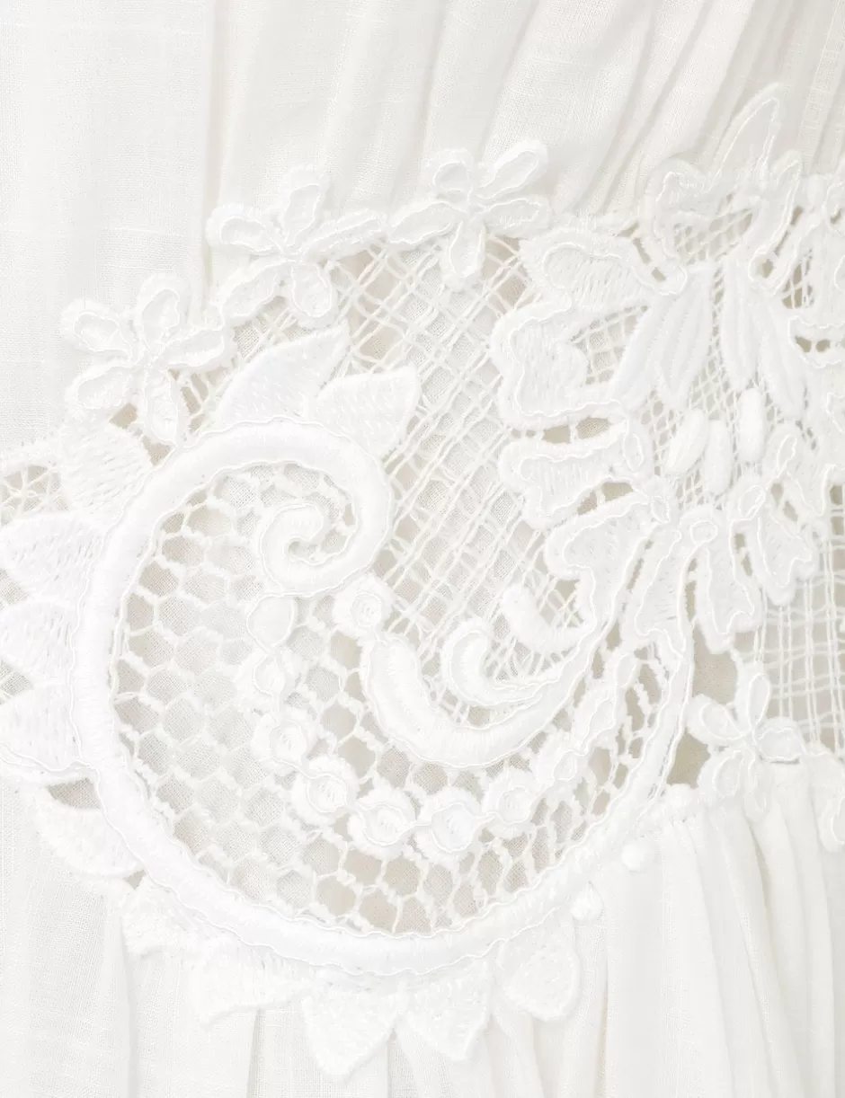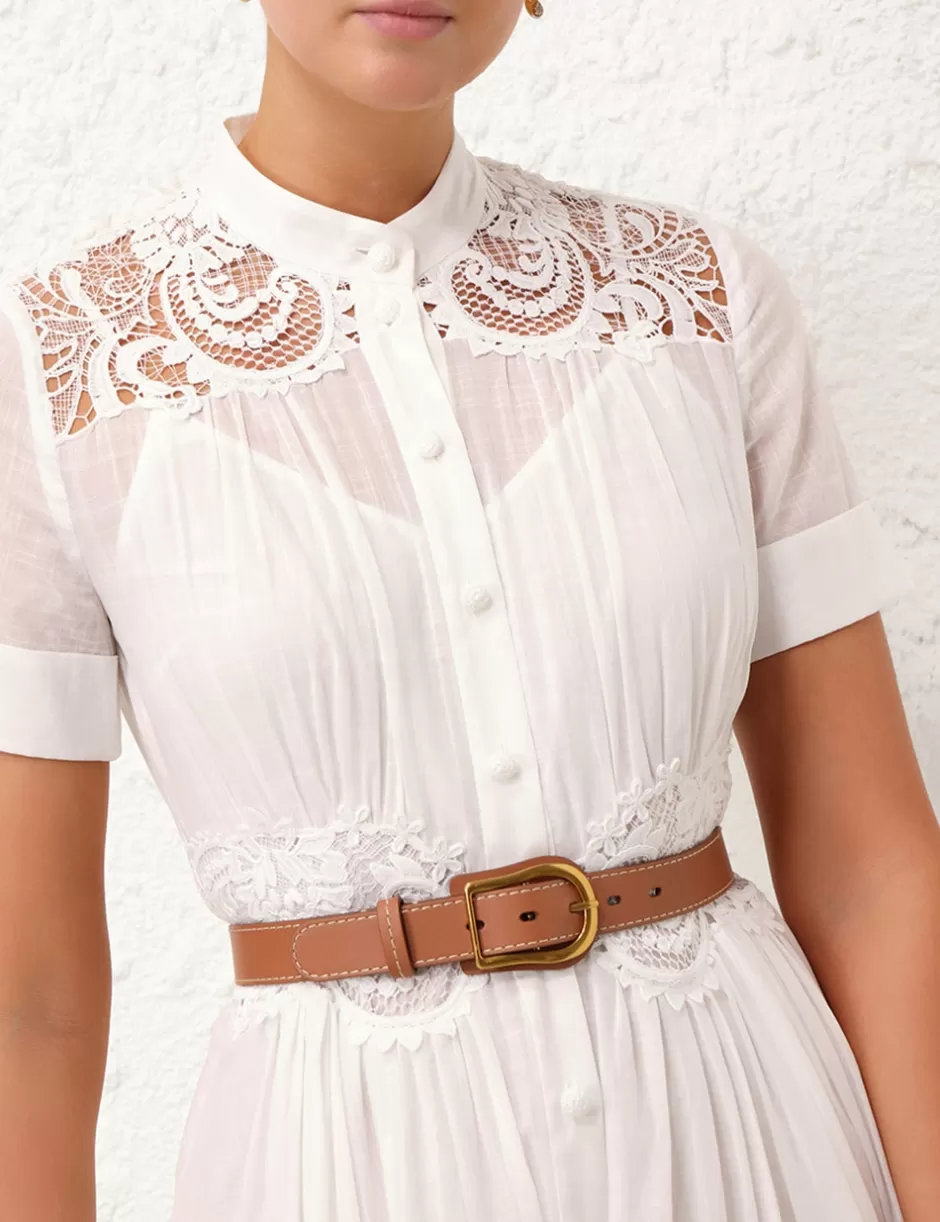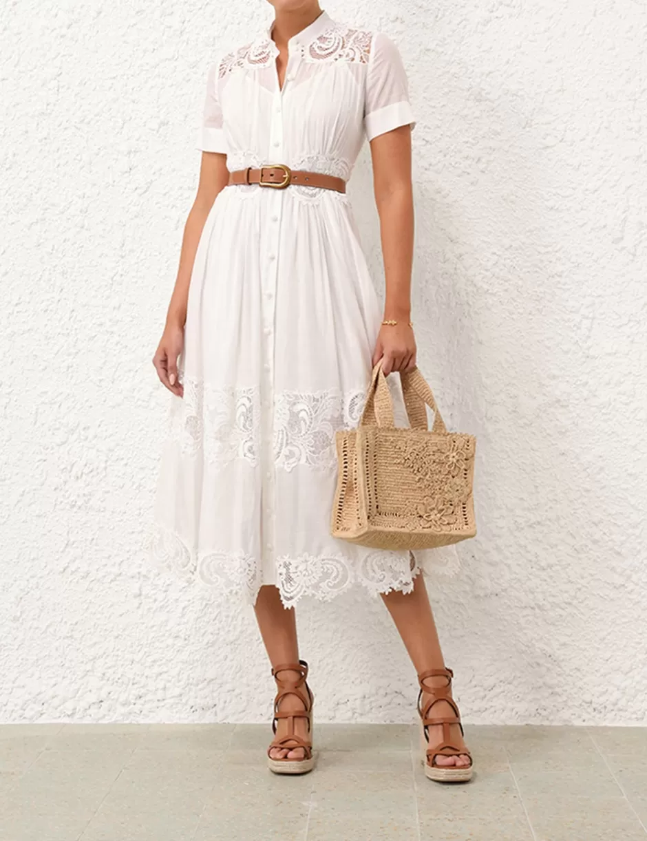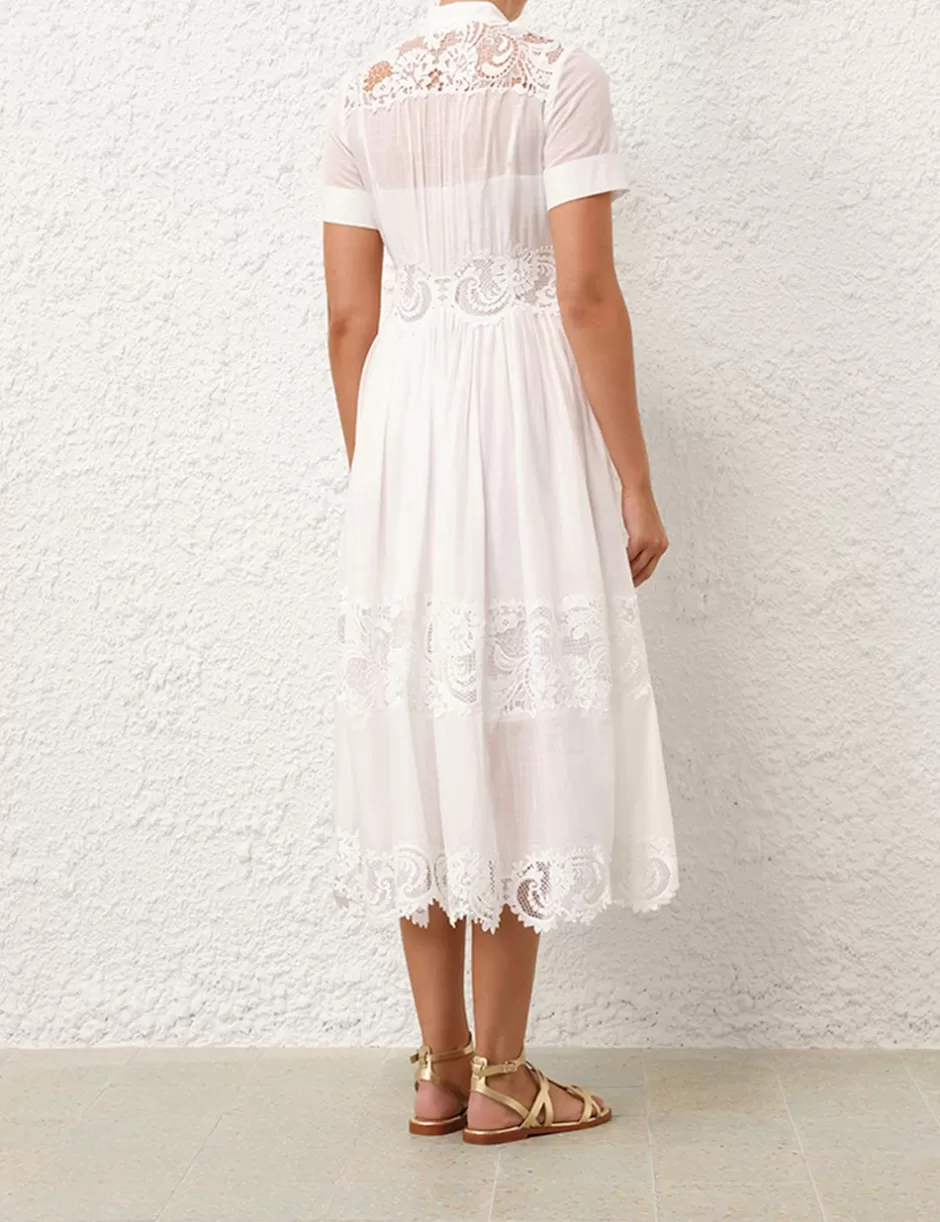 The Pop Lace Trimmed Midi Dress in Ivory from our Summer Swim 2024 Collection. A cotton midi dress featuring a stand collar, buttons down the centre front and a lace trim throughout.
