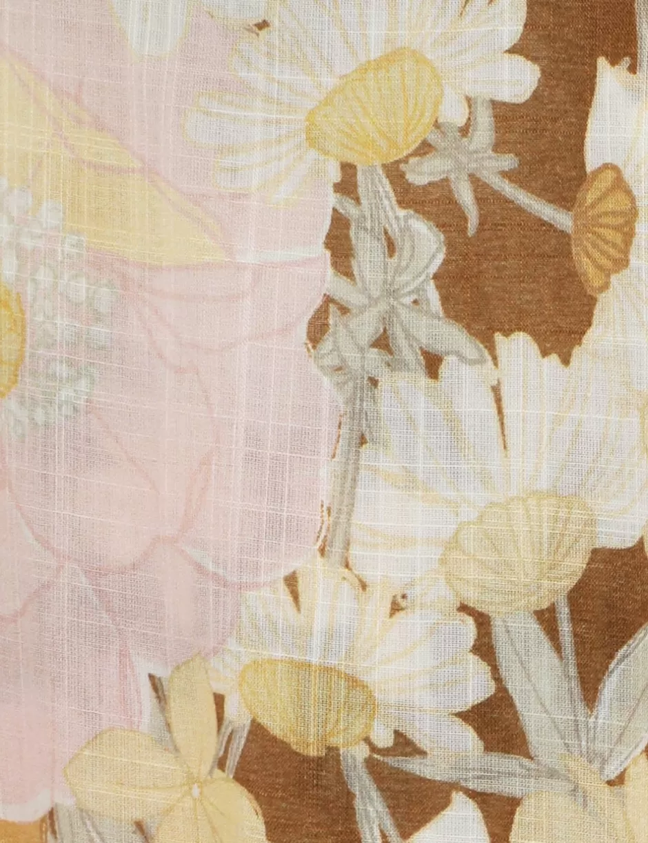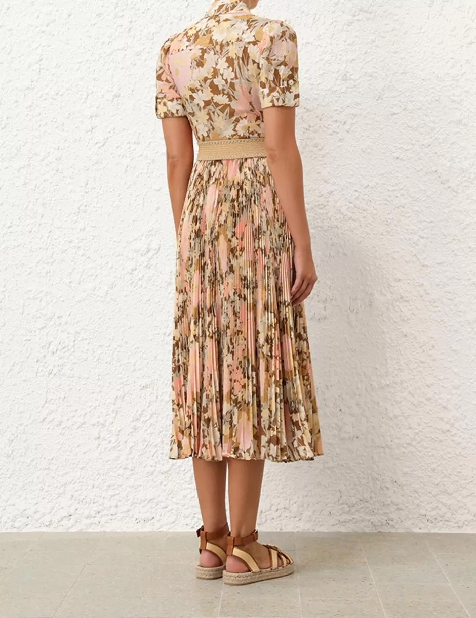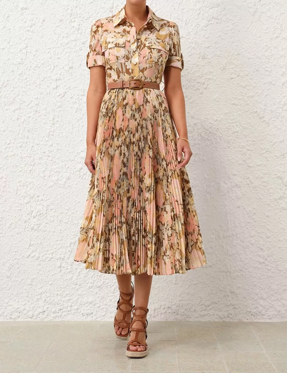 The Pop Pleated Midi Dress in Gold/Peach Floralfrom our Summer Swim 2024 Collection. A midi dress featuring a classic collar, buttons down the centre front and short cuffed sleeves, finished with front chest flap pockets.