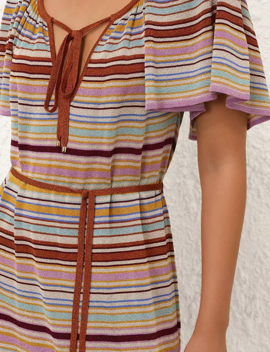 The Tallow Metallic Stripe Dress in Multi from our Resort Swim 2025 Collection. A metallic knitted midi dress featuring a square neckline, contrast stripes and flutter sleeves.