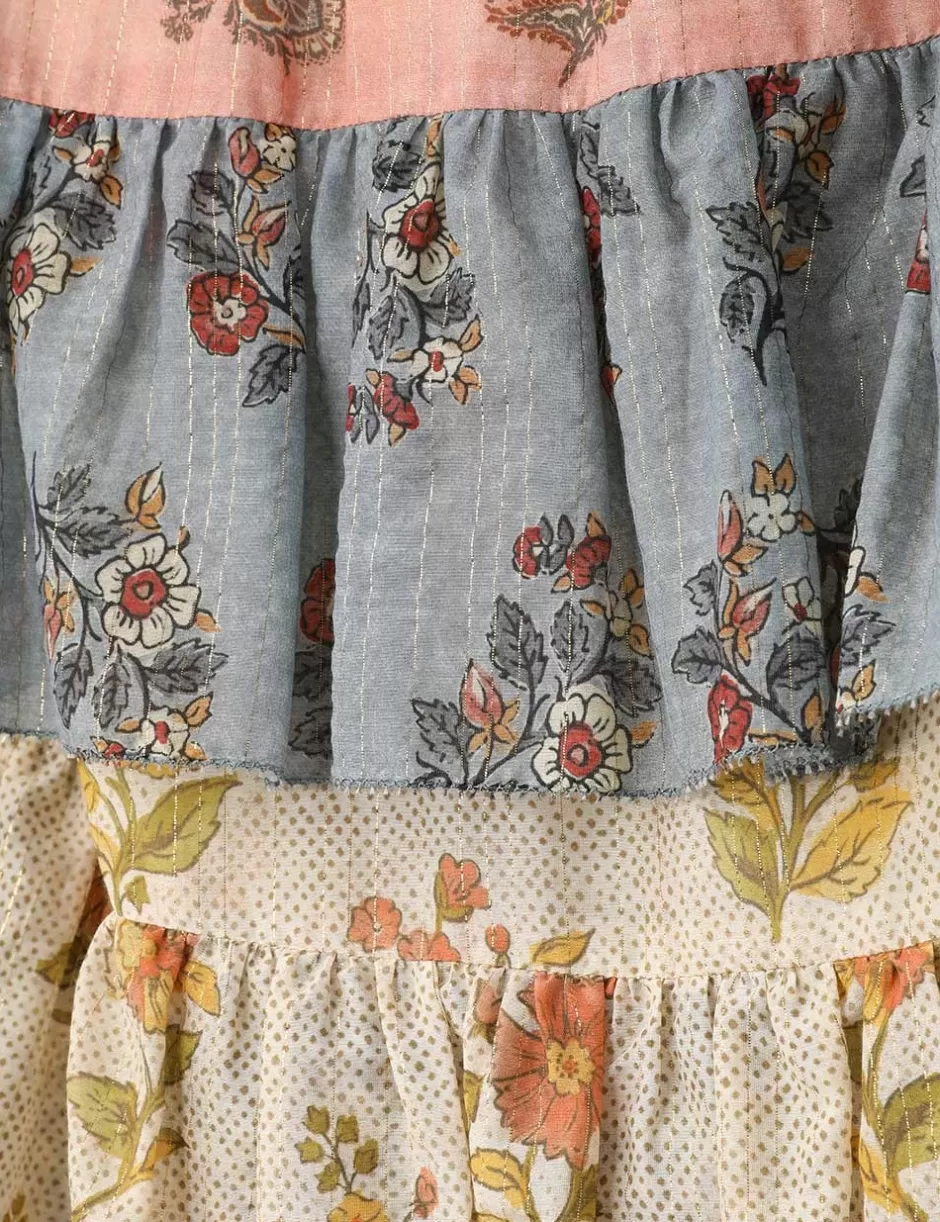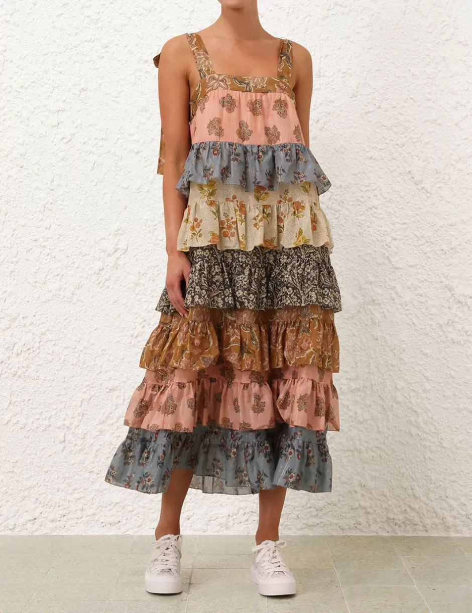 The Tallow Tiered Midi Dress in Spliced from our Resort Swim 2025 Collection. A cotton silk midi dress featuring a square neckline, self tie shoulder straps and gathered spliced tiers throughout.