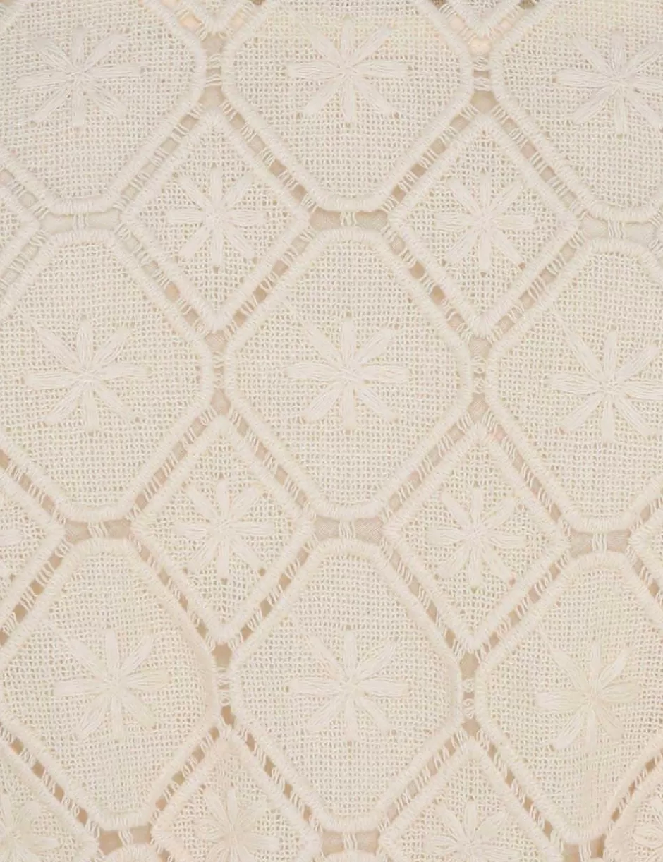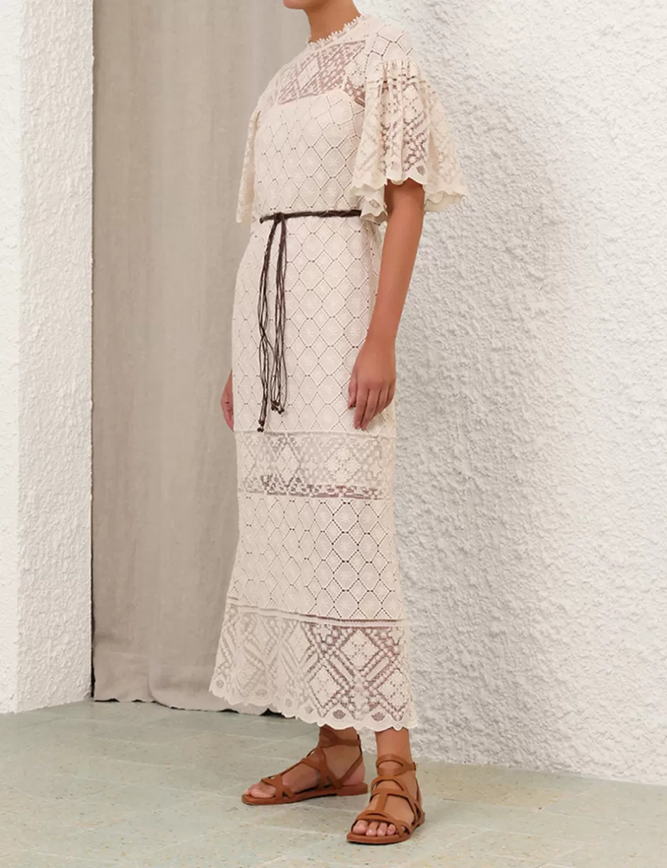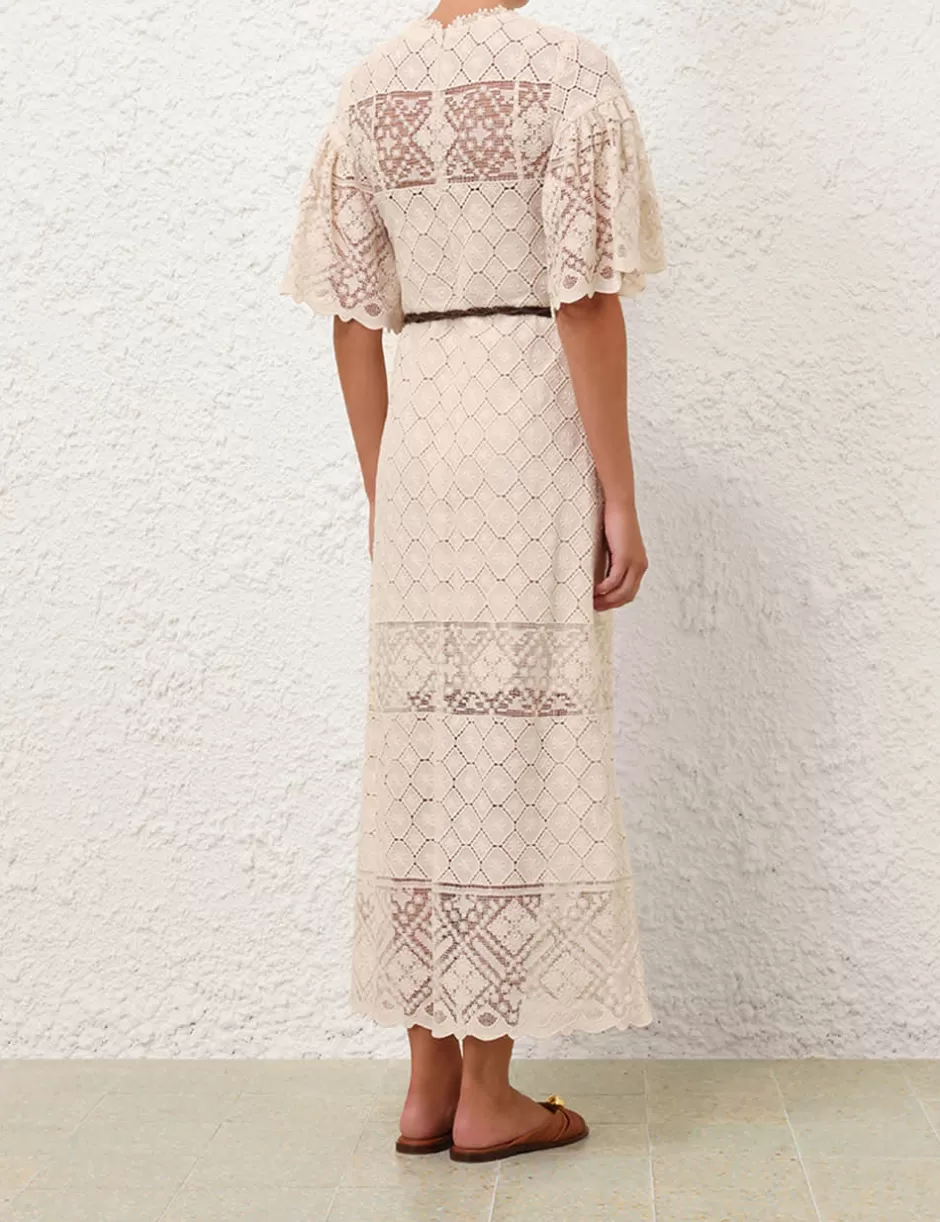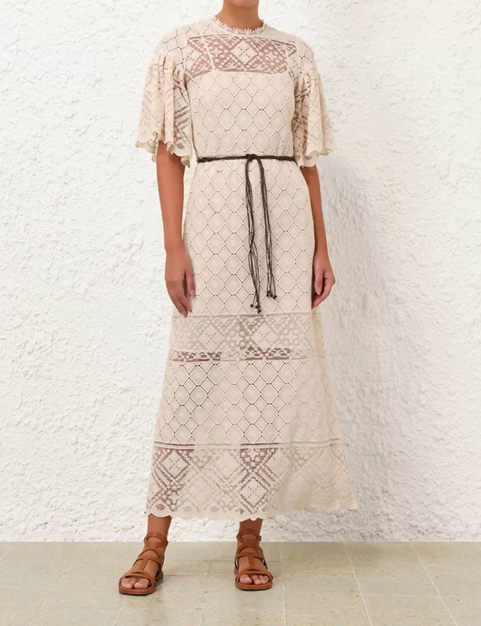 The Wylie Crochet Midi Dress in Tea from our Resort Swim 2025 Collection. A cotton crochet midi dress featuring lace panels, scallop trims, gathered sleeve and a removable belt.