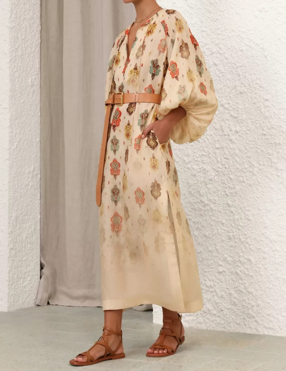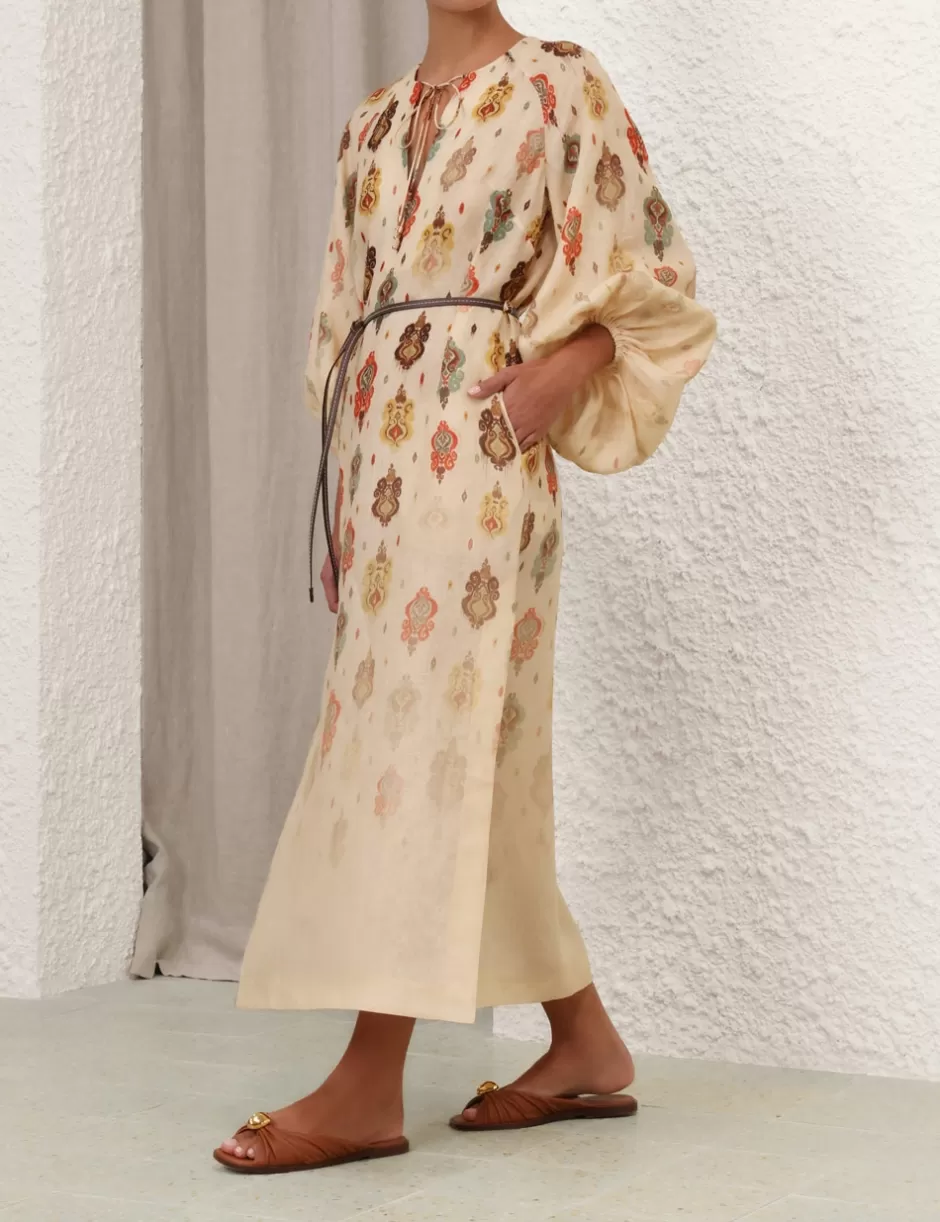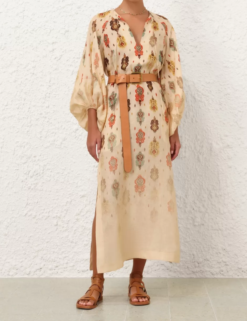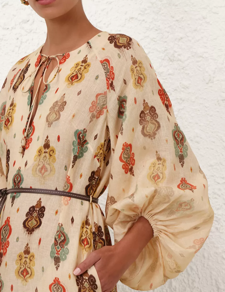 The Wylie Midi Dress in Tan Ikat from our Resort Swim 2025 Collection. A linen long sleeve midi dress featuring self tie V-neckline, side splits and elasticated raglan sleeves.