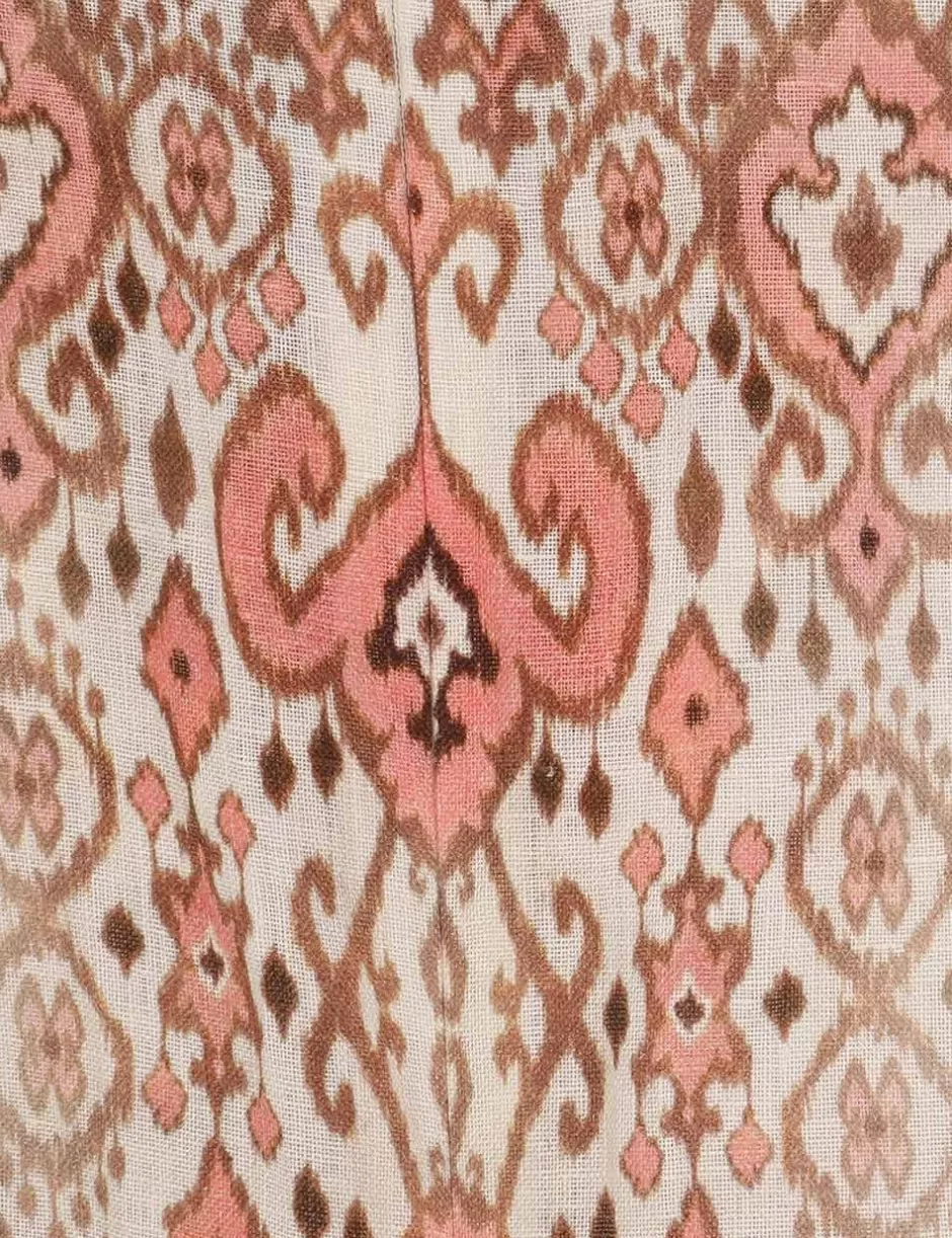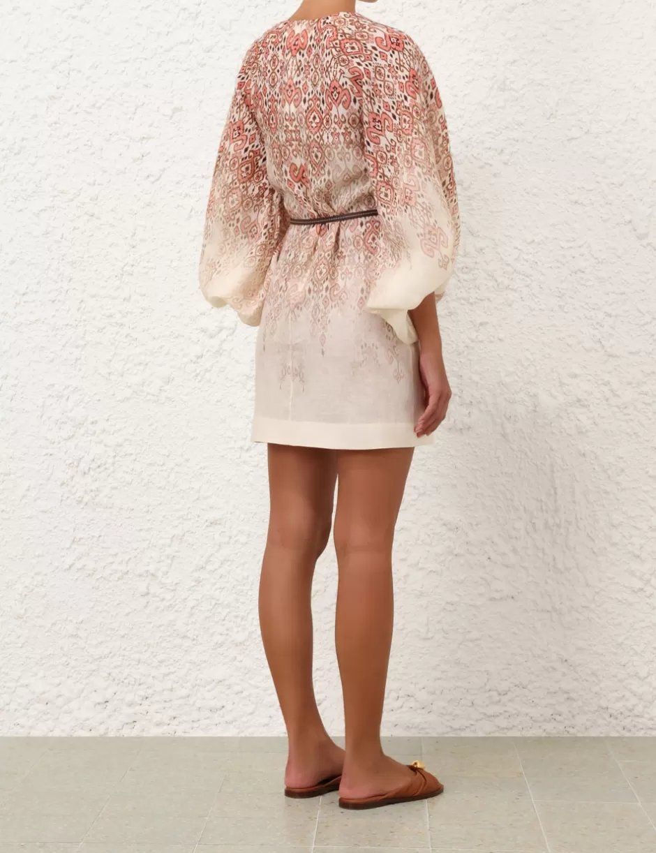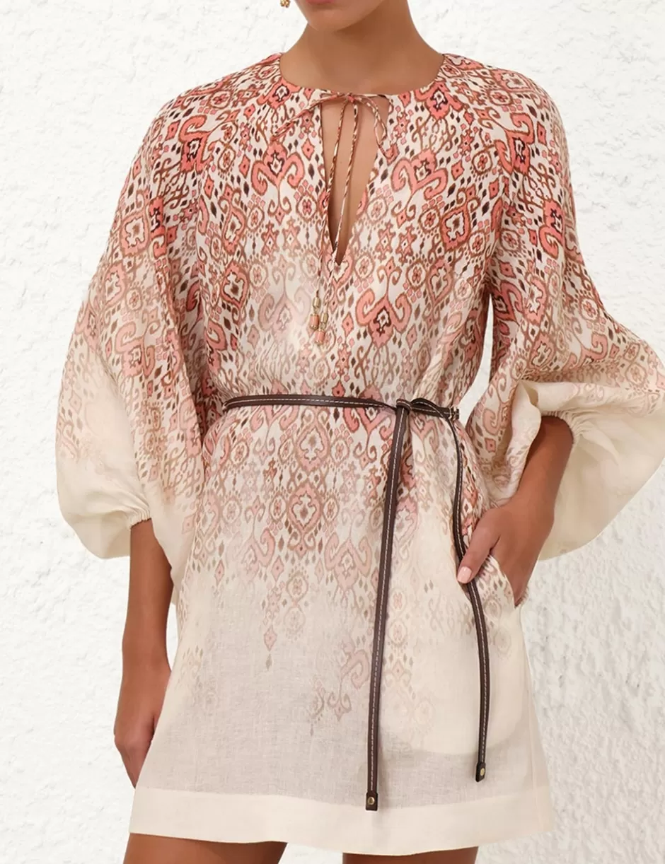 The Wylie Mini Dress in Peach Ikat from our Resort Swim 2025 Collection. A linen long sleeve mini dress featuring self tie V-neckline and elasticated raglan sleeves.