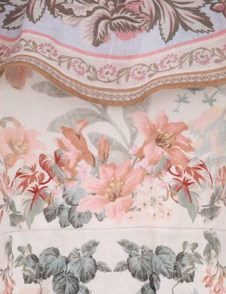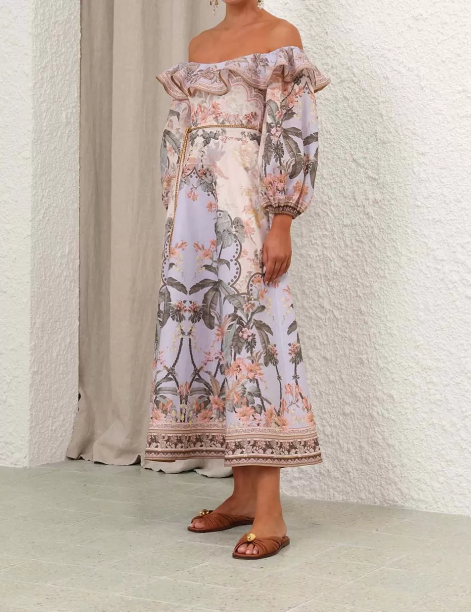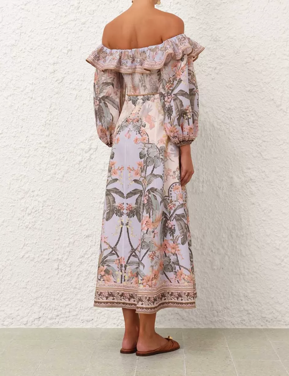 The Wylie Off-Shoulder Midi Dress in Blue Floral from our Resort Swim 2025 Collection. A linen off-shoulder midi dress featuring bodice ruffles, long sleeves with elasticated cuffs and a shirred back panel with a centre back invisible zip closure.