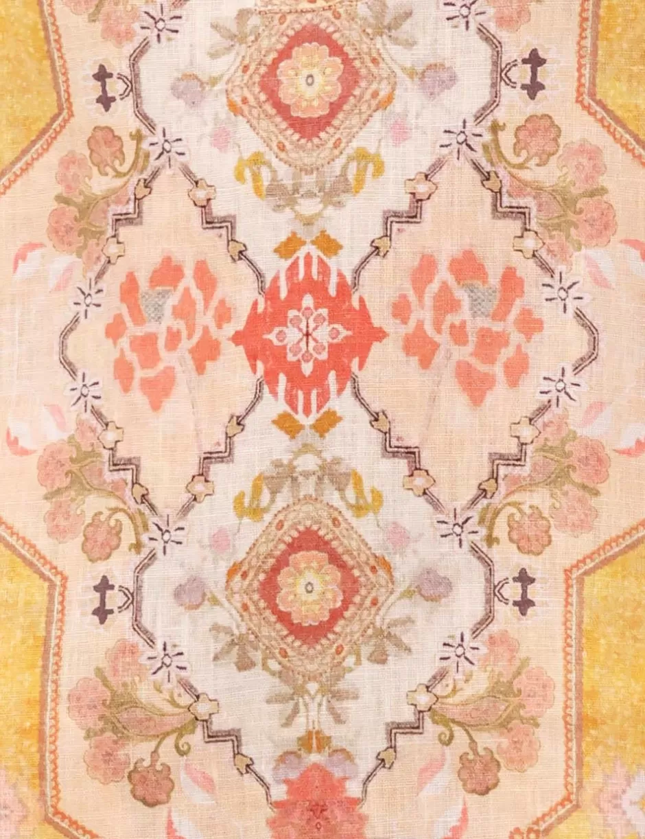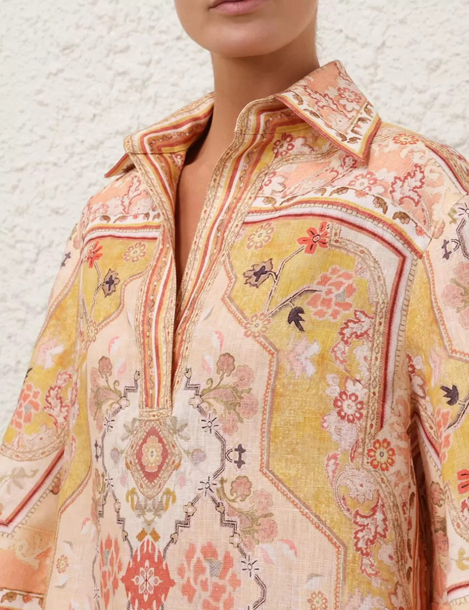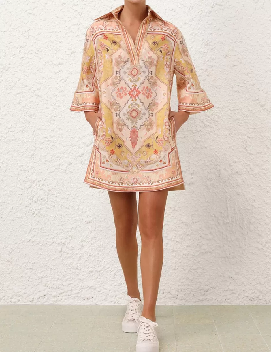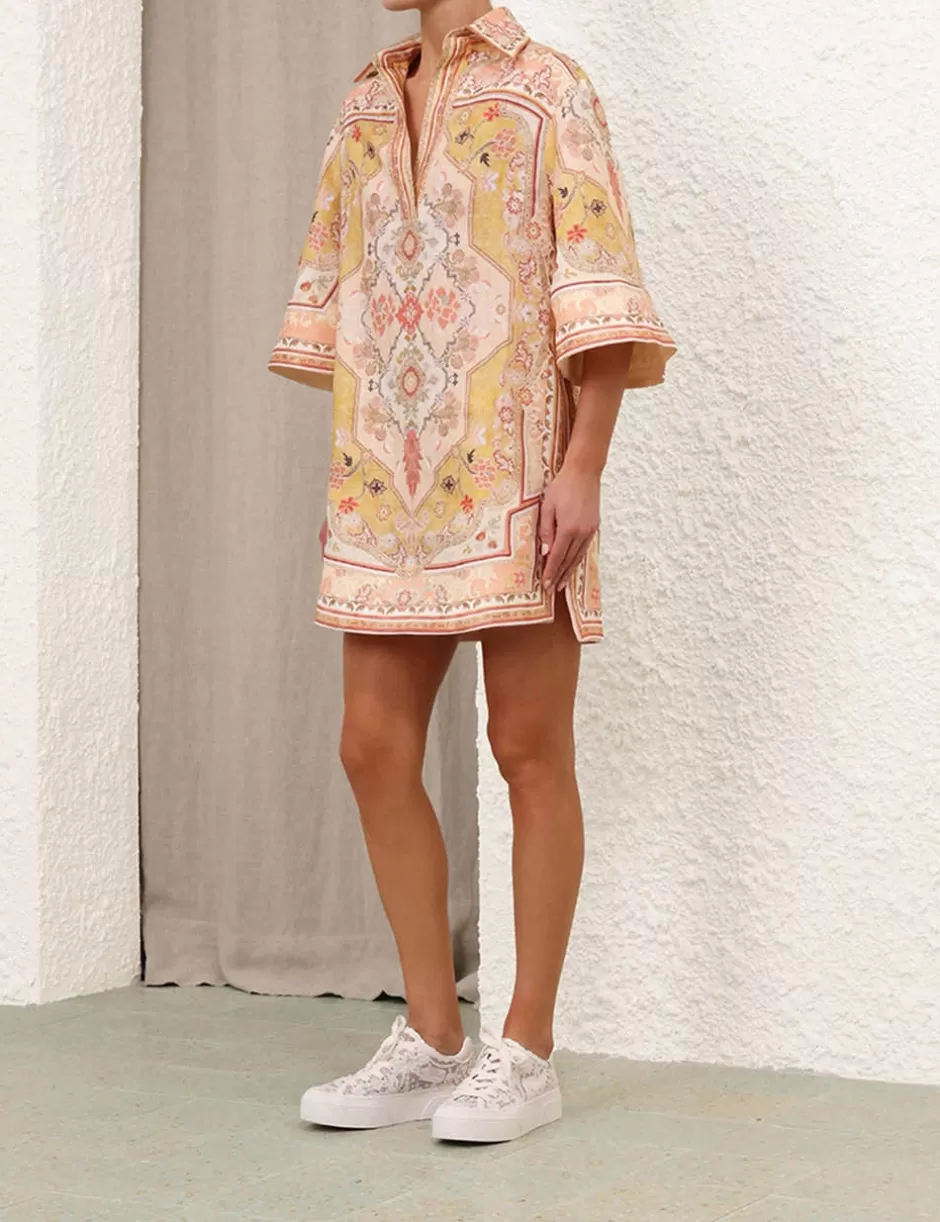 The Wylie Tunic Dress in Mustard Multi from our Resort Swim 2025 Collection. A linen tunic mini dress featuring wide sleeves, a concealed front centre placket and placement print throughout.