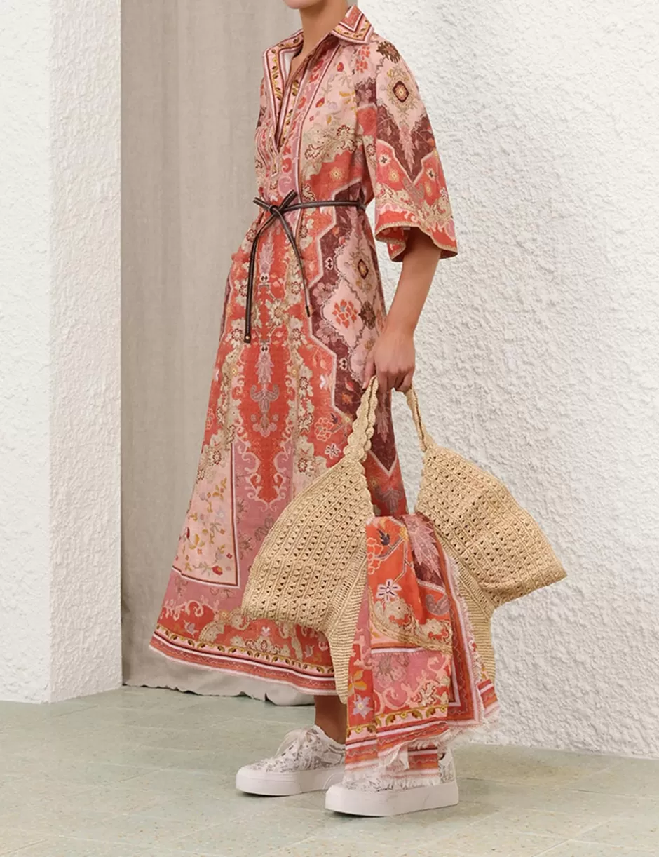 The Wylie Tunic Midi Dress in Rust Multi from our Resort Swim 2025 Collection. A linen tunic midi dress featuring a deep V-neckline, wide sleeves and placement print throughout.