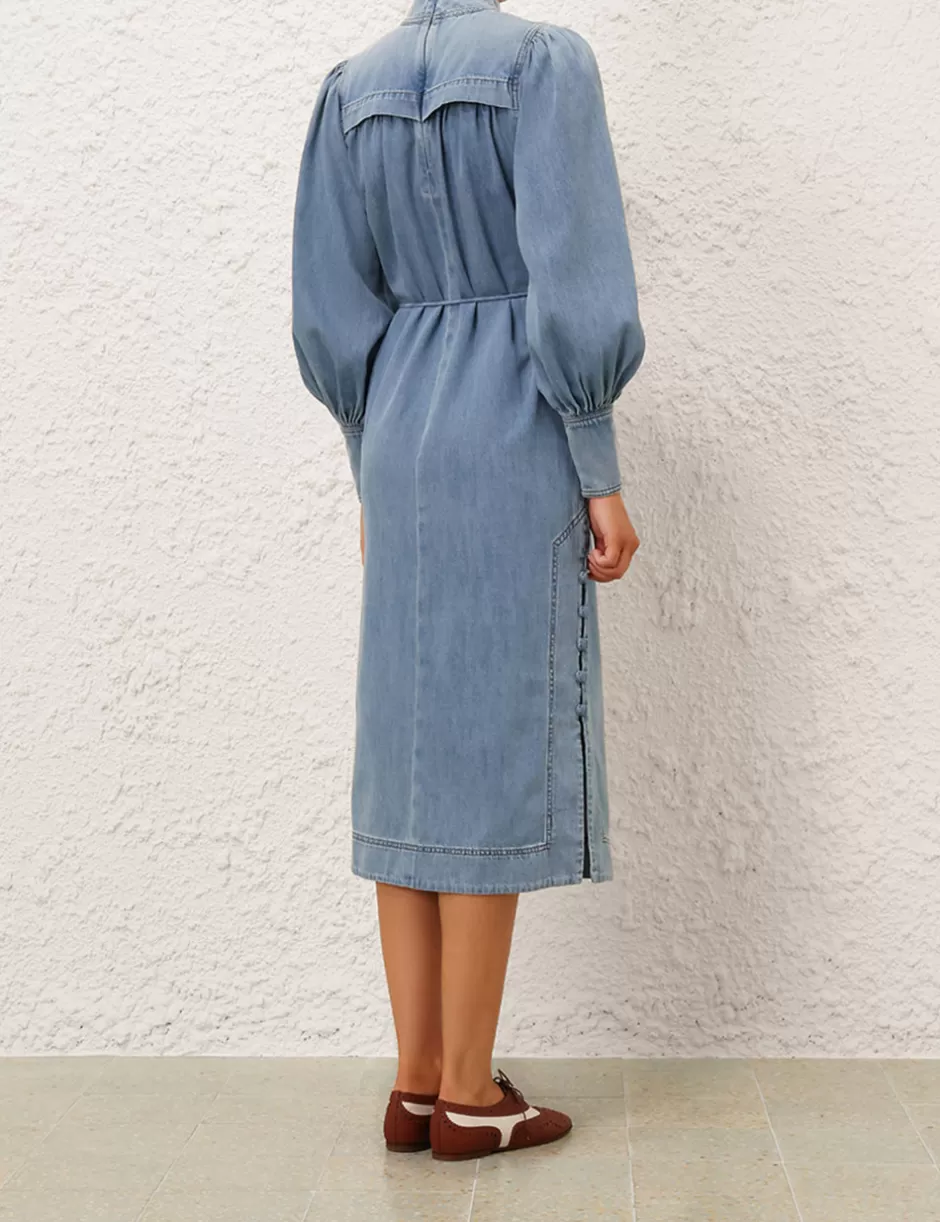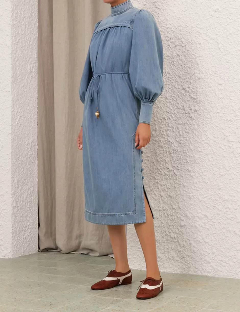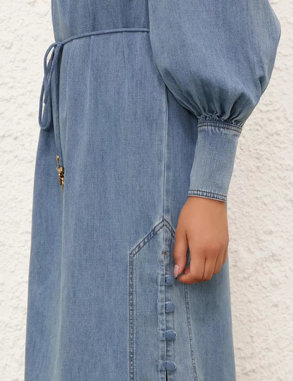 The Crush Denim Midi Dress in Blue Moon from our Resort 2025 Collection, Crush. A denim midi dress featuring long gathered sleeves with elongated cuffs and zips, a stand collar and a centre back zip closure; finished with buttons down the sides of the skirt.