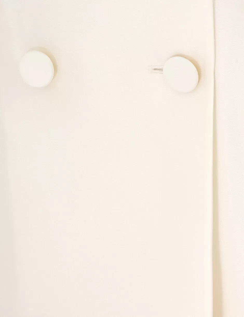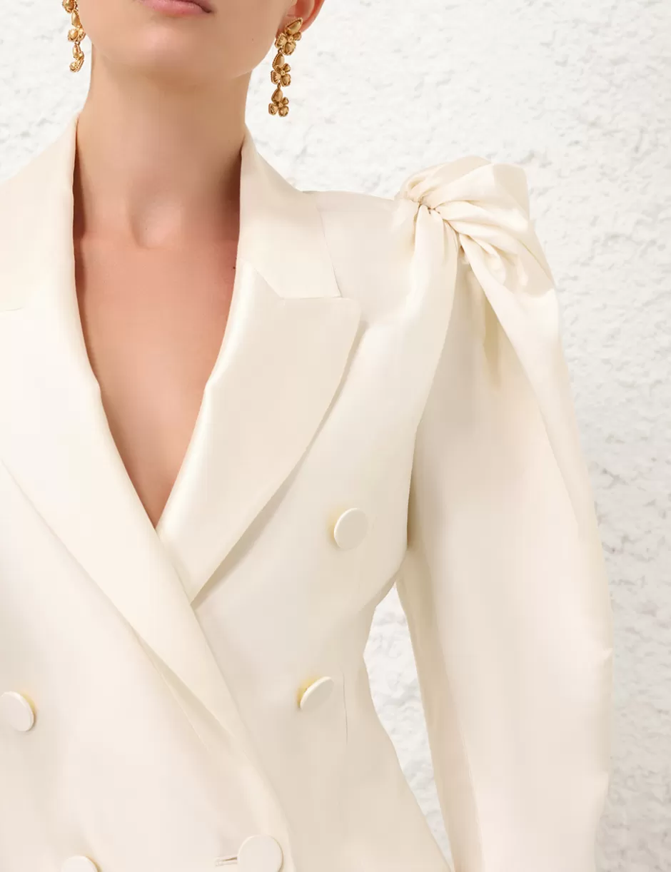 The Crush Double Breasted Mini in Cream from our Resort 2025 Collection, Crush. A silk wool double breasted mini dress featuring a plunging V-neckline, front pockets and long sleeves with heavily gathered shoulders.