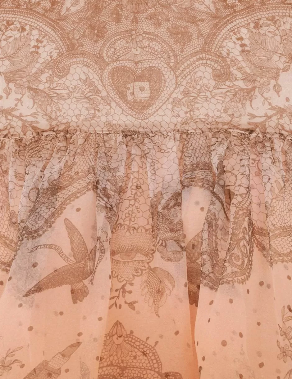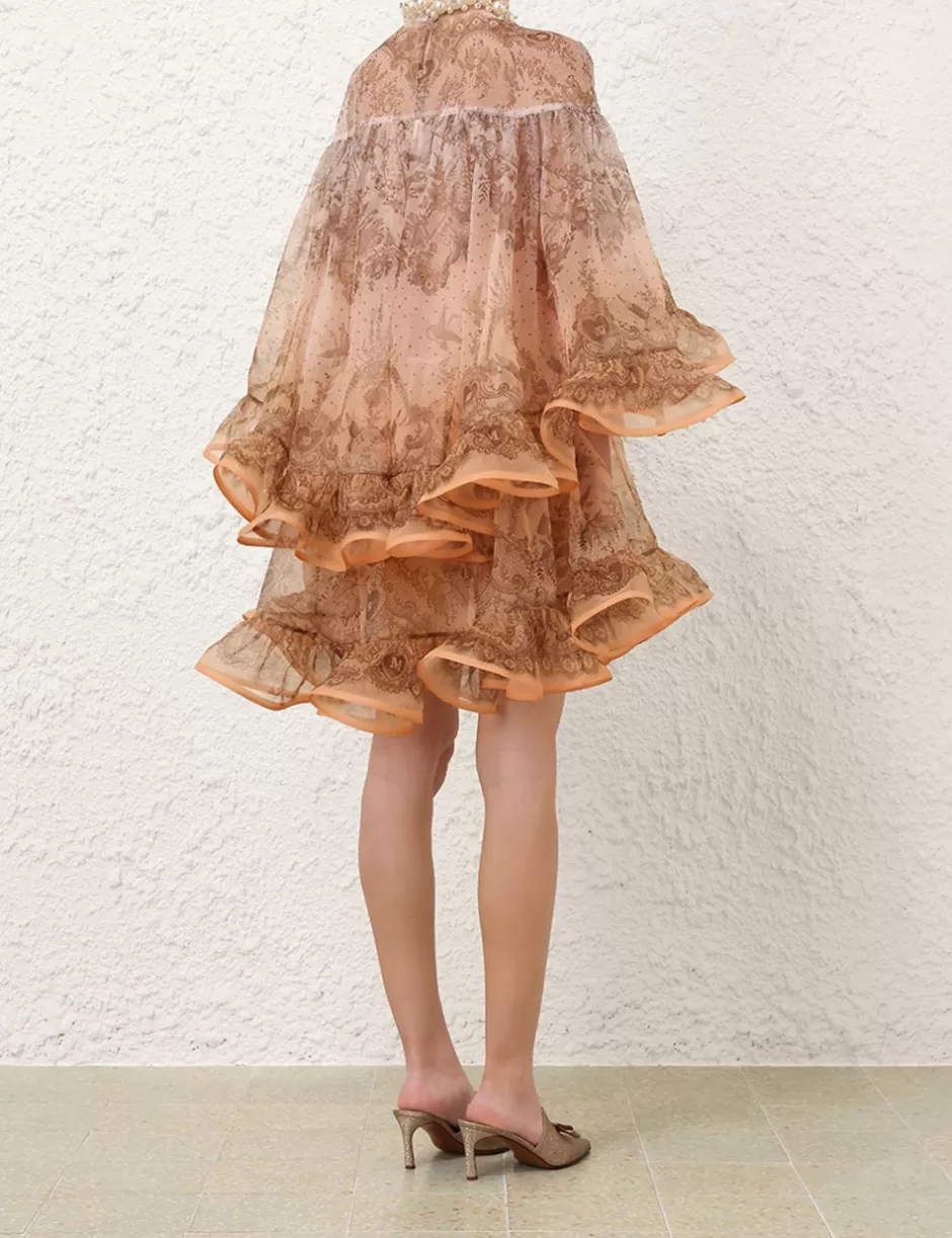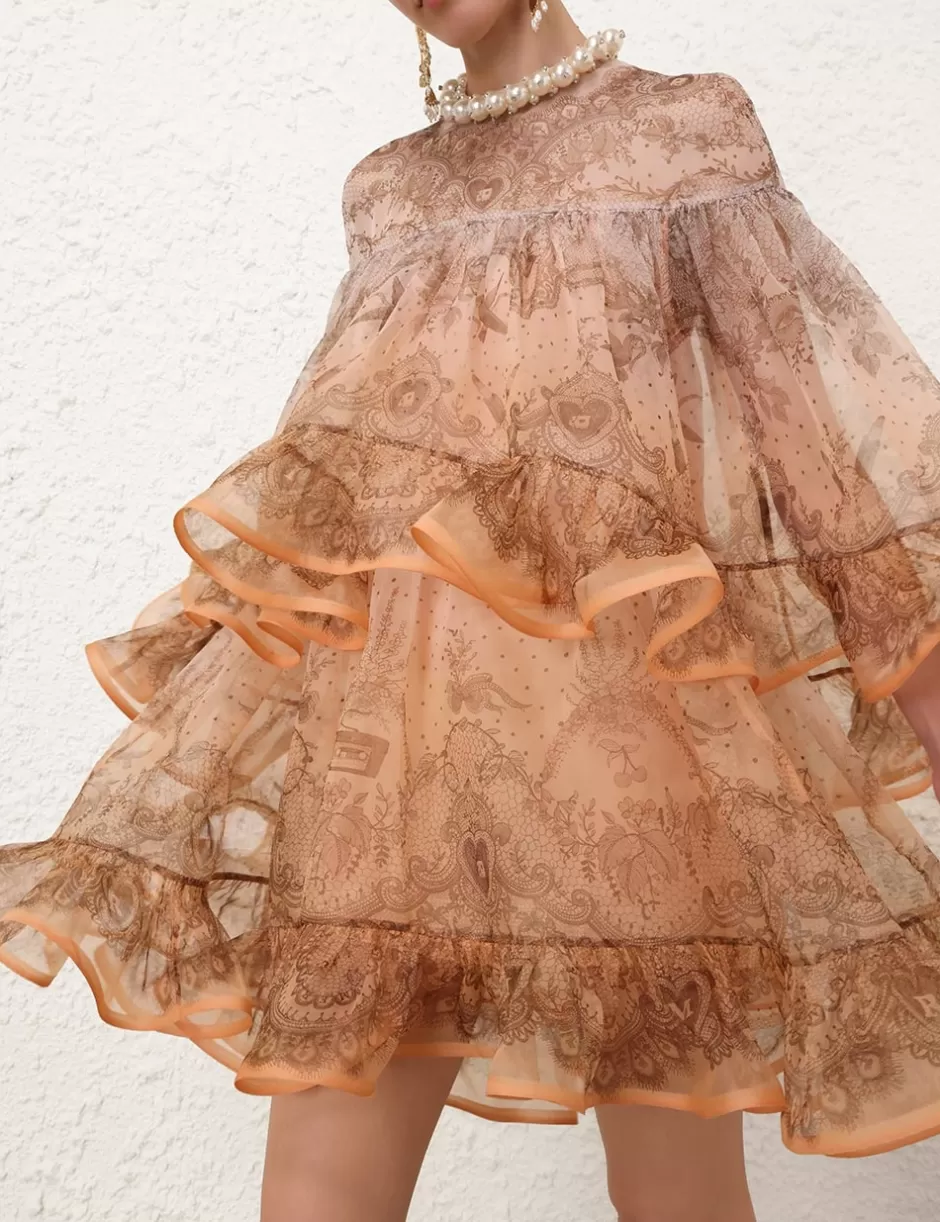 The Crush Embellished Mini Dress in Peach Lace Print from our Resort 2025 Collection, Crush. A silk organza mini dress featuring pearl and crystal detailing at the neckline, a placement print and heavy frill detailing throughout; finished with a contrast hemline of frills.