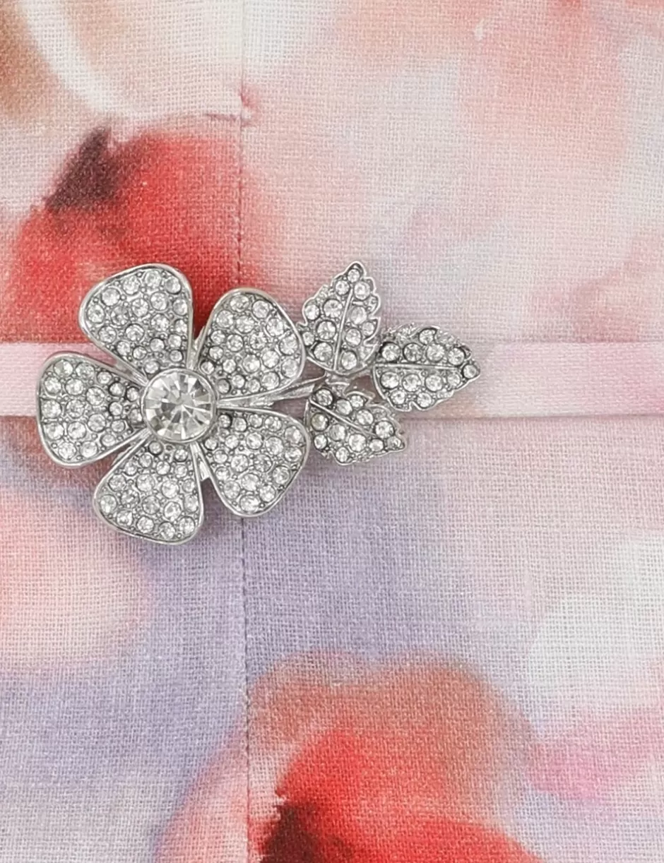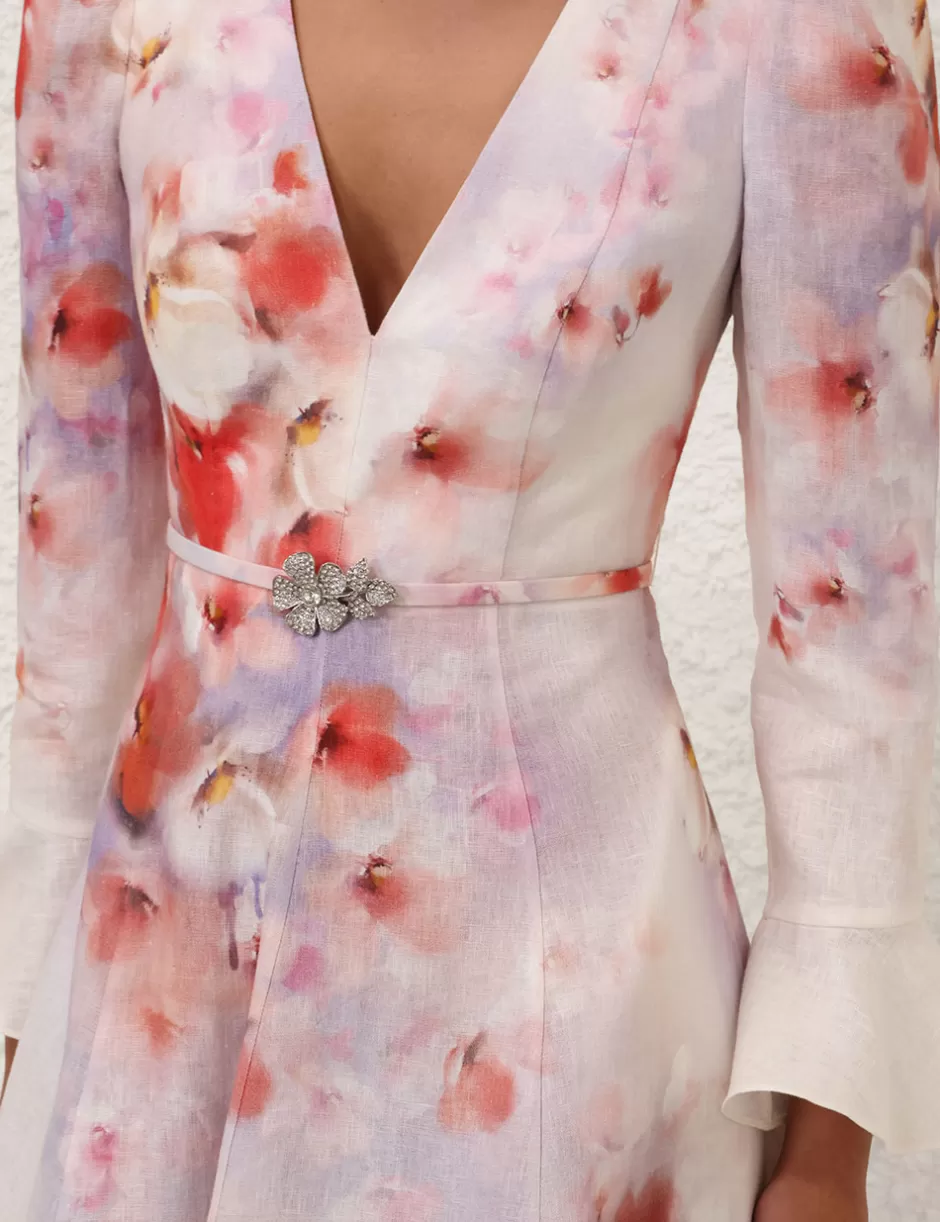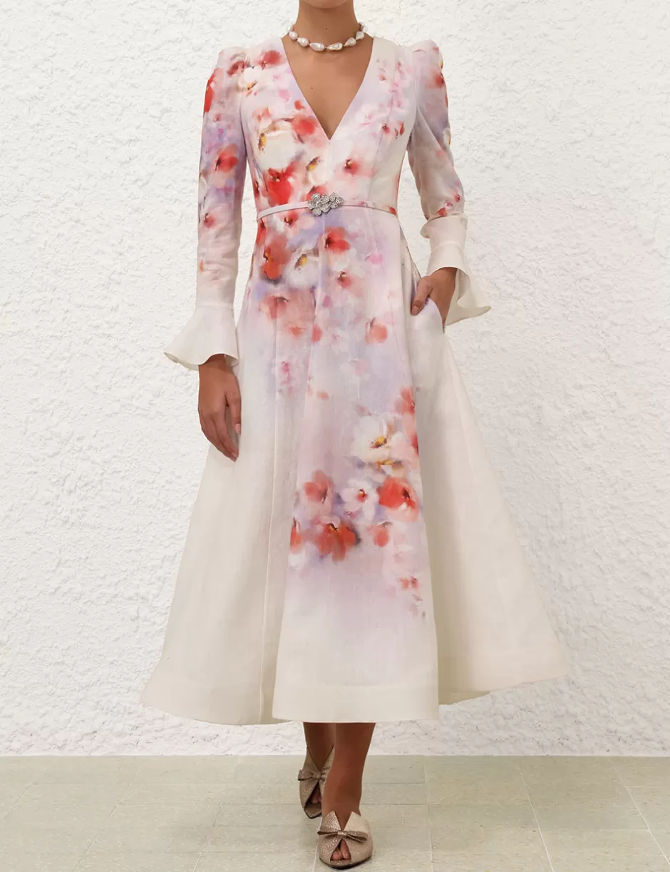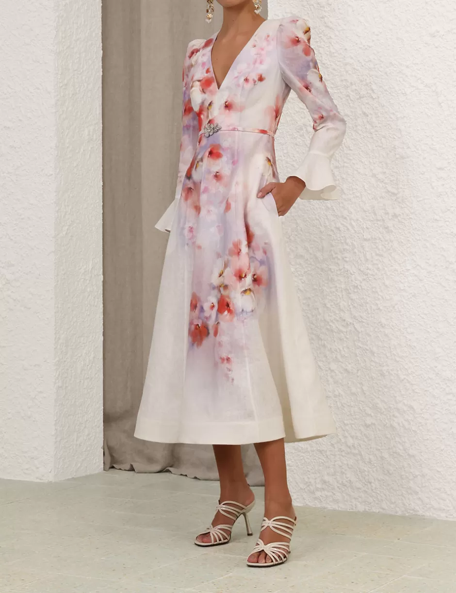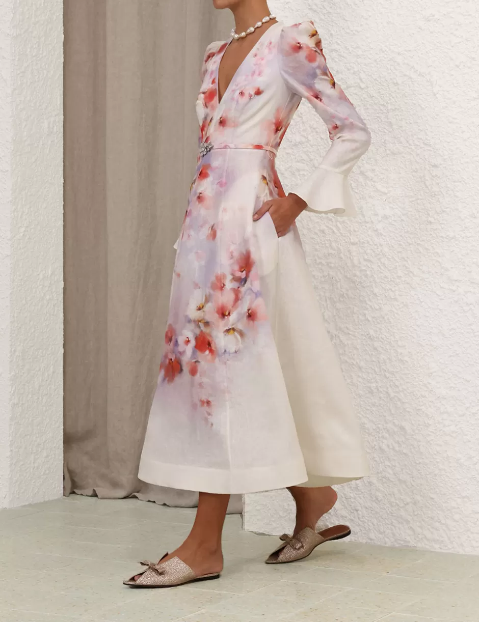 The Crush Frill Sleeved Midi Dress in Scarlet Floral from our Resort 2025 Collection, Crush. A linen midi dress featuring a plunging V-neckline, a full skirt and tulle inserted sleeve heads with fluted cuffs.