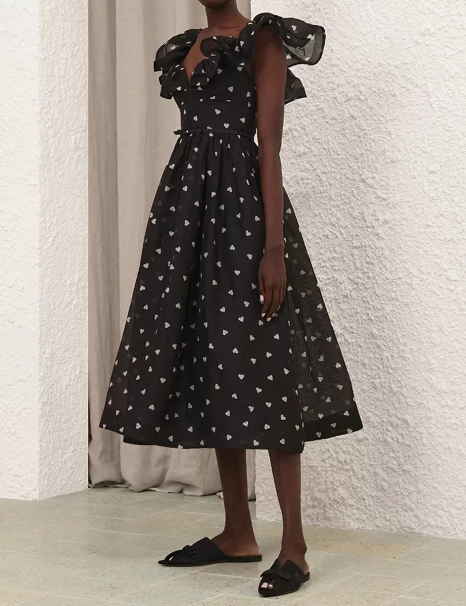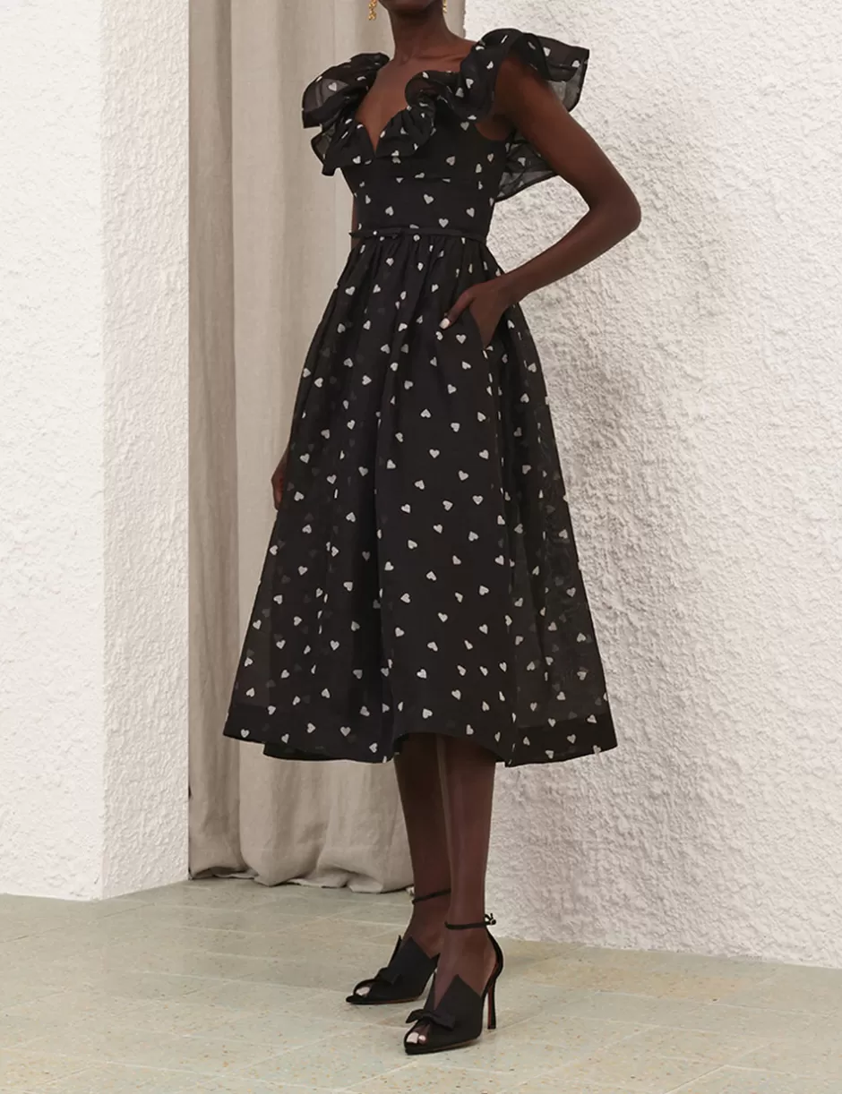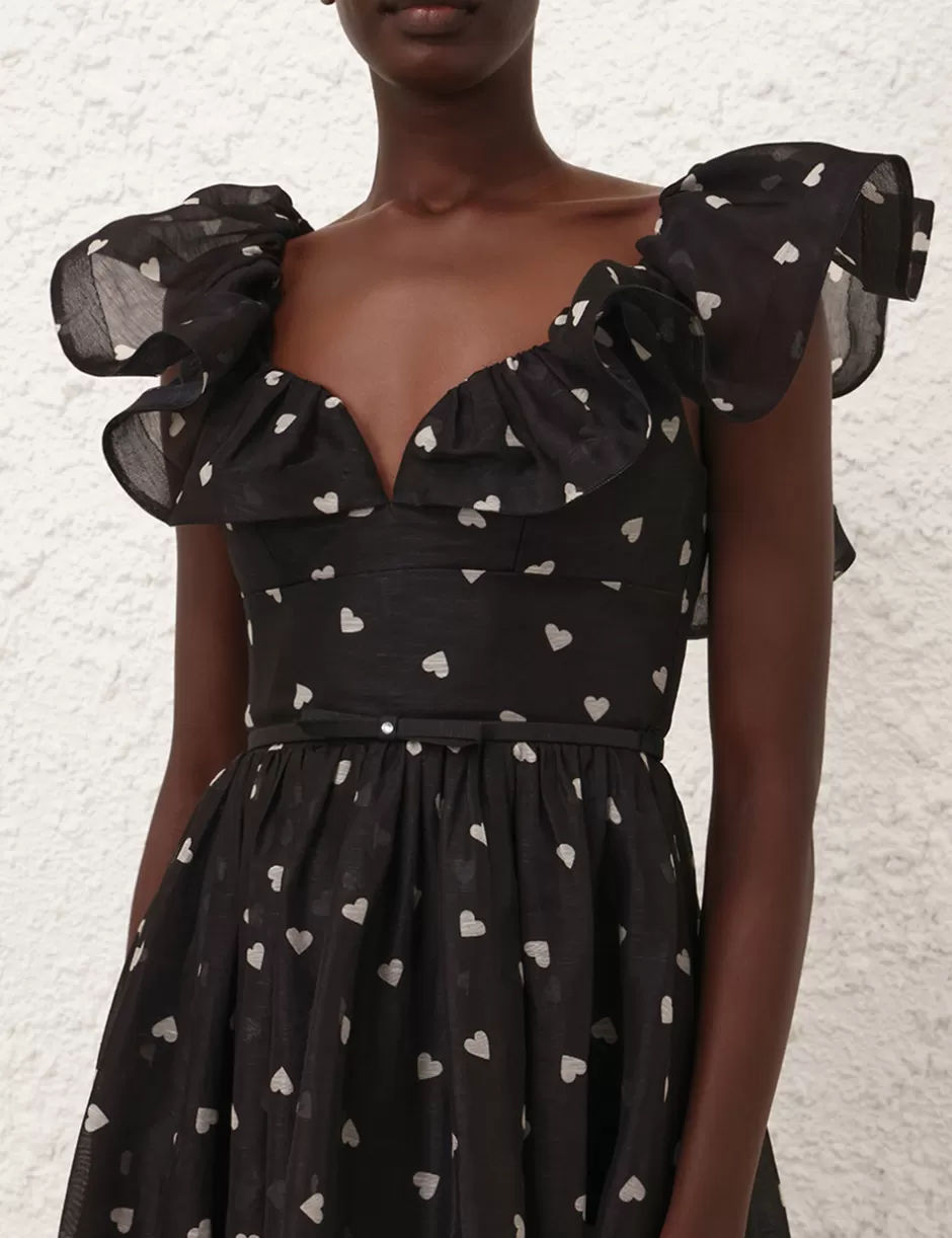 The Crush Frilled Midi Dress in Black Hearts from our Resort 2025 Collection, Crush. A silk linen mini dress featuring a sweetheart neckline with a plunging V-wire, frills on the shoulders, and a removable bow belt, finished with a full skirt.