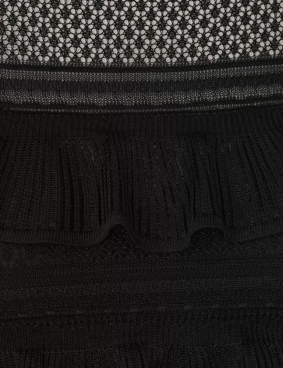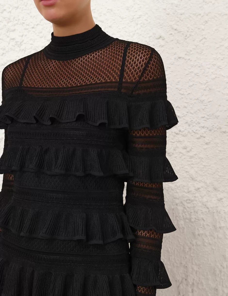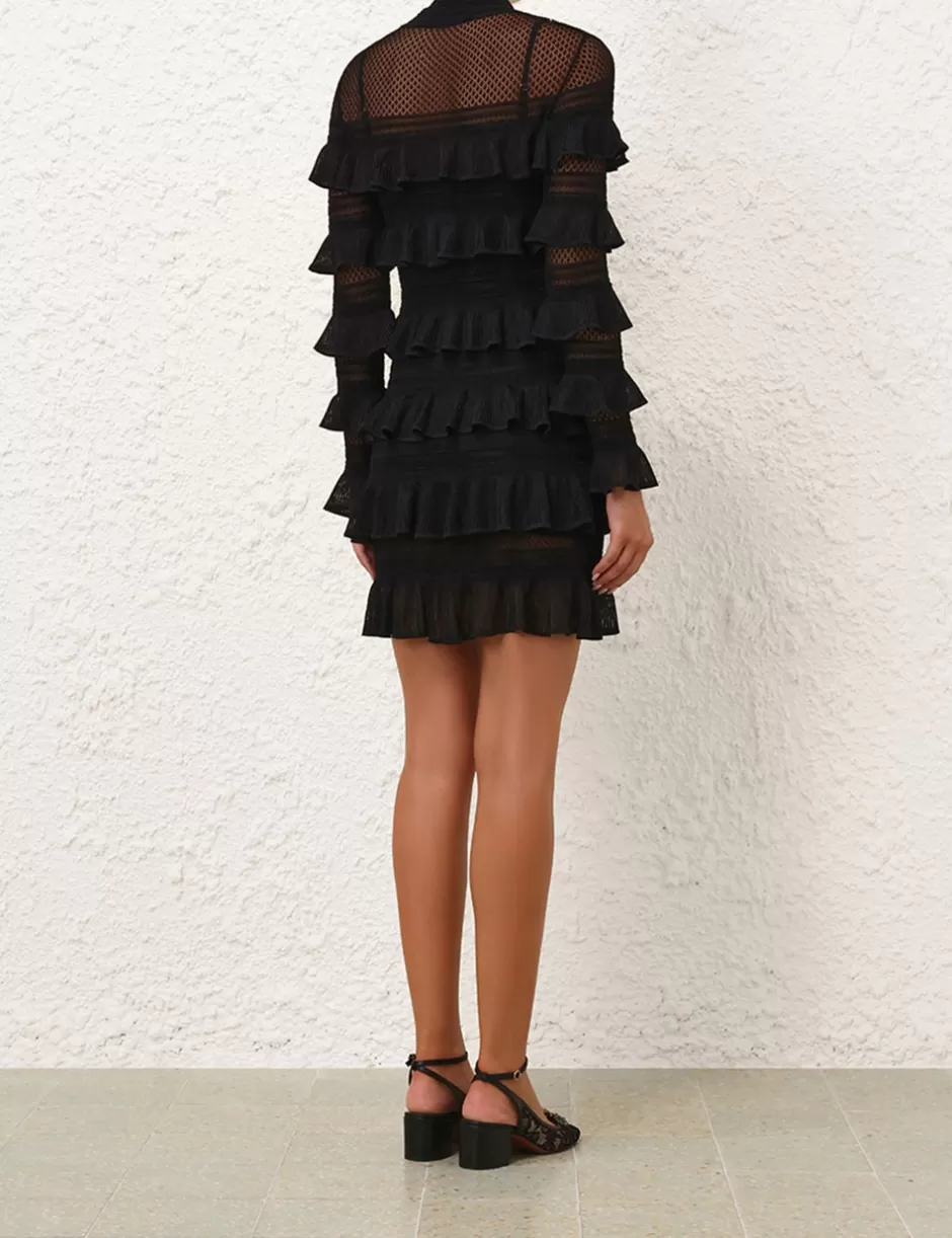 The Crush High Neck Frilled Mini in Black from our Resort 2025 Collection, Crush. A knit mini dress featuring long sleeves and a high neck; finished with ruffles throughout.