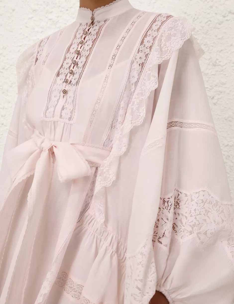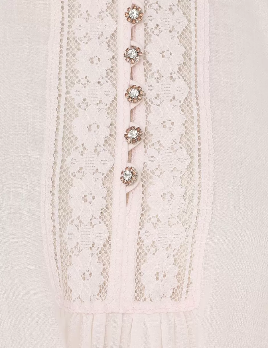 The Crush Lace Billow Mini Dress in Shell from our Resort 2025 Collection, Crush. A ramie mini dress featuring a stand collar with lace trims around the neckline, buttons down the front placket, exaggerated blouson sleeves and a removable self tie waist.
