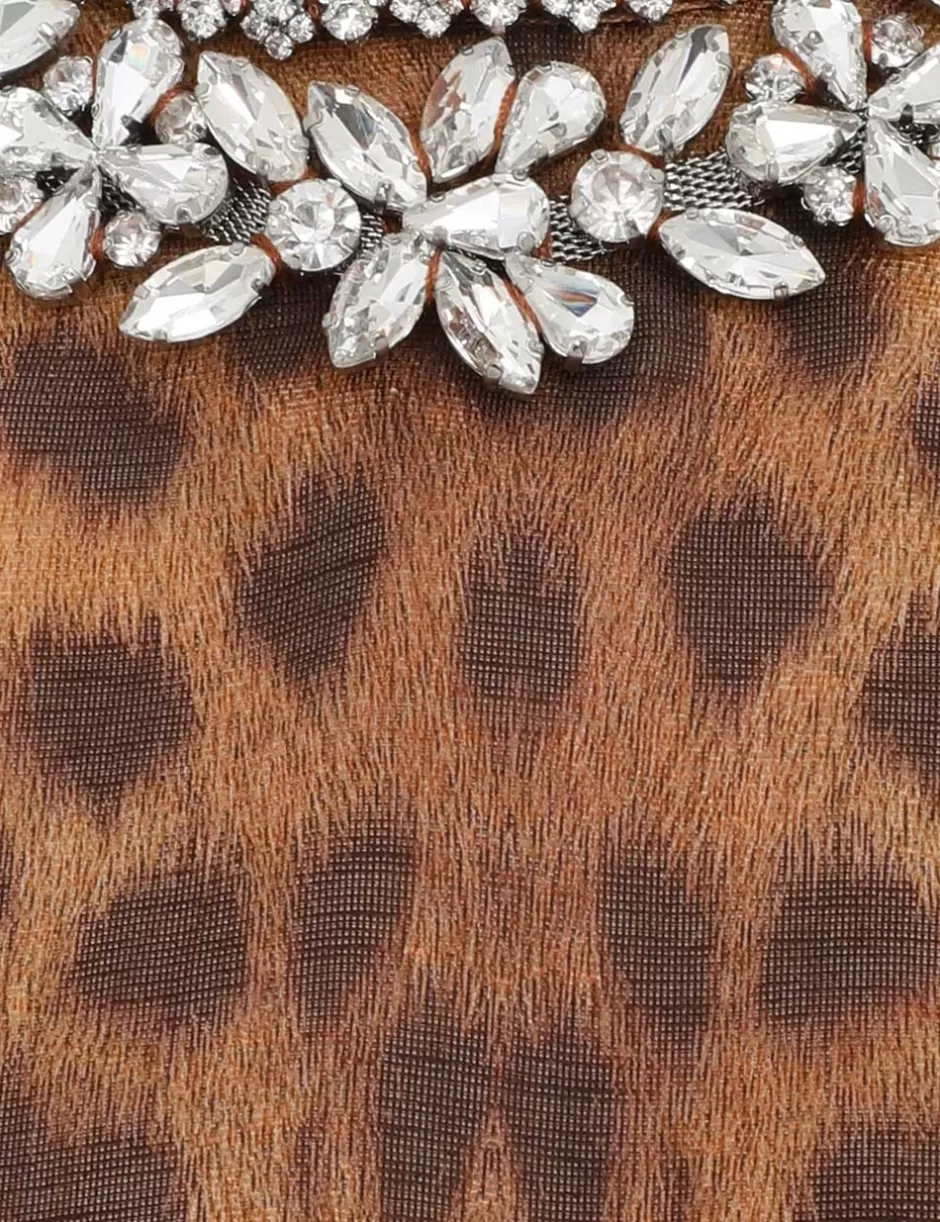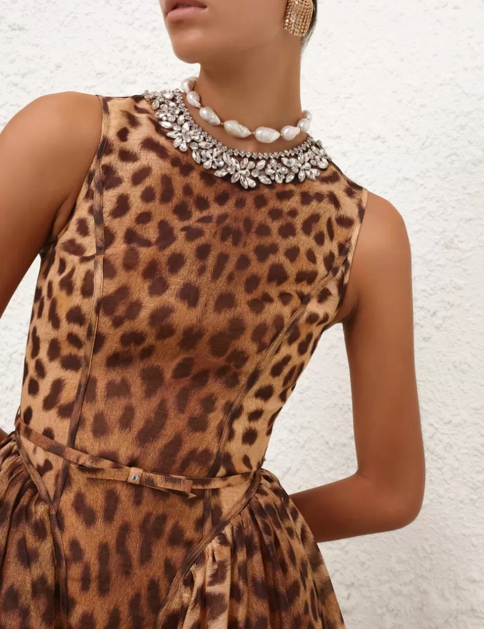 The Crush Panelled Mini Dress in Leopard from our Resort 2025 Collection, Crush. A silk linen mini dress featuring a crew neckline with a thick crystal trim, a centre back invisible zip and a gathered skirt.