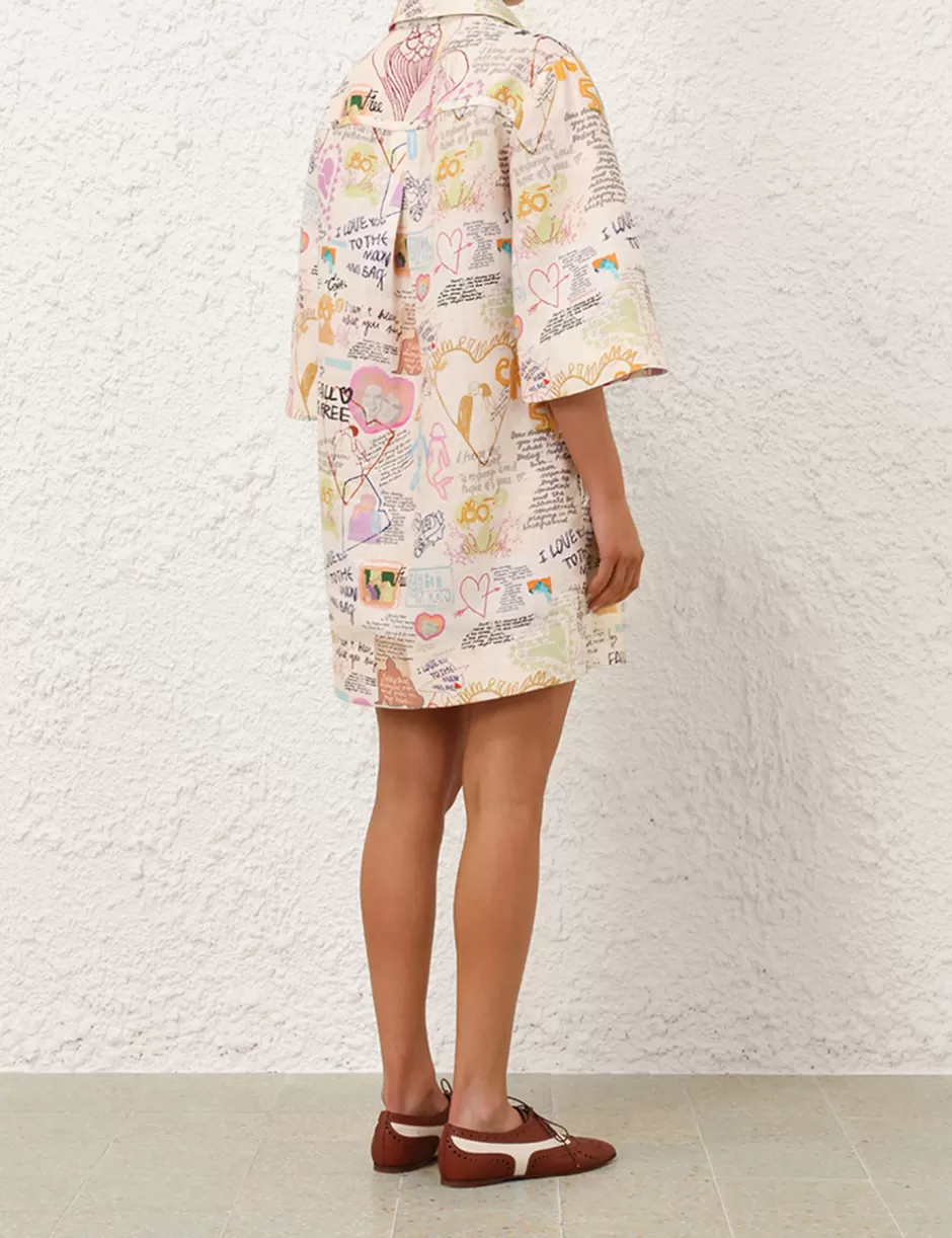 The Crush Tunic Dress in Dear Diary from our Resort 2025 Collection, Crush. A linen tunic dress featuring a classic collar with crystal buttons down the front placket, short wide sleeves and side seam pockets.
