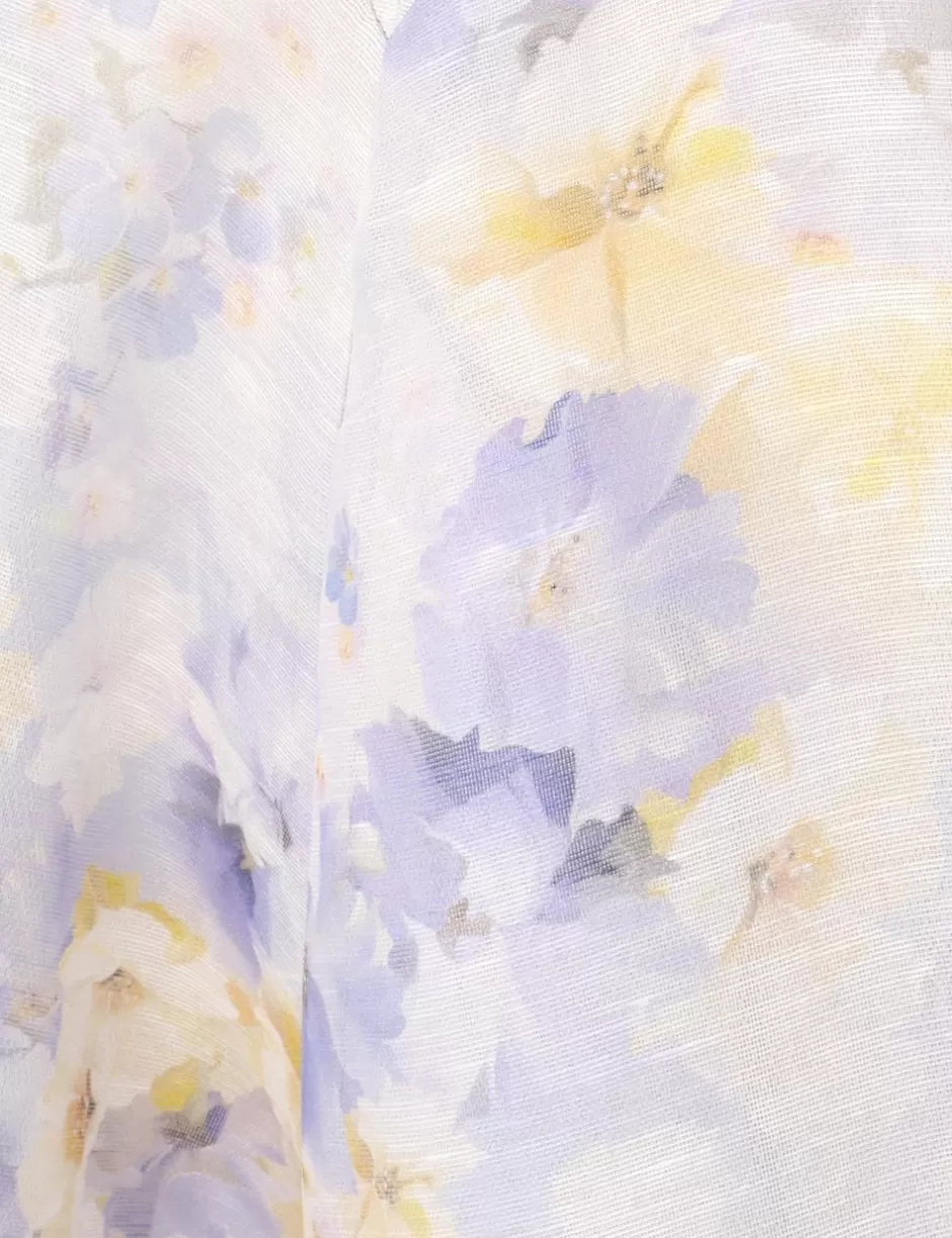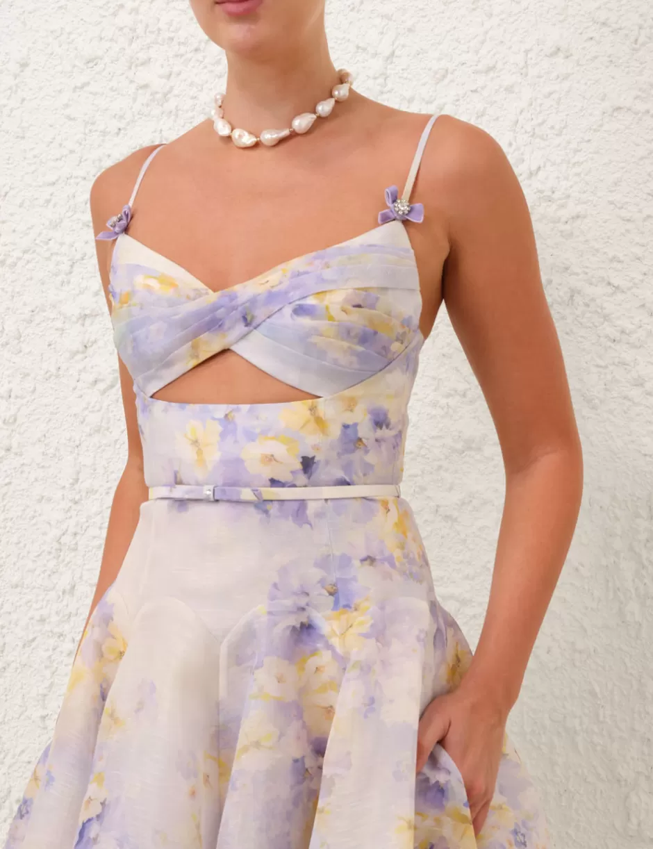 The Crush Twist Front Midi Dress in Lilac Floral from our Resort 2025 Collection, Crush. A silk linen midi dress featuring a criss-cross pleat on the bodice, adjustable straps and boning along the front, side and back seam.