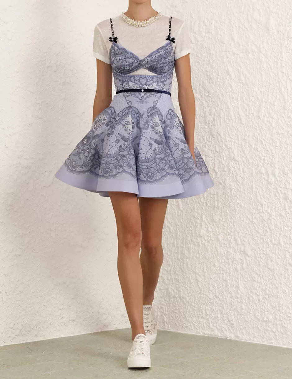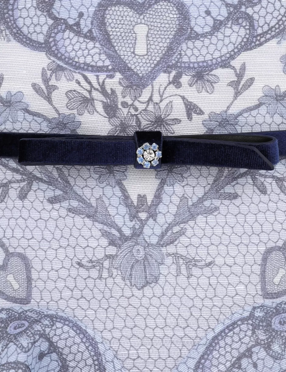 The Crush Twist Front Mini Dress in Blue Lace Print from our Resort 2025 Collection, Crush. A silk linen organza mini dress featuring a twisted detailing at the centre bust with a cutout underneath, adjustable velvet straps with crystals and bow detailing and side seam pockets.