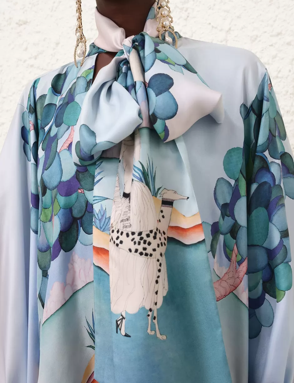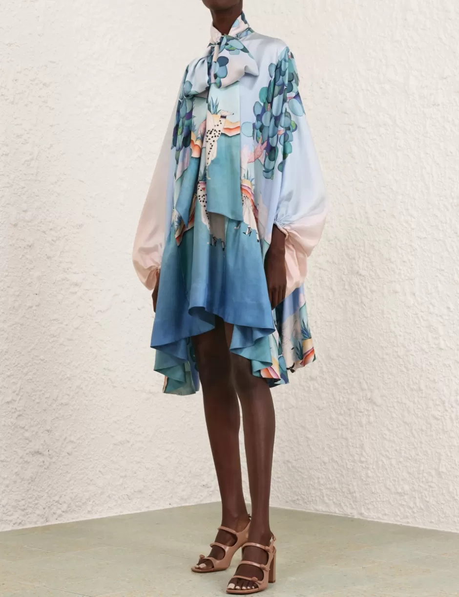 The Eden Billow Mini Dress in Madame Jade from our Fall 2024 Collection, In Illustration. A silk mini dress featuring a V-neckline, adjustable self tie collar and exaggerated blouson sleeves.