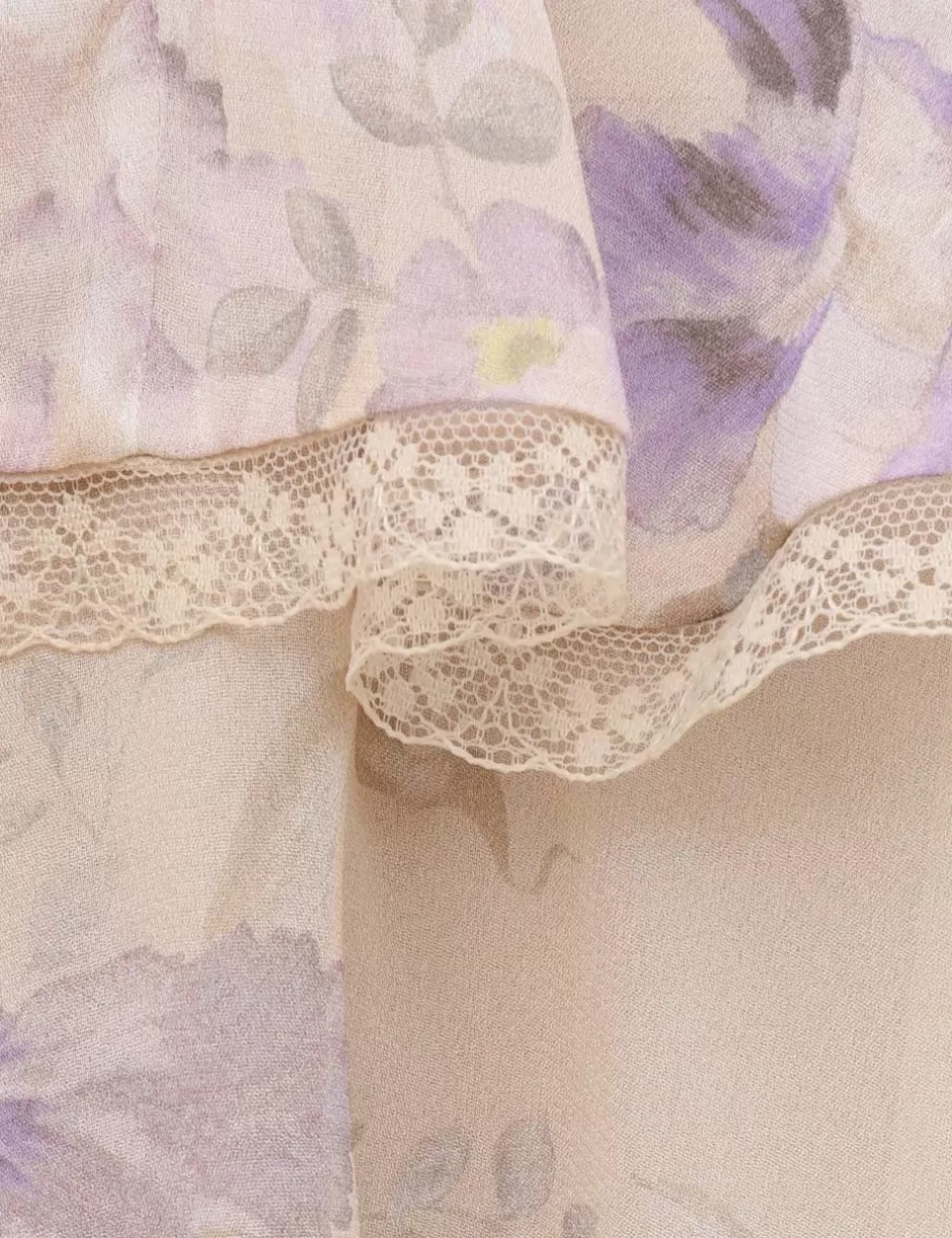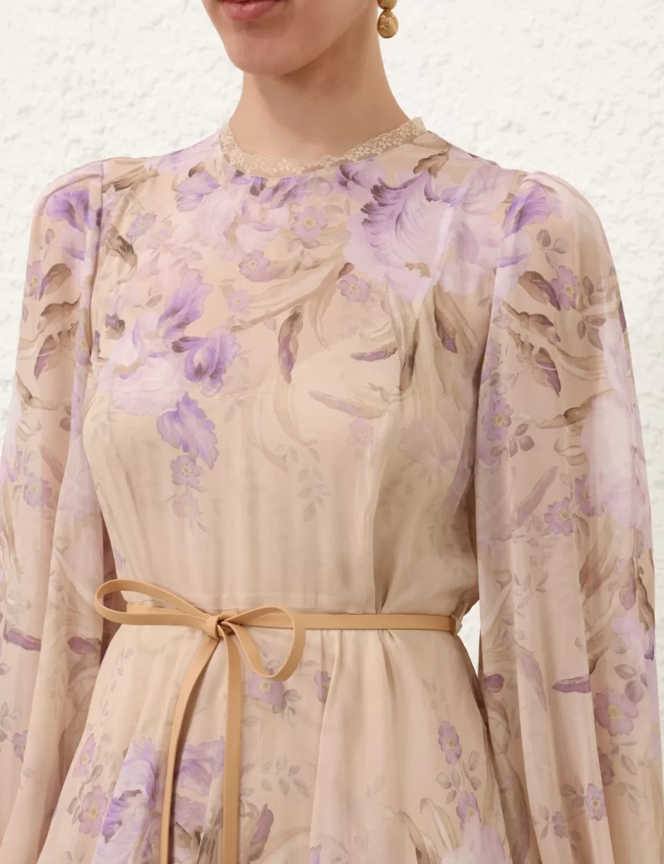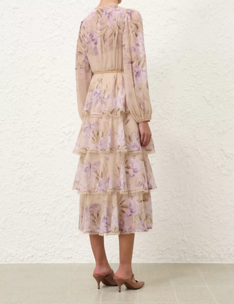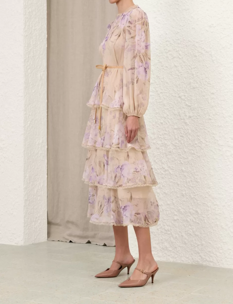 The Eden Lace Edge Midi Dress in Natural Iris from our Fall 2024 Collection, In Illustration. A tiered midi dress featuring a crew neckline with lace trim, elasticated blouson sleeves and a removable belt.