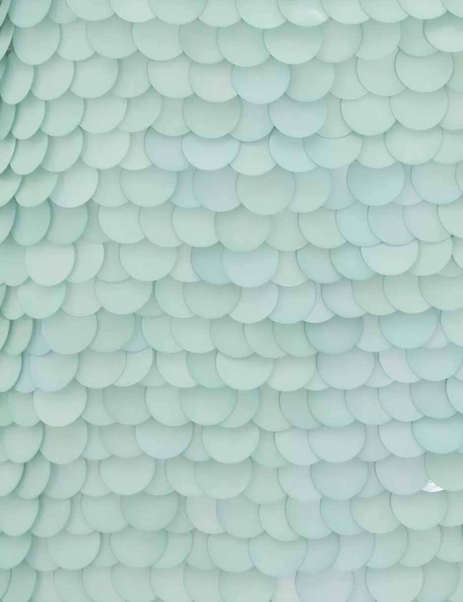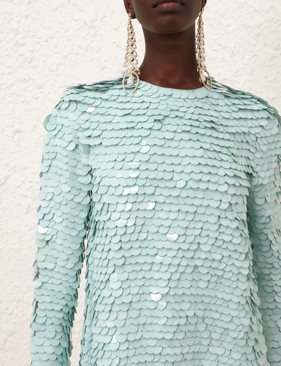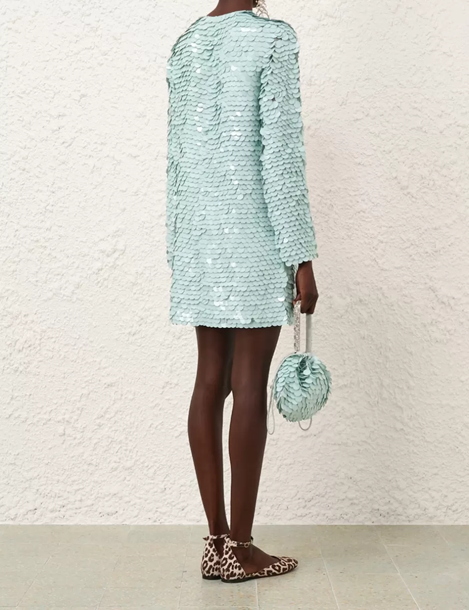 The Eden Sequin Mini Dress in Mint from our Fall 2024 Collection, In Illustration. A silk mini dress featuring a crew neckline, invisible centre back zip and sequin detailing throughout.