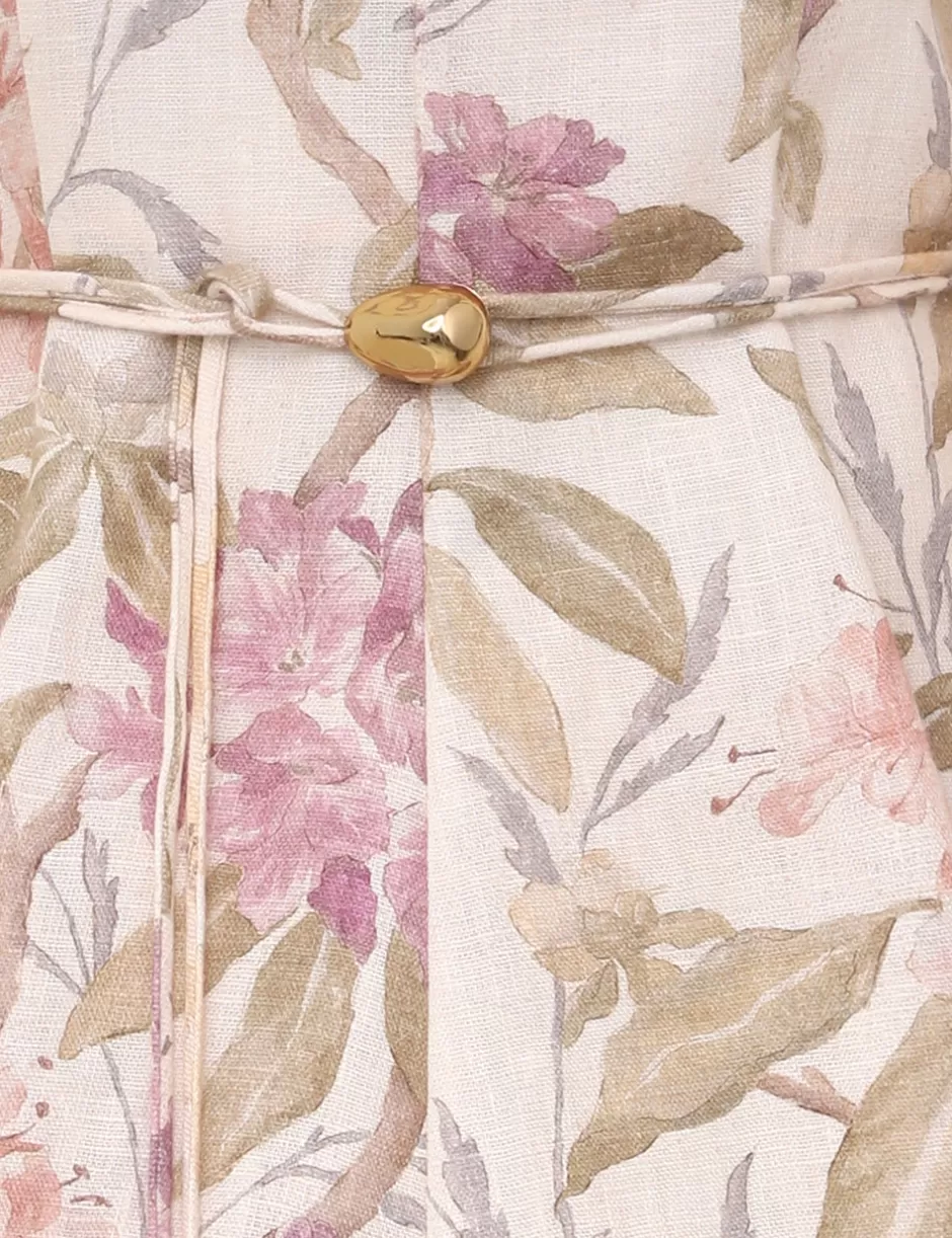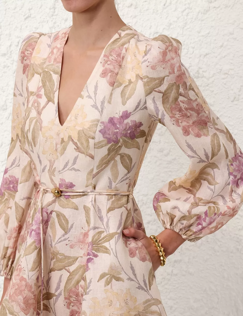 The Illustration Belted Flip Dress in Cream Inca Lily from our Fall 2024 Collection, In Illustration. A long sleeve linen mini dress featuring a deep v-neckline with fitted bodice and full skirt.