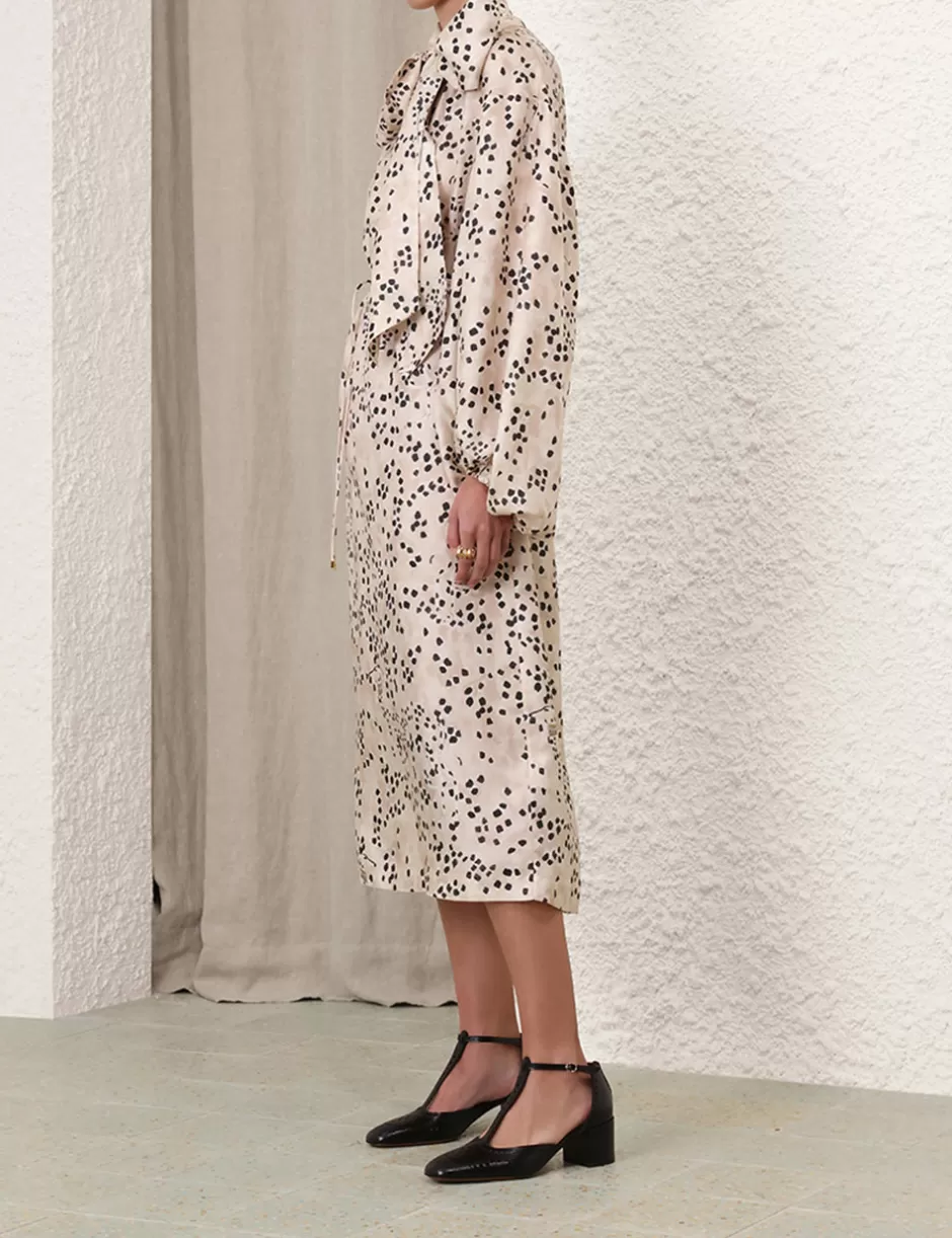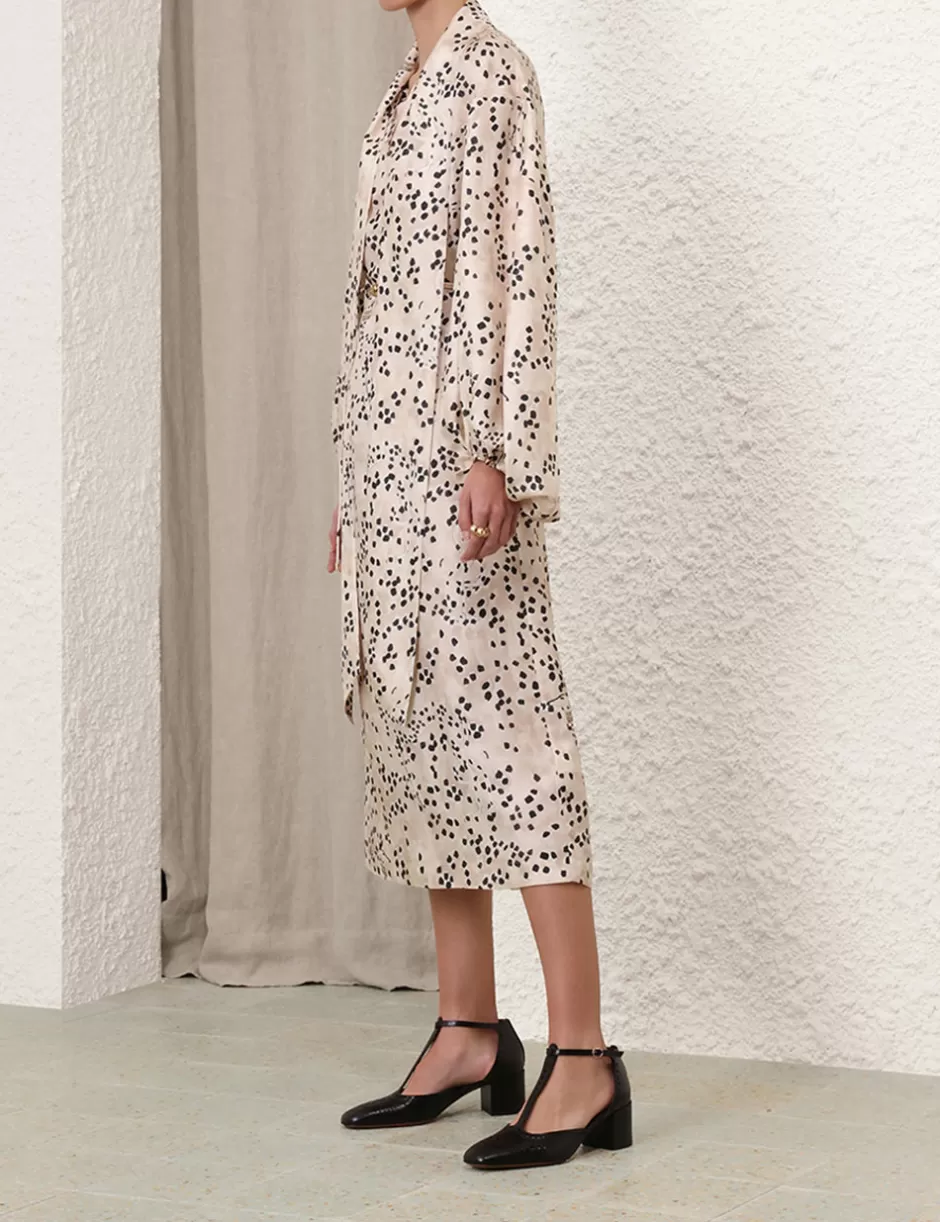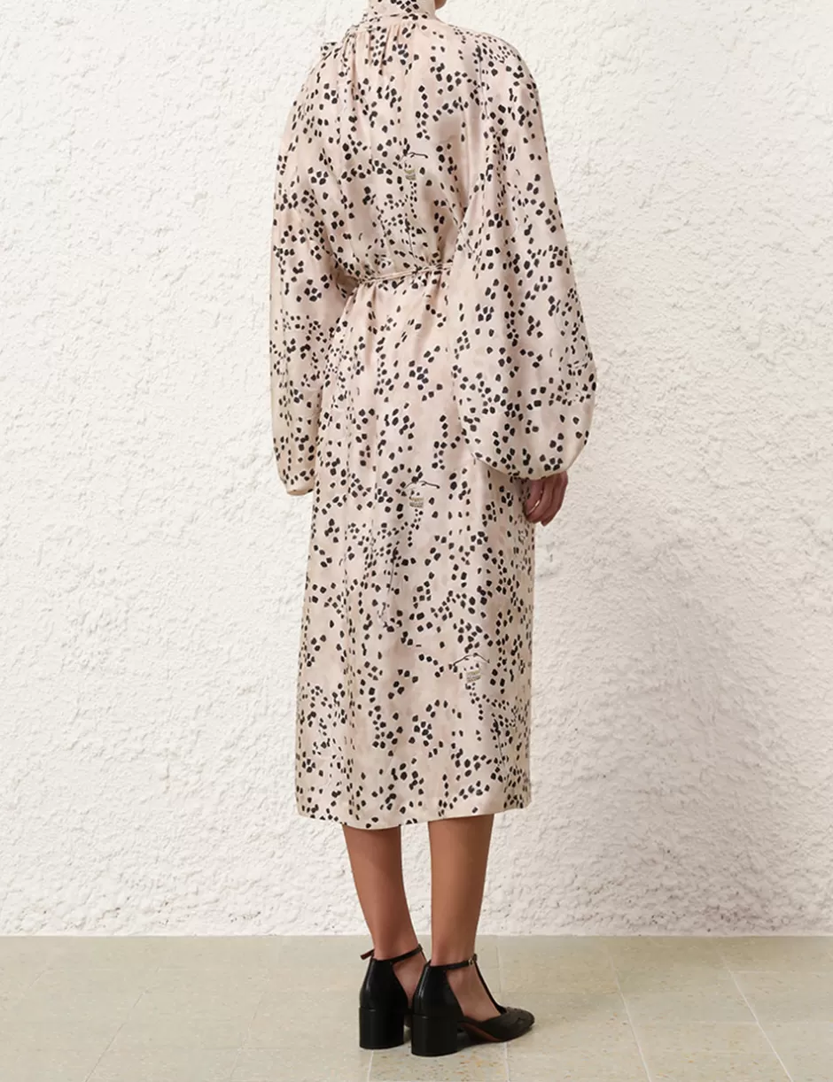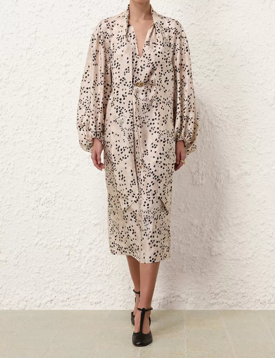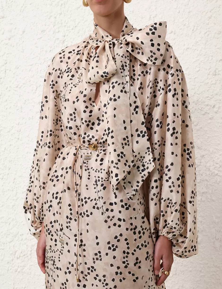 The Illustration Billow Dress in Dalmatian Dot from our Fall 2024 Collection, In Illustration. A silk long sleeve midi dress featuring a statement neck tie, optional V-neck opening and gathered blouson sleeves.