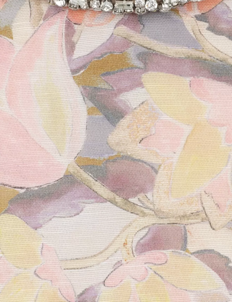 The Illustration Diamante Mini in Sorbetto Eden from our Fall 2024 Collection, In Illustration. A silk linen mini dress featuring crystal trim detailing, a stand collar and a tulle inserted sleeve head.