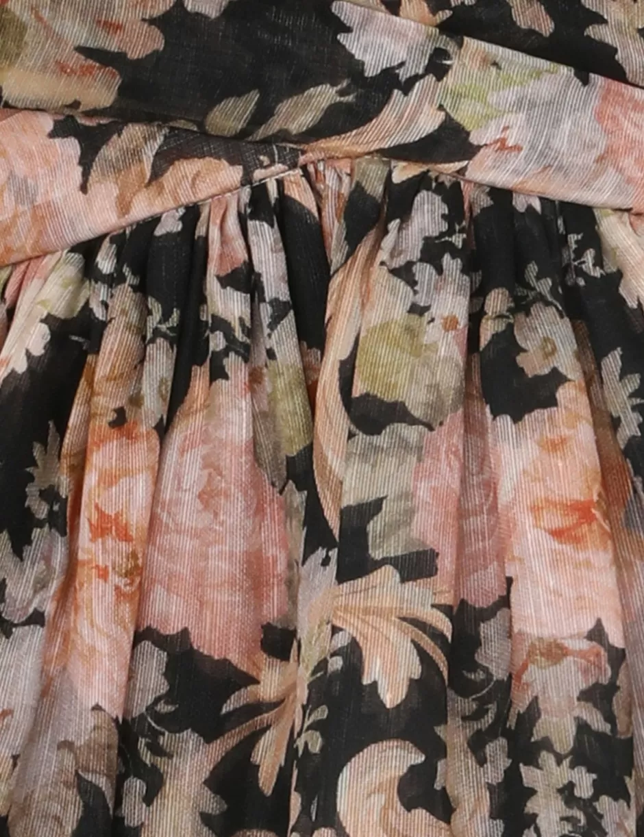 The Illustration Draped Mini Dress in Tea Rococo Floral from our Fall 2024 Collection, In Illustration. A silk linen placement print mini dress featuring a criss-cross pleat on bodice, long blouson sleeves with elasticated cuff and centre back zip closure.