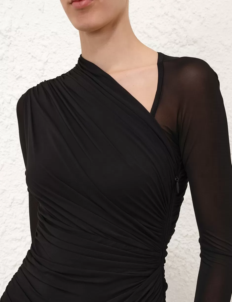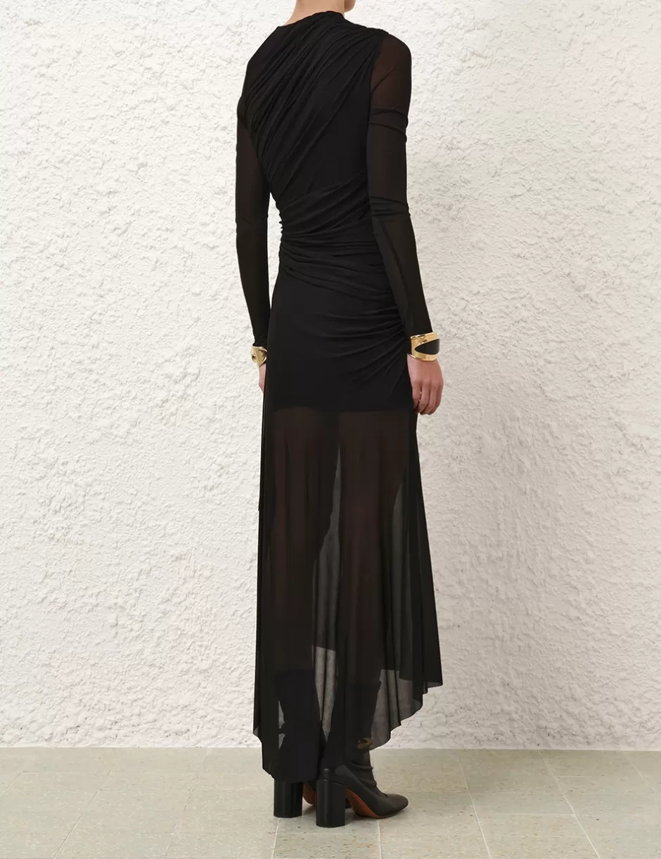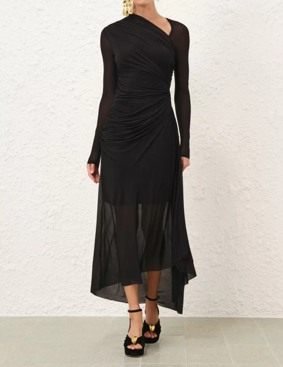 The Illustration Gathered Dress in Black from our Fall 2024 Collection, In Illustration. A slinky jersey midi dress featuring an asymmetric gathered neckline, long sleeves and ruching throughout.