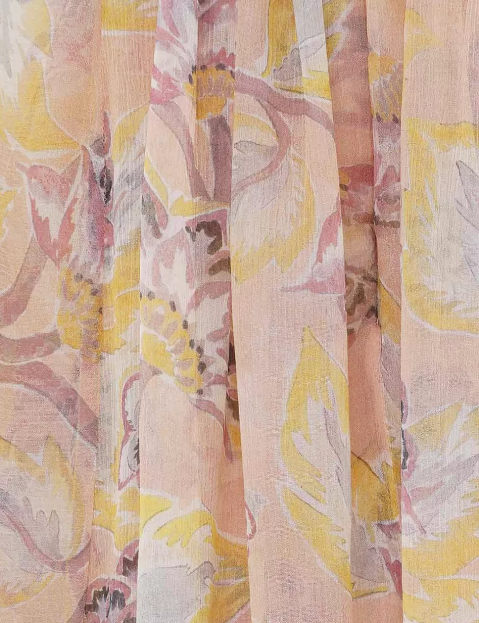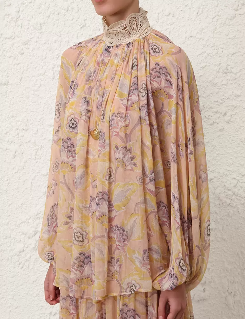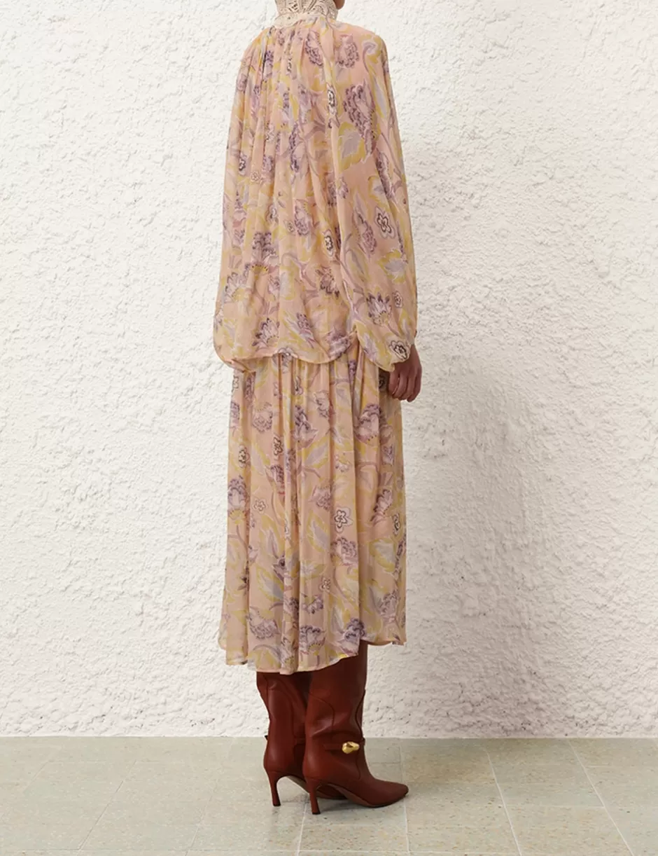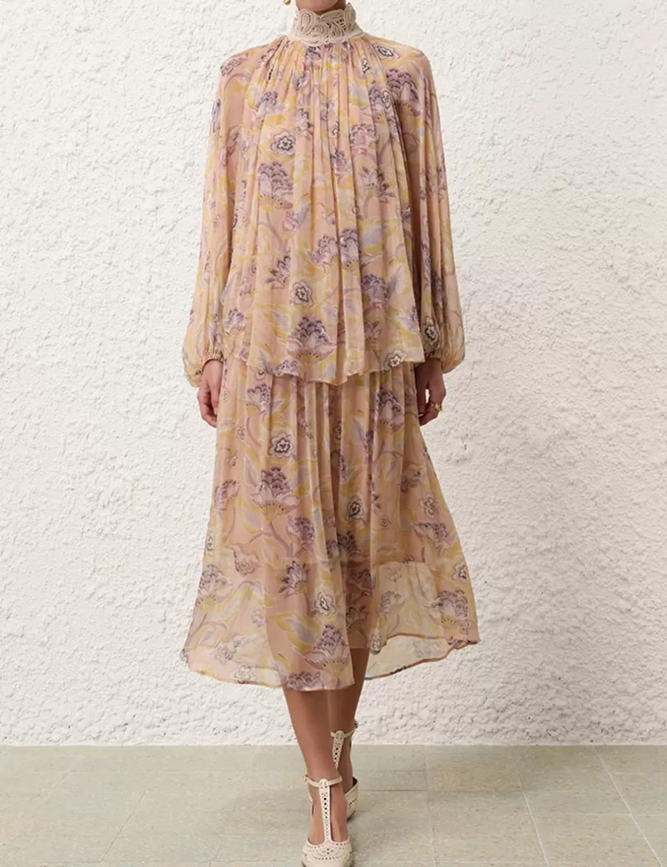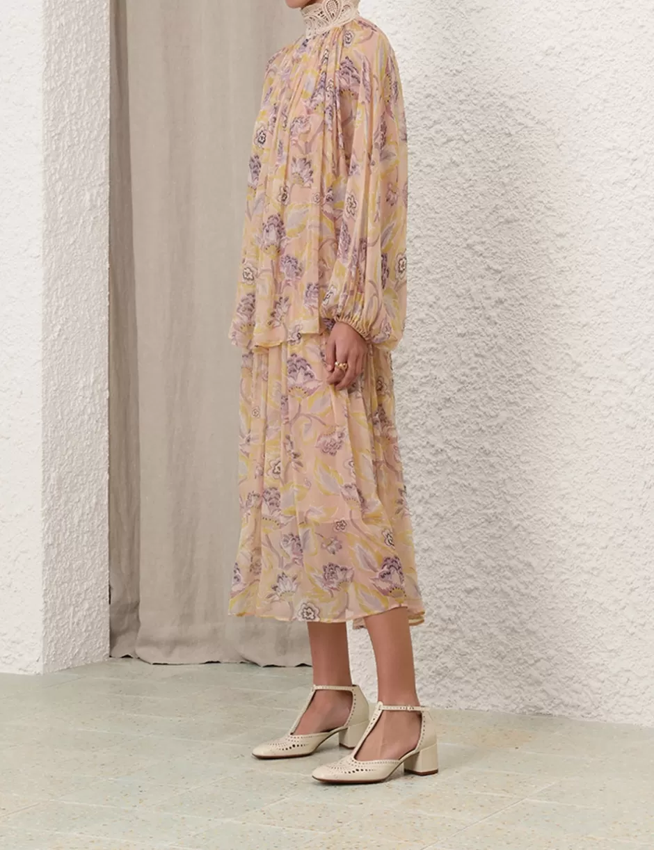 The Illustration Lace Edge Dress in Citrine Eden from our Fall 2024 Collection, In Illustration. A double layered midi dress featuring a lace neckline, gathered raglan sleeves with elasticated cuff and an invisible centre back zip closure.