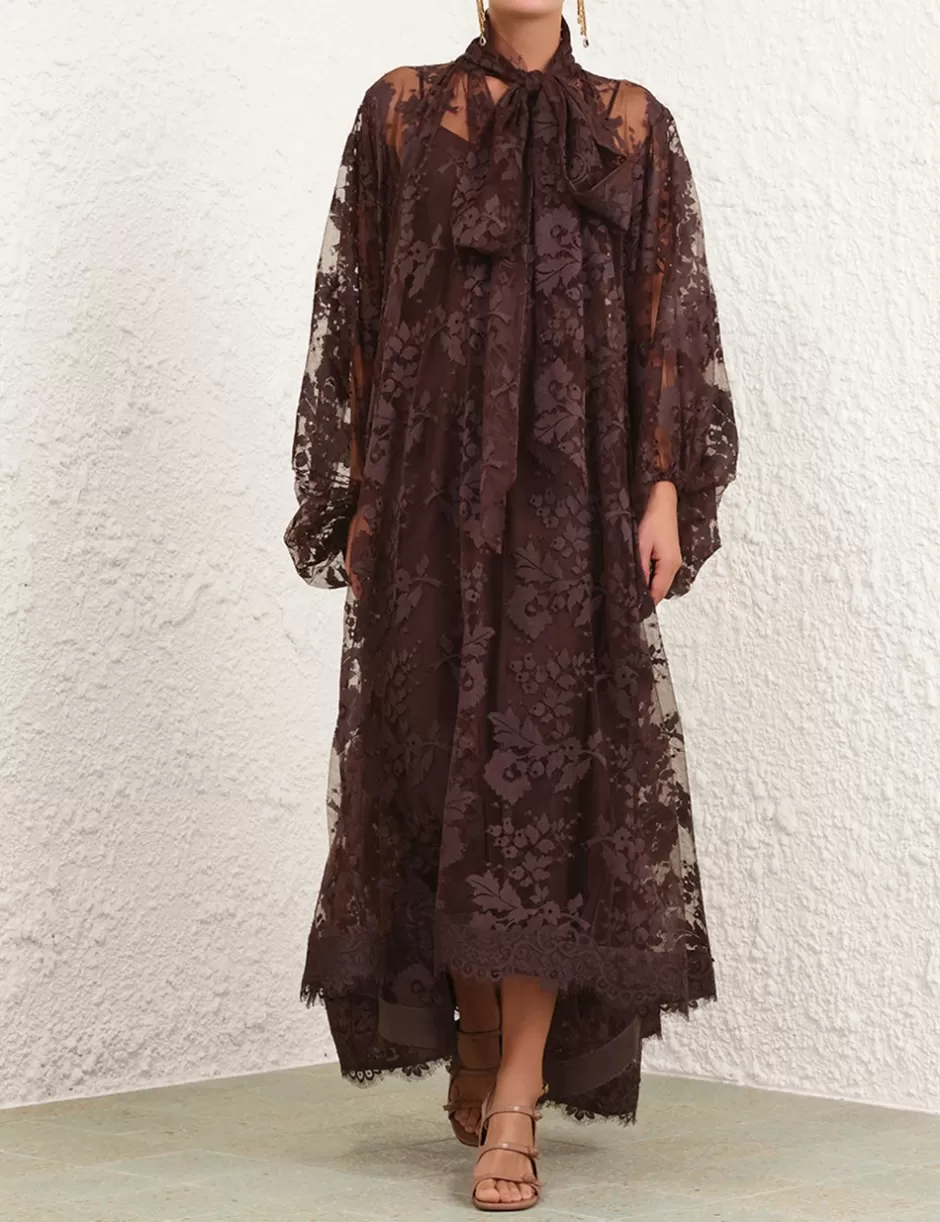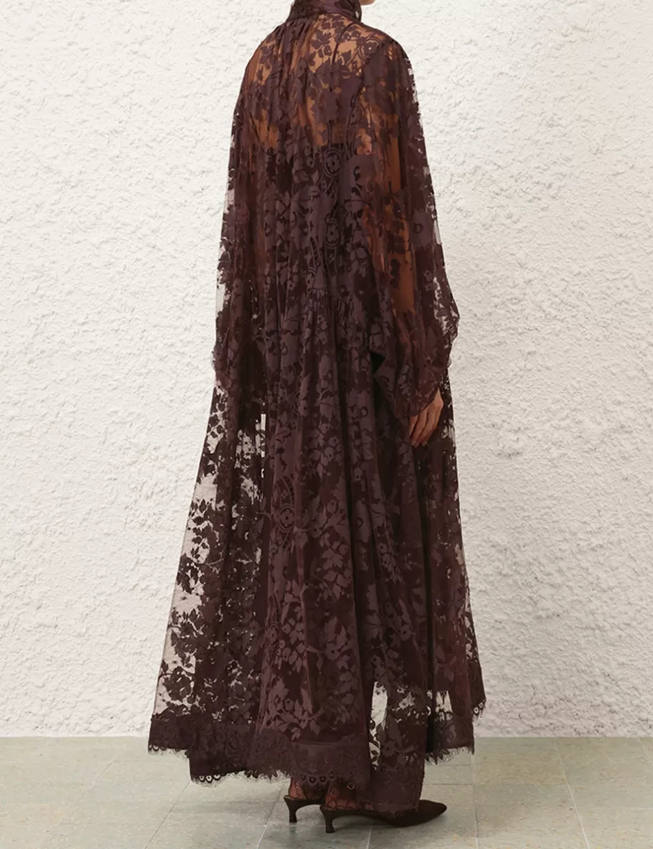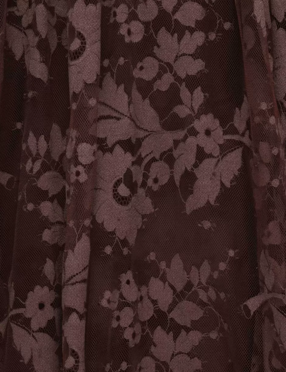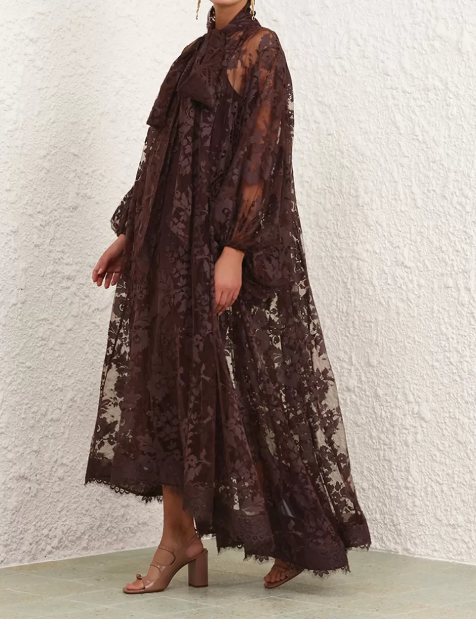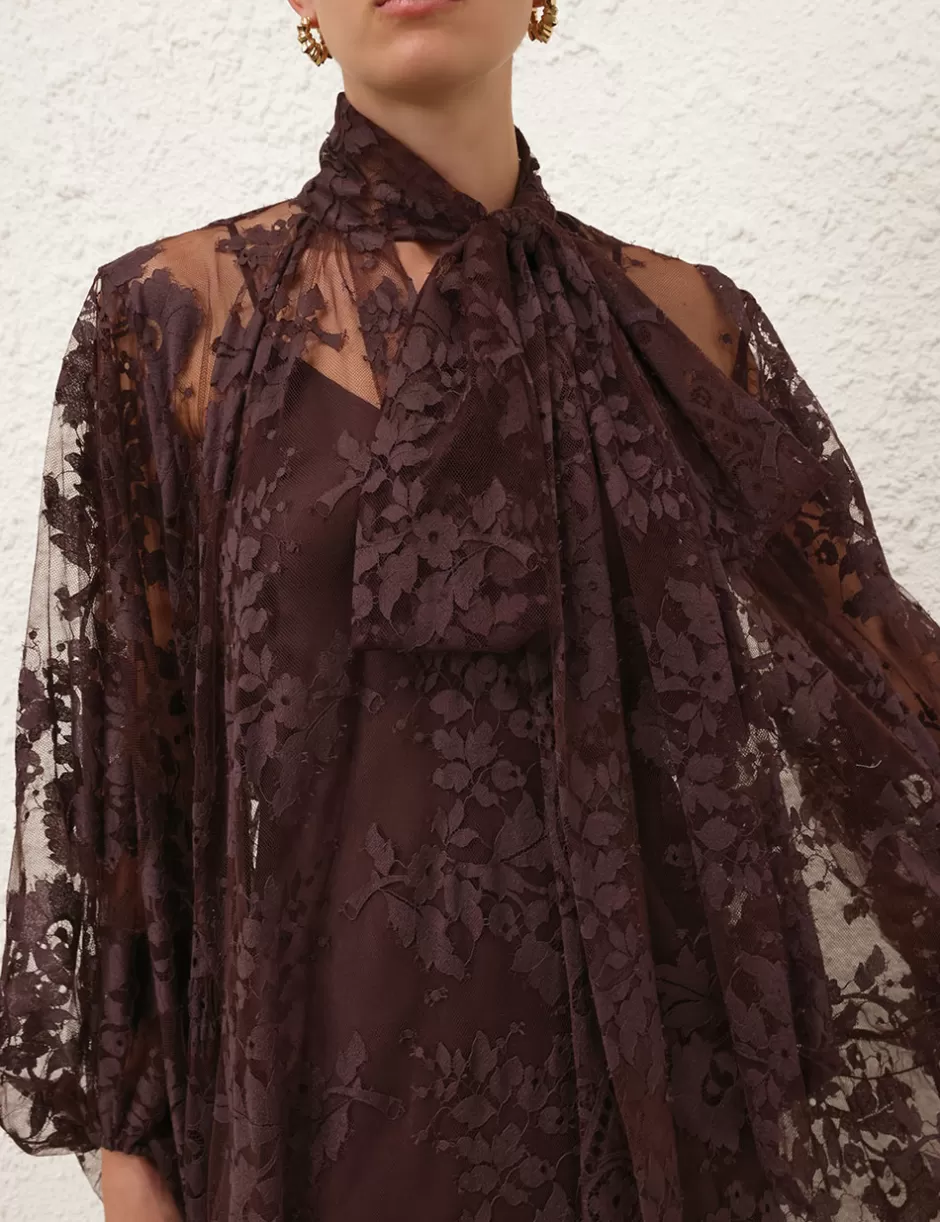 The Illustration Lace Gown in Mahogany from our Fall 2024 Collection, In Illustration. A full-length lace gown featuring long blouson sleeves with elasticated cuff, gathering at the neckline with a neck tie detail.