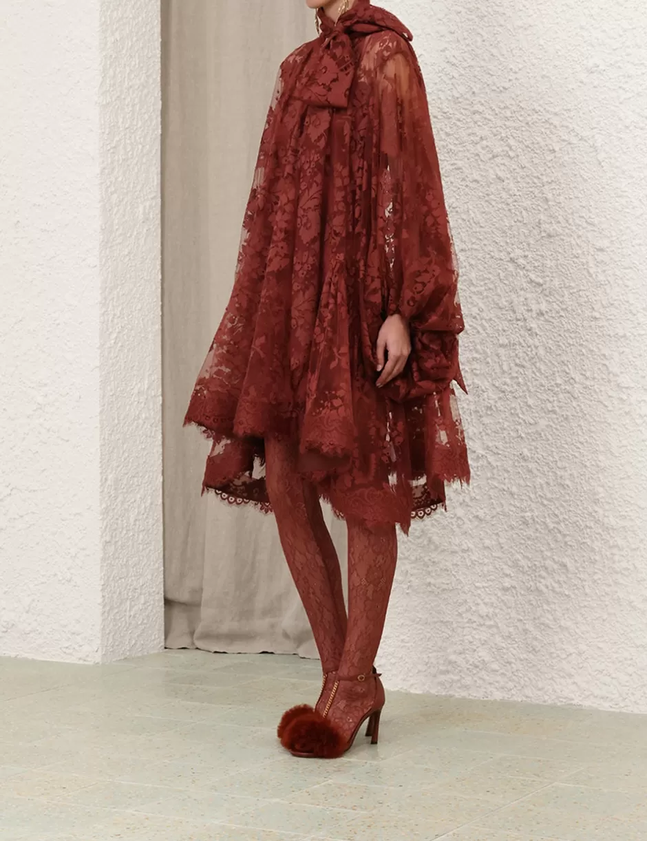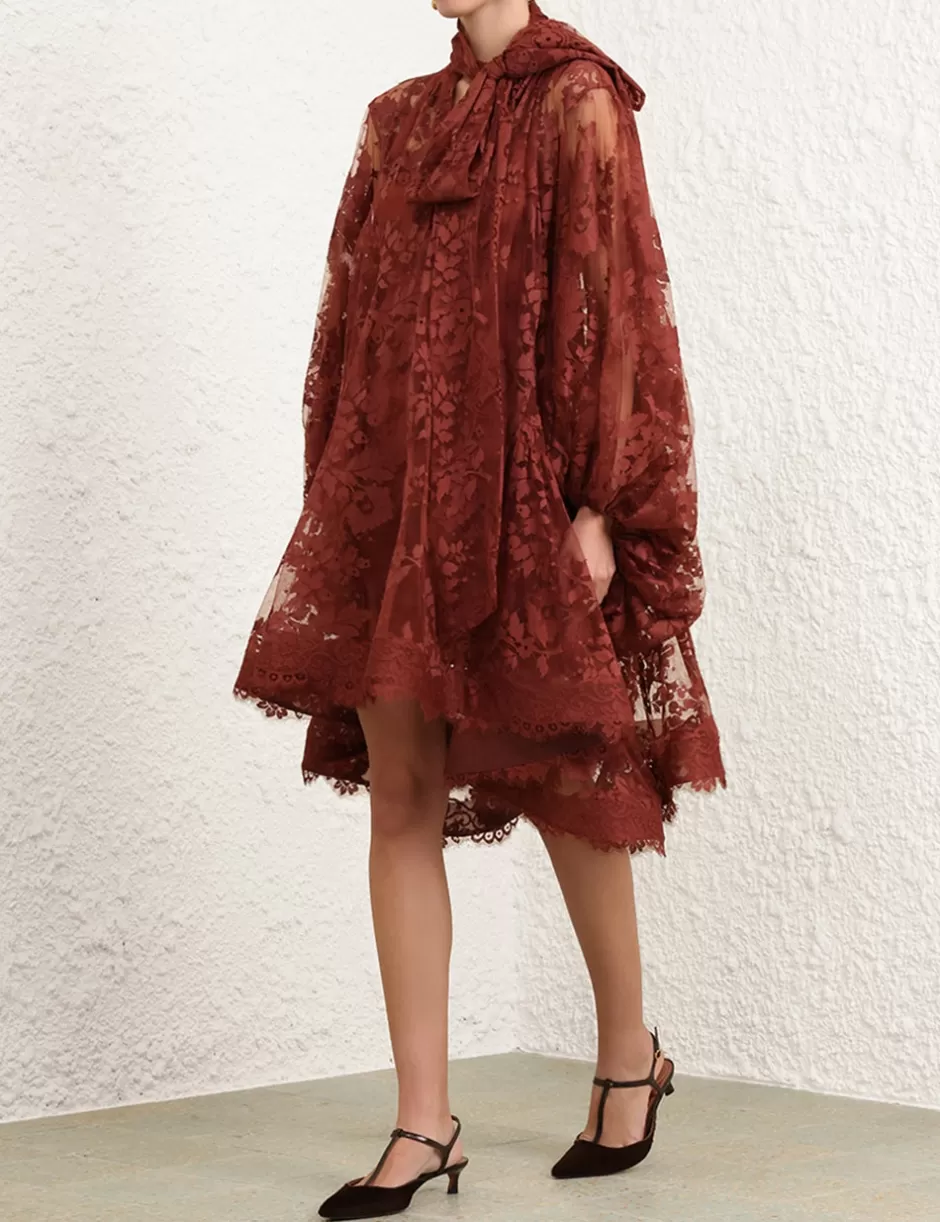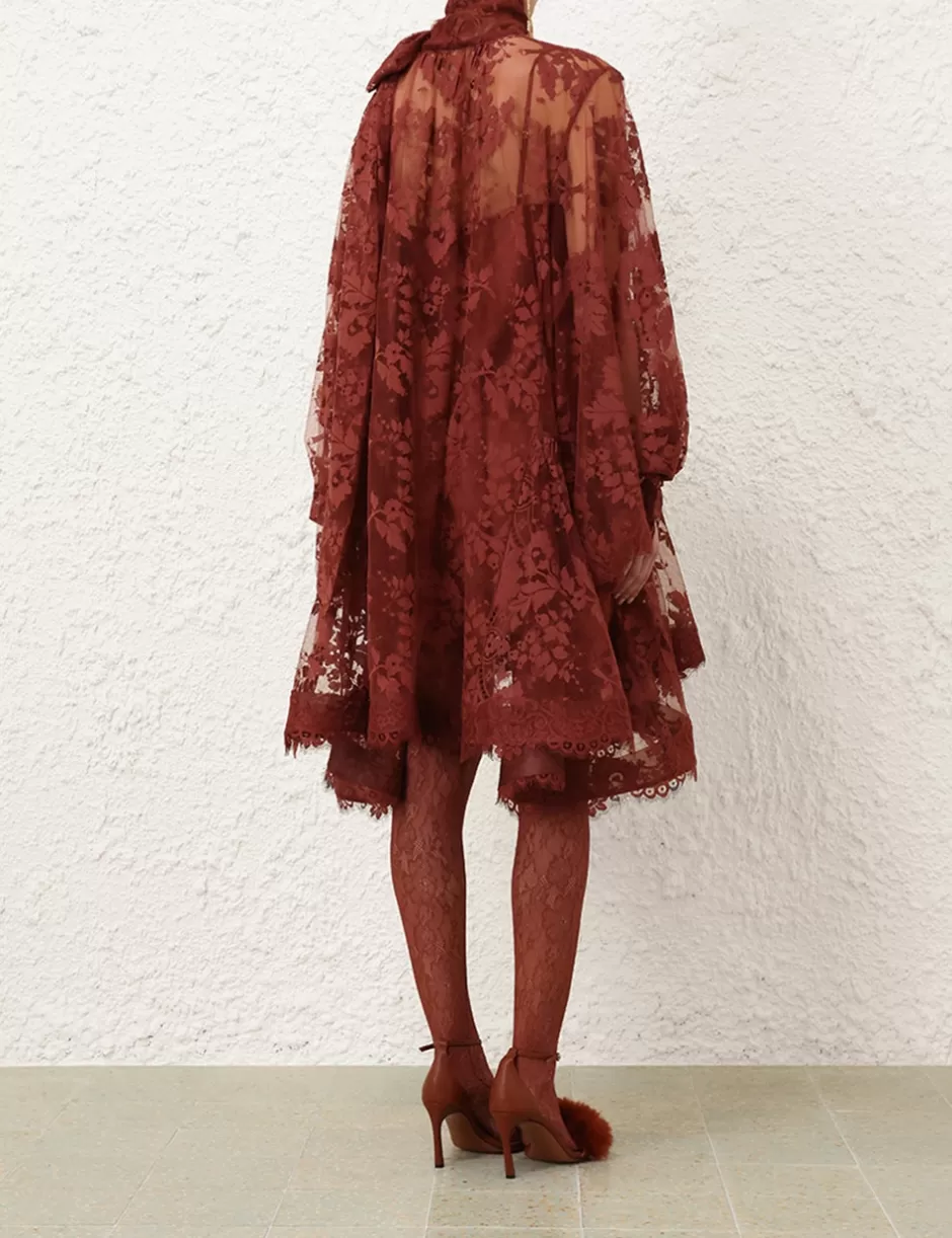 The Illustration Lace Mini Dress in Chestnut from our Fall 2024 Collection, In Illustration. A mini lace dress featuring long blouson sleeves with elasticated cuff, gathering at the neckline with a neck tie detail.