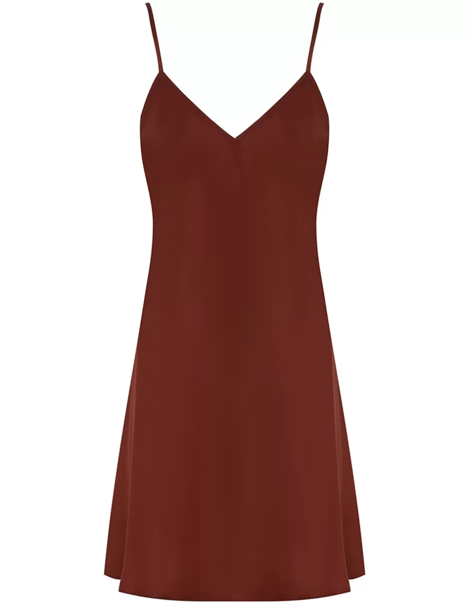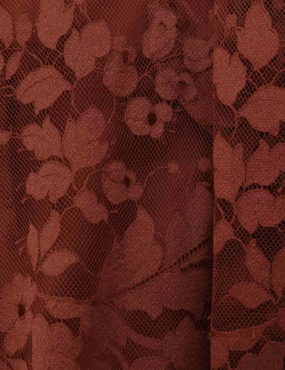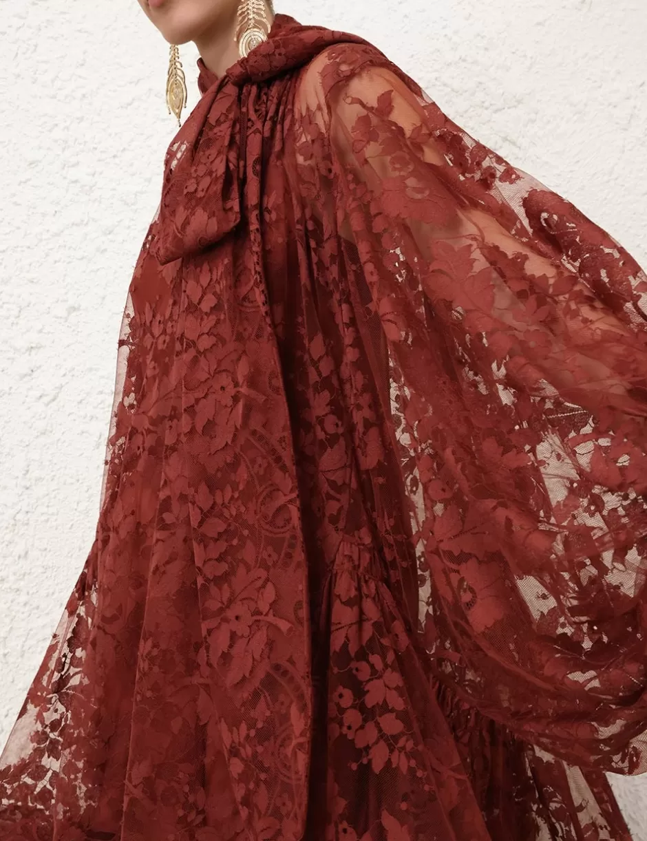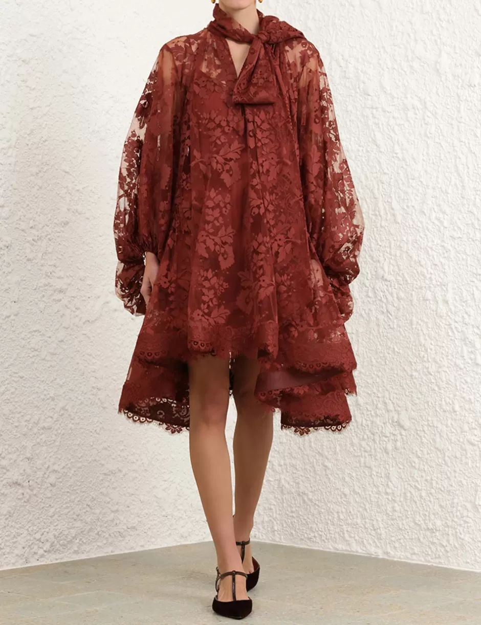 The Illustration Lace Mini Dress in Chestnut from our Fall 2024 Collection, In Illustration. A mini lace dress featuring long blouson sleeves with elasticated cuff, gathering at the neckline with a neck tie detail.
