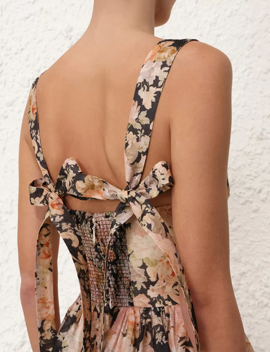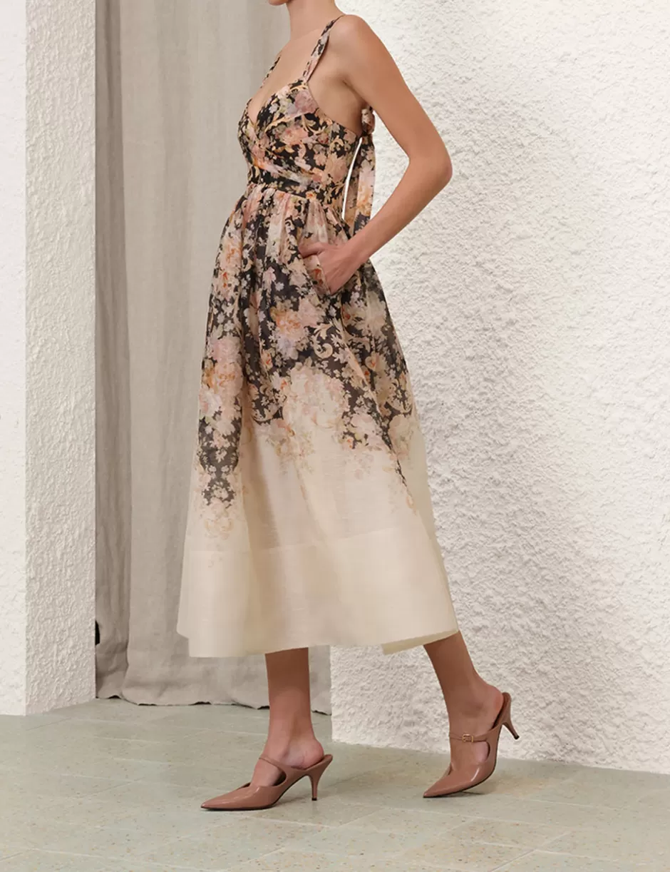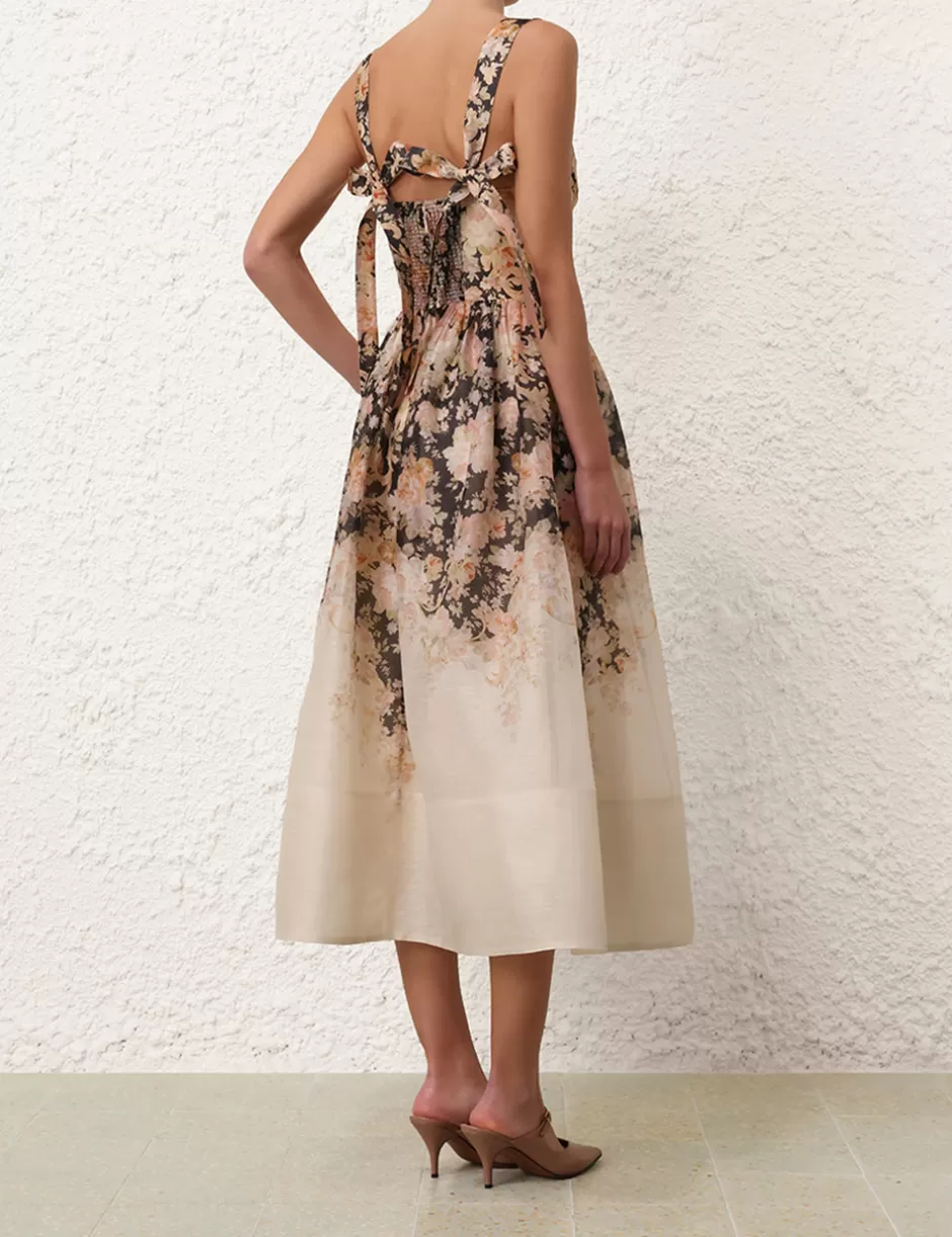 The Illustration Midi Dress in Tea Rococo Floral from our Fall 2024 Collection, In Illustration. A silk linen midi dress featuring a criss-cross pleat on the bodice, adjustable straps with back bows; finished with boning along the front, side and back seam.