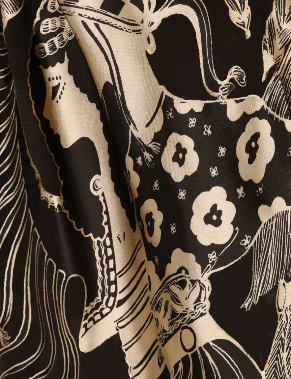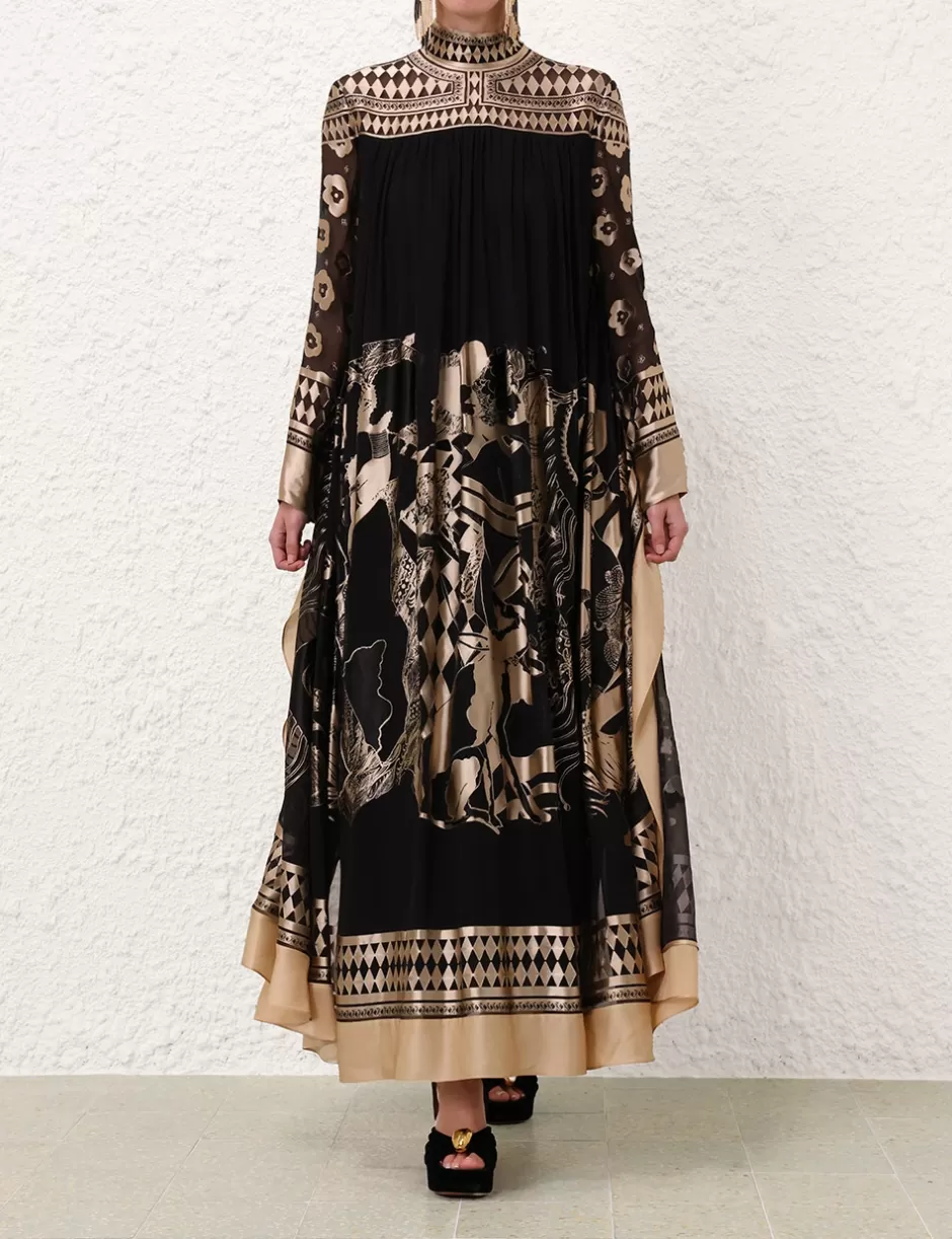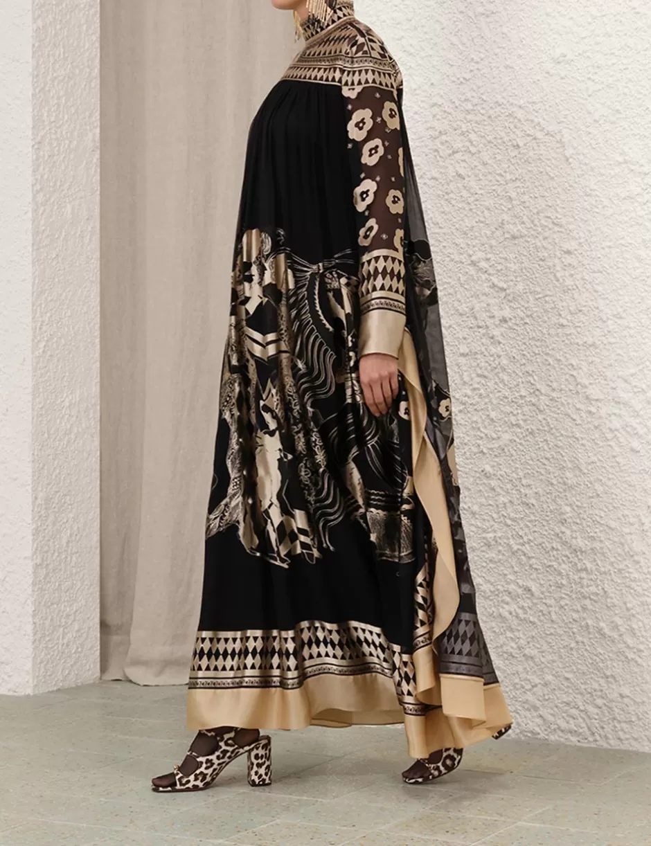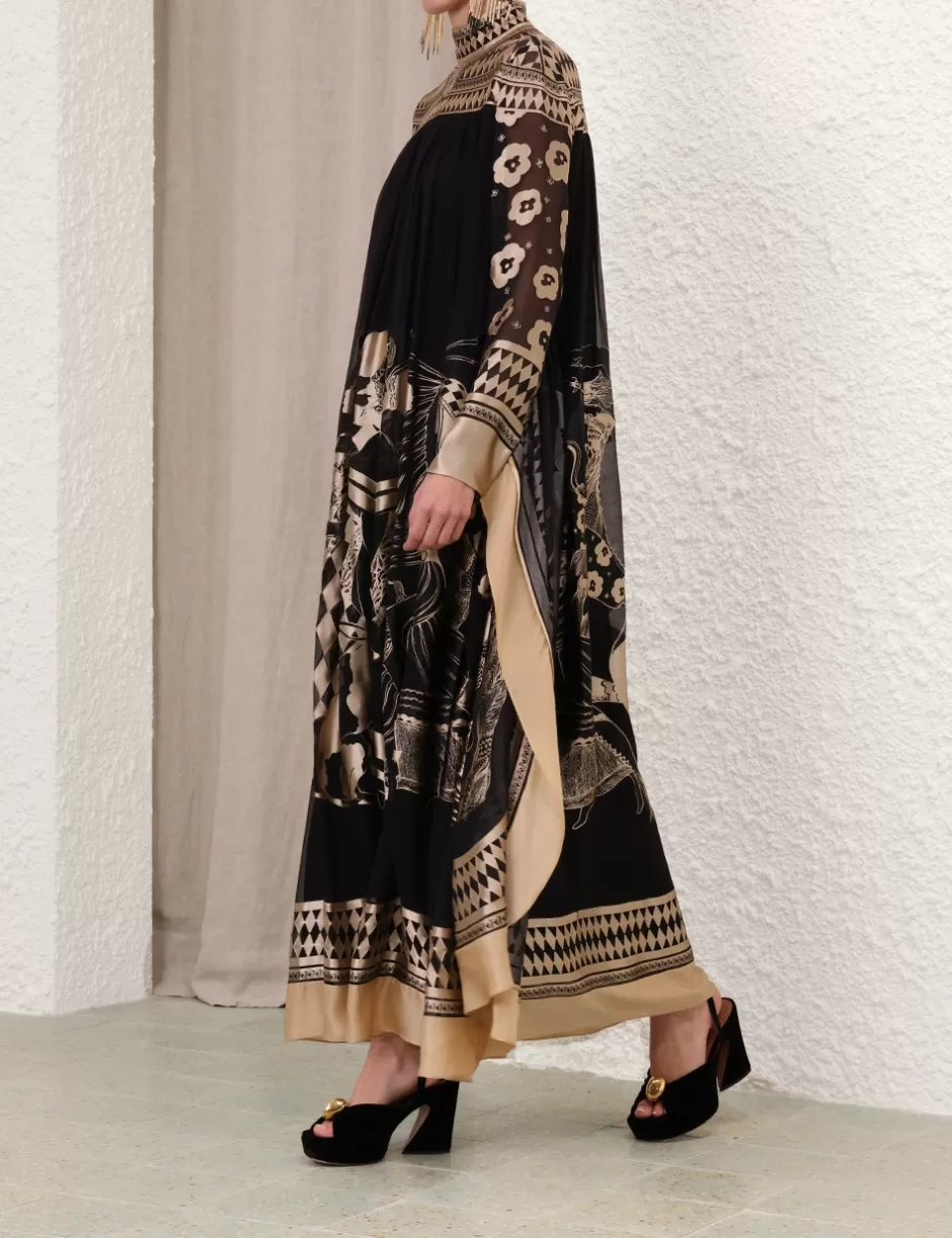 The Illustration Otto Gown in Black/Tea from our Fall 2024 Collection, In Illustration. A full-length gown featuring long batwing sleeves, rouleau waist tie with toggle ends and an invisible centre back zip closure.