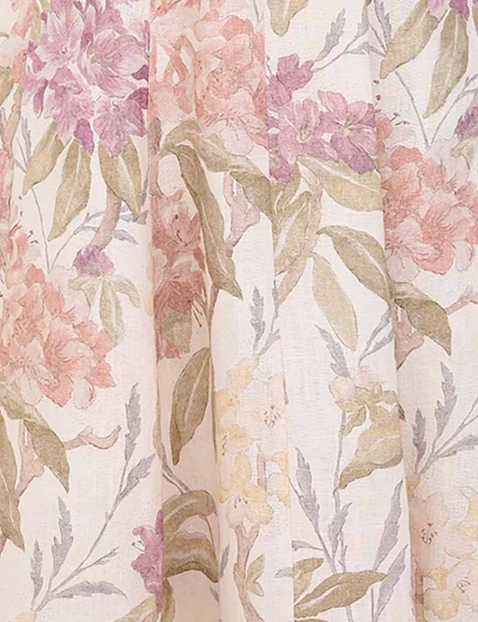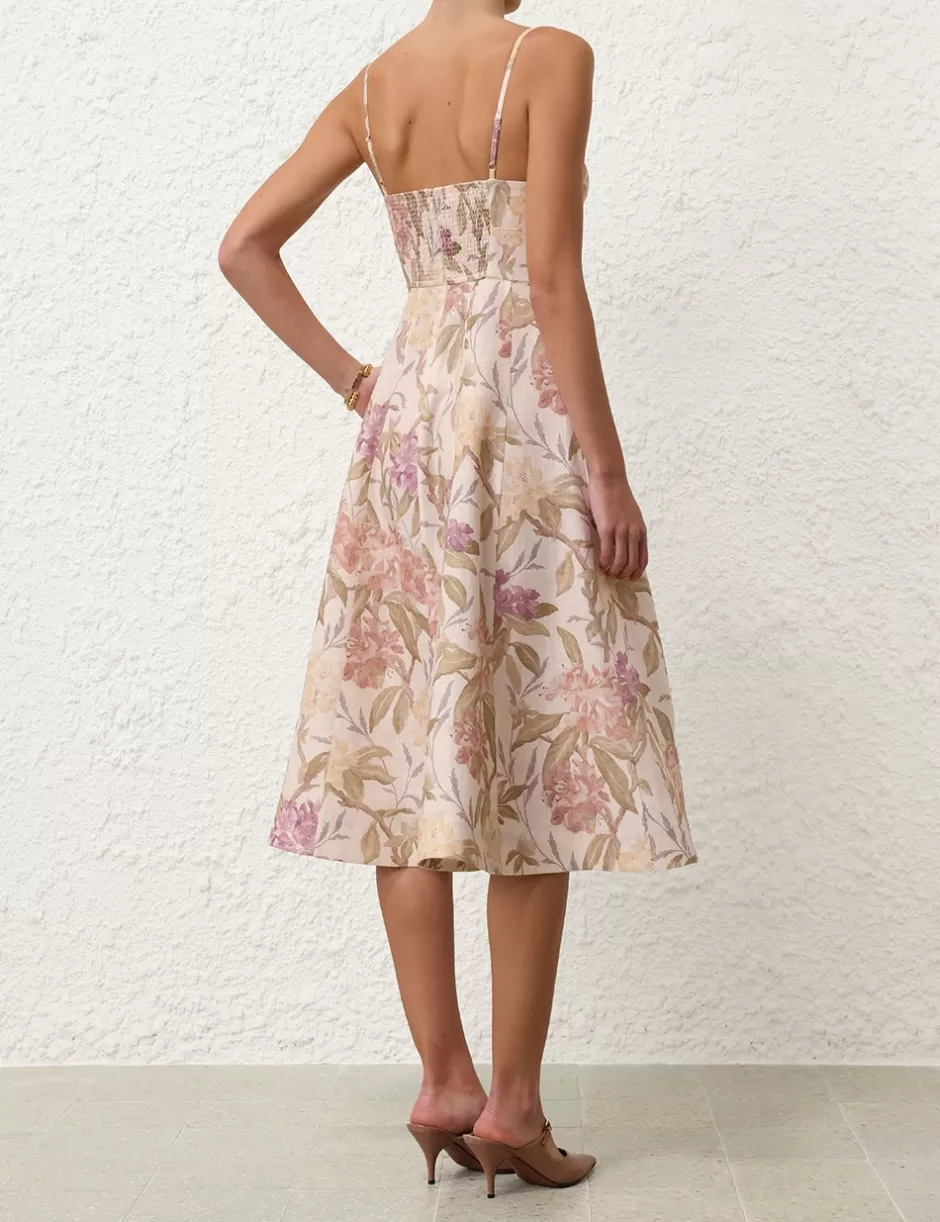 The Illustration Picnic Dress in Cream Inca Lily from our Fall 2024 Collection, In Illustration. A linen midi dress featuring a fitted bustier, shirred back bust and adjustable shoulder straps.