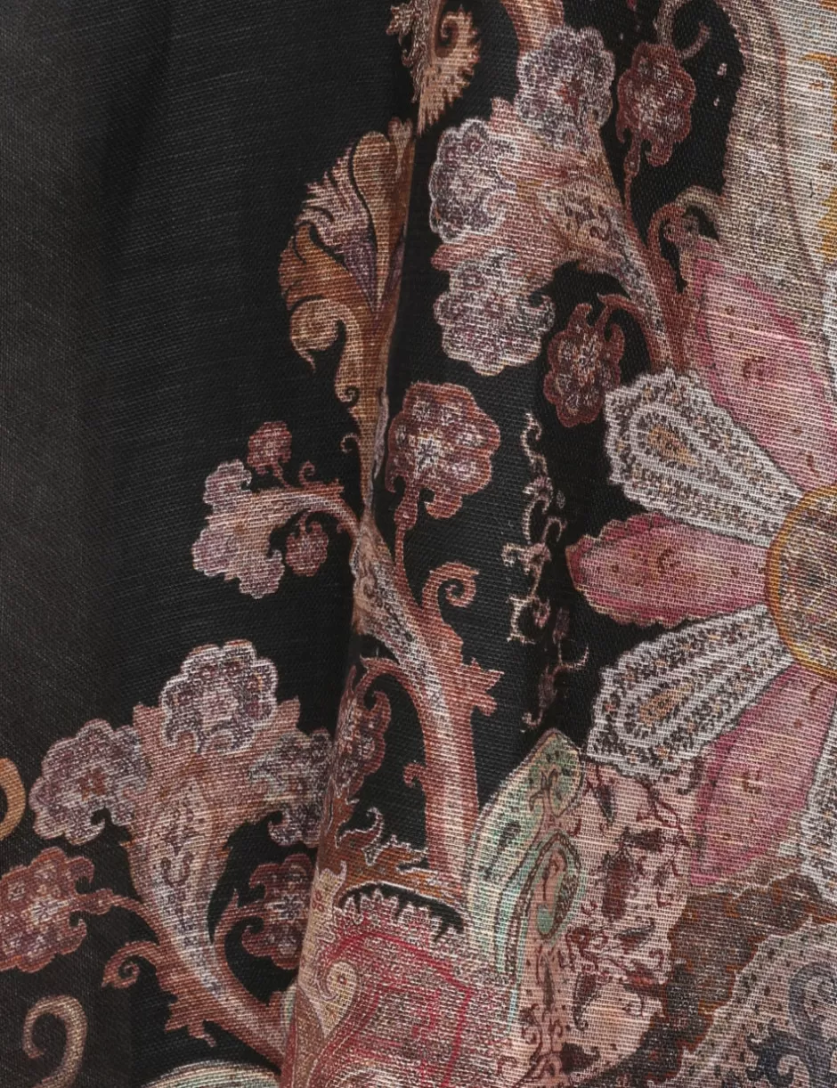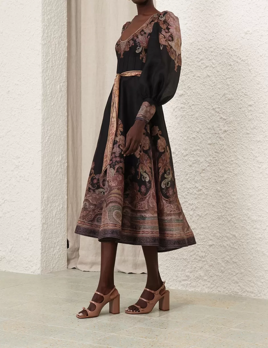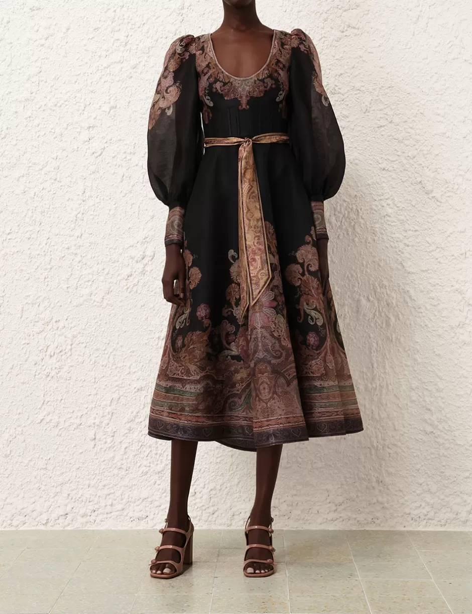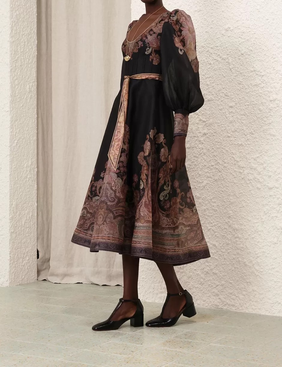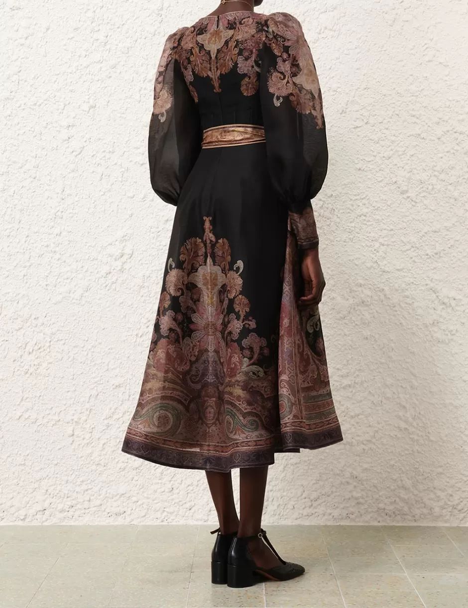 The Illustration Structured Dress in Black Paisley from our Fall 2024 Collection, In Illustration. A silk linen organza midi dress featuring a scoop neckline, long blouson sleeves with elongated cuffs with zips and a removable silk waist tie.