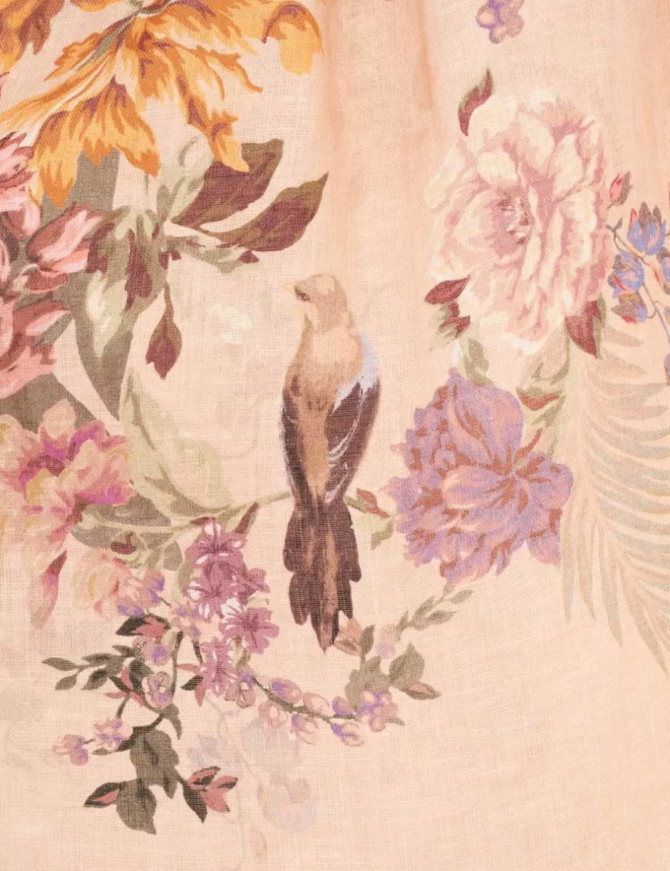 The Pavilion Draped Mini Dress in Peach Multi Floral from our Fall 2024 Collection, In Illustration. A linen mini dress featuring a criss-cross pleat on bodice, long blouson sleeves with elasticated cuff and a centre back zip closure.