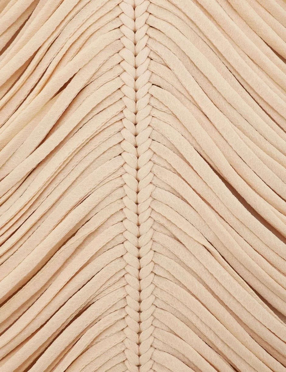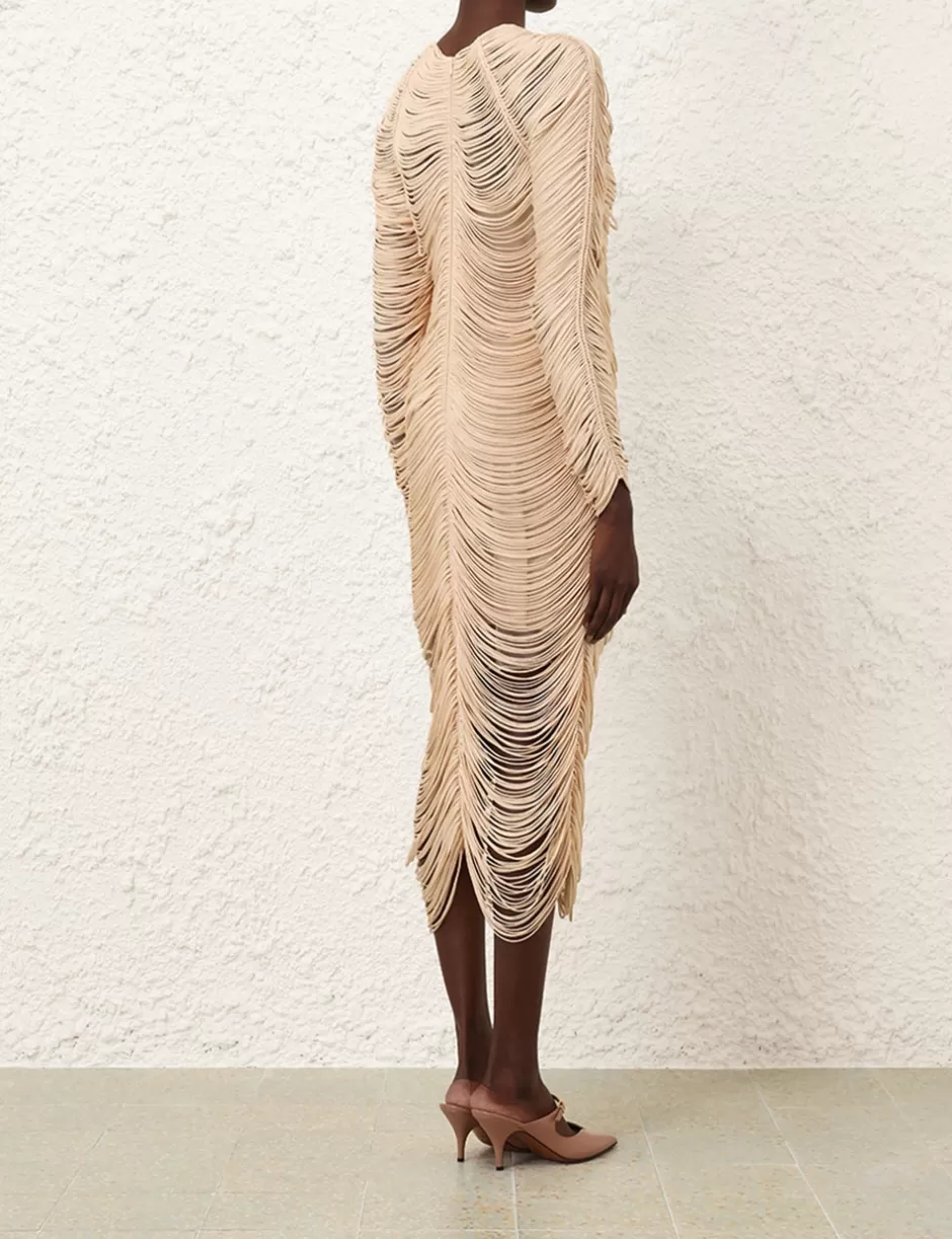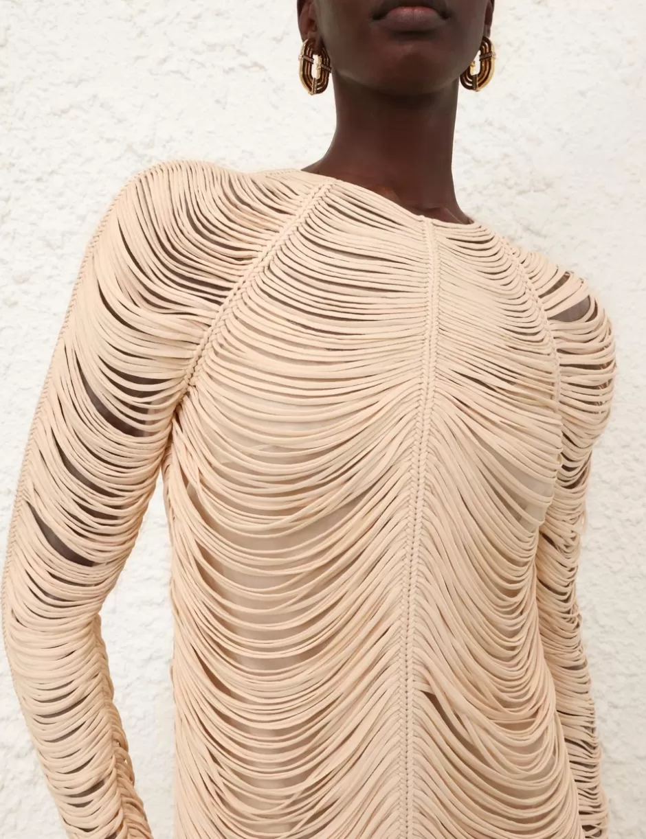 The Pavilion Rouleaux Midi Dress in Cream from our Fall 2024 Collection, In Illustration. A midi dress featuring a crew neckline, long sleeves and draped knotted rouleaux trim throughout.