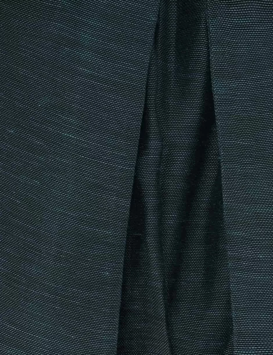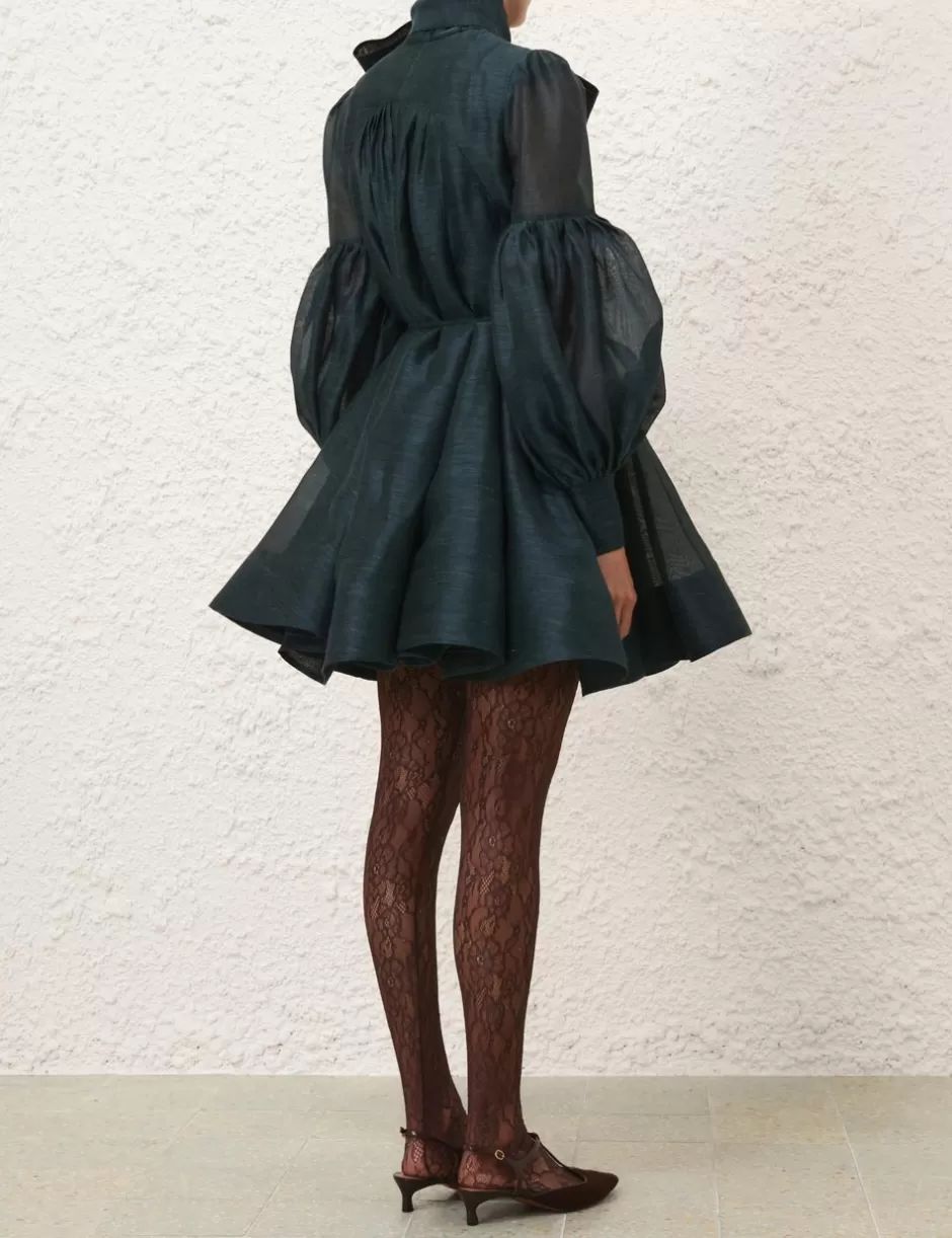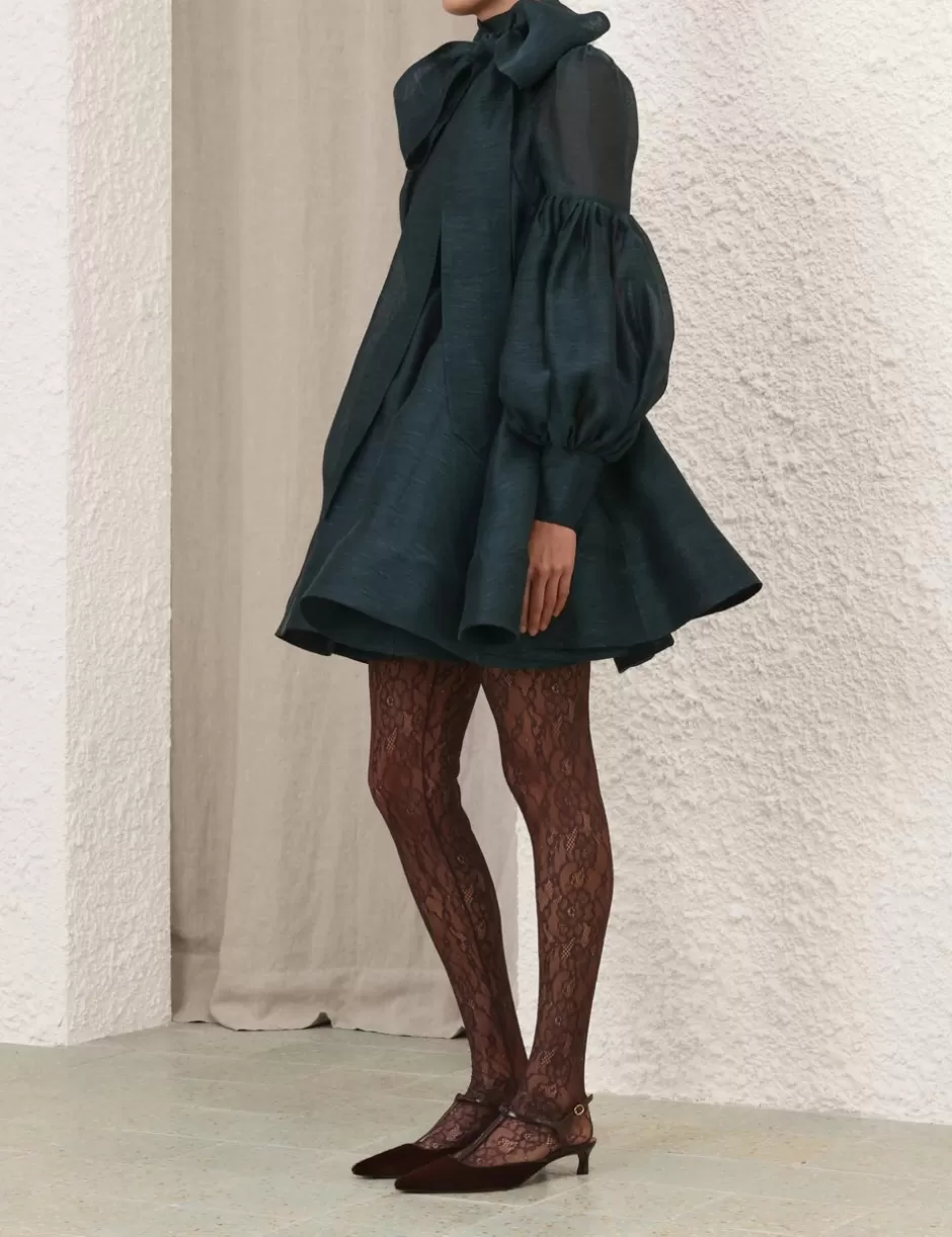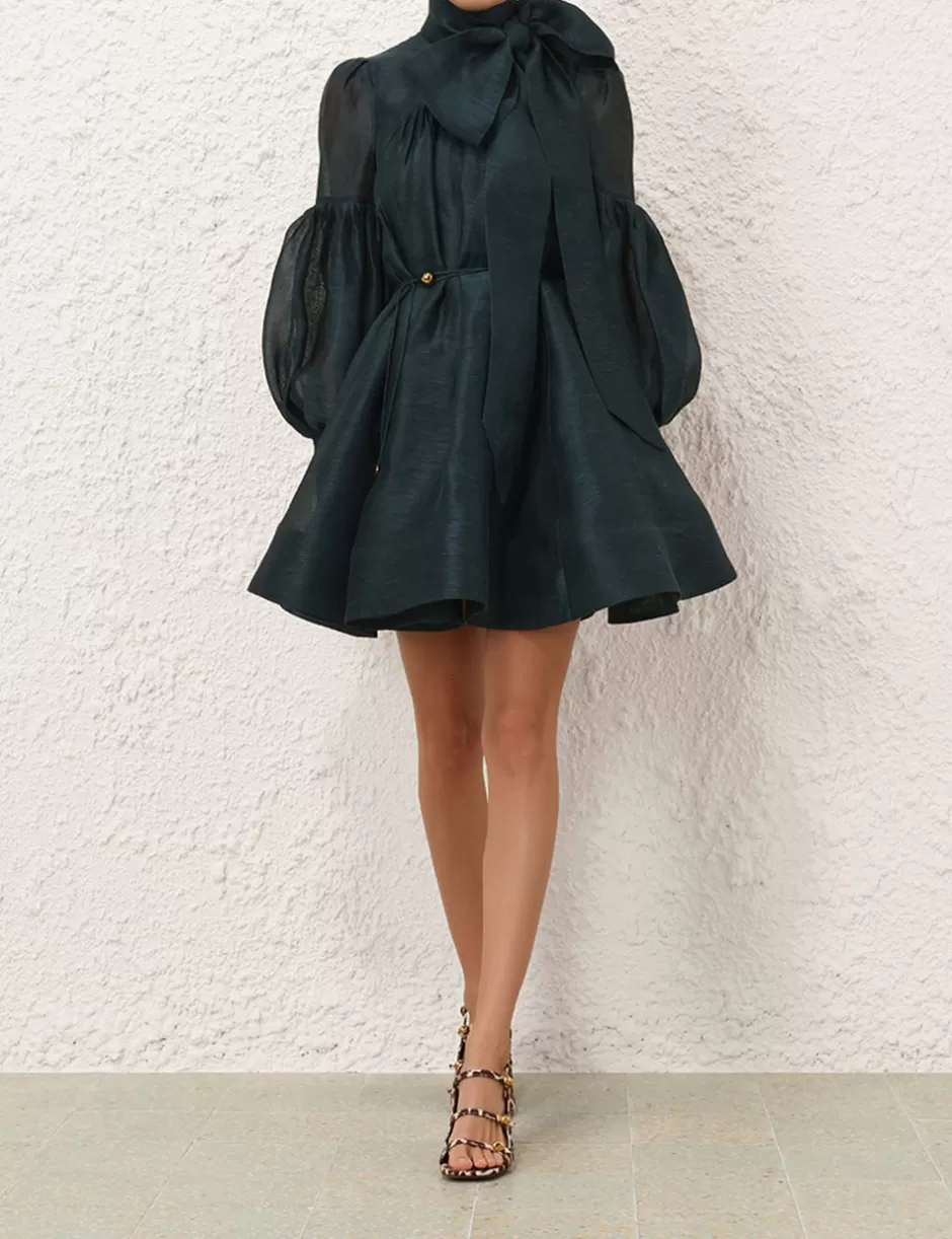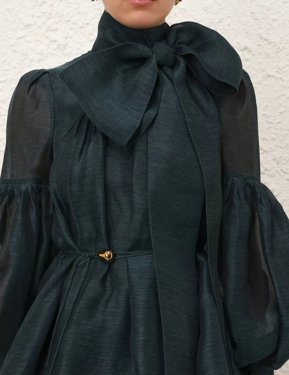 The Pavilion Tie Neck Mini Dress in Pine from our Fall 2024 Collection, In Illustration. A silk linen mini dress featuring an exaggerated self tie necktie, gathered front and back neckline with long blouson sleeves.