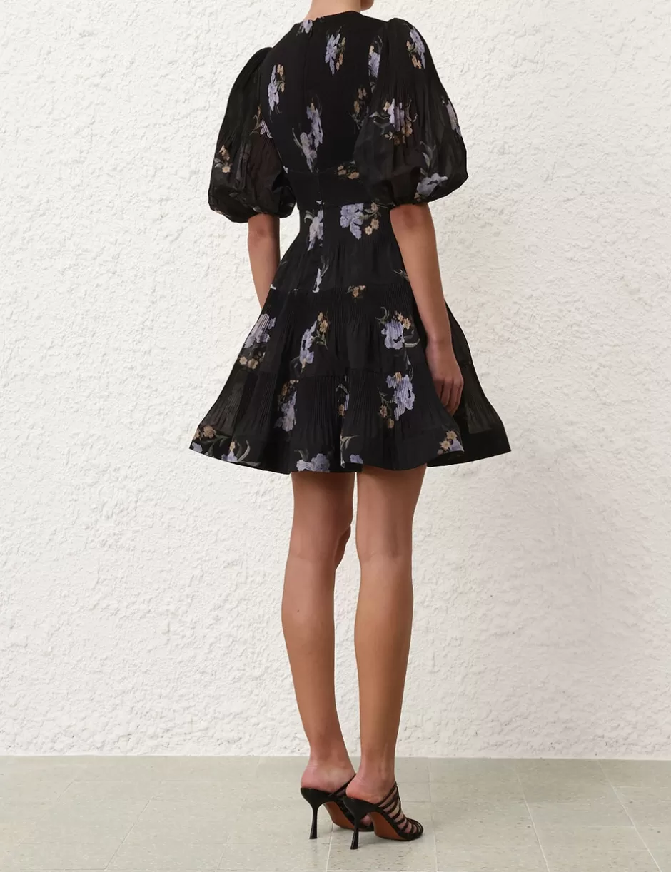 The Pleated Mini Dress in Black Iris Floral from our Fall 2024 Collection, In Illustration. A mini dress featuring a plunging V-neckline, short blouson sleeves and a gathered under bust.