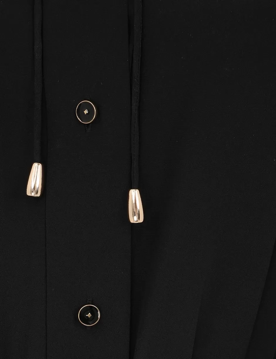 The Shirt Mini Dress in Black from our Fall 2024 Collection, In Illustration. A long sleeve mini dress featuring a drop waist silhouette, a detachable flower neck tie, buttons down the centre front and a removable self tie rouleau belt.