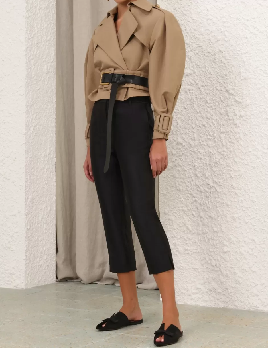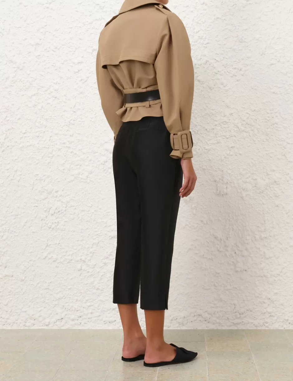 The Crush Cropped Trench Coat in Khaki from our Resort 2025 Collection, Crush. A cropped trench coat featuring a centre front opening with ZIMMERMANN branded buttons, a classic collar with a hook and bar closure; finished with a self cover buckle belt.