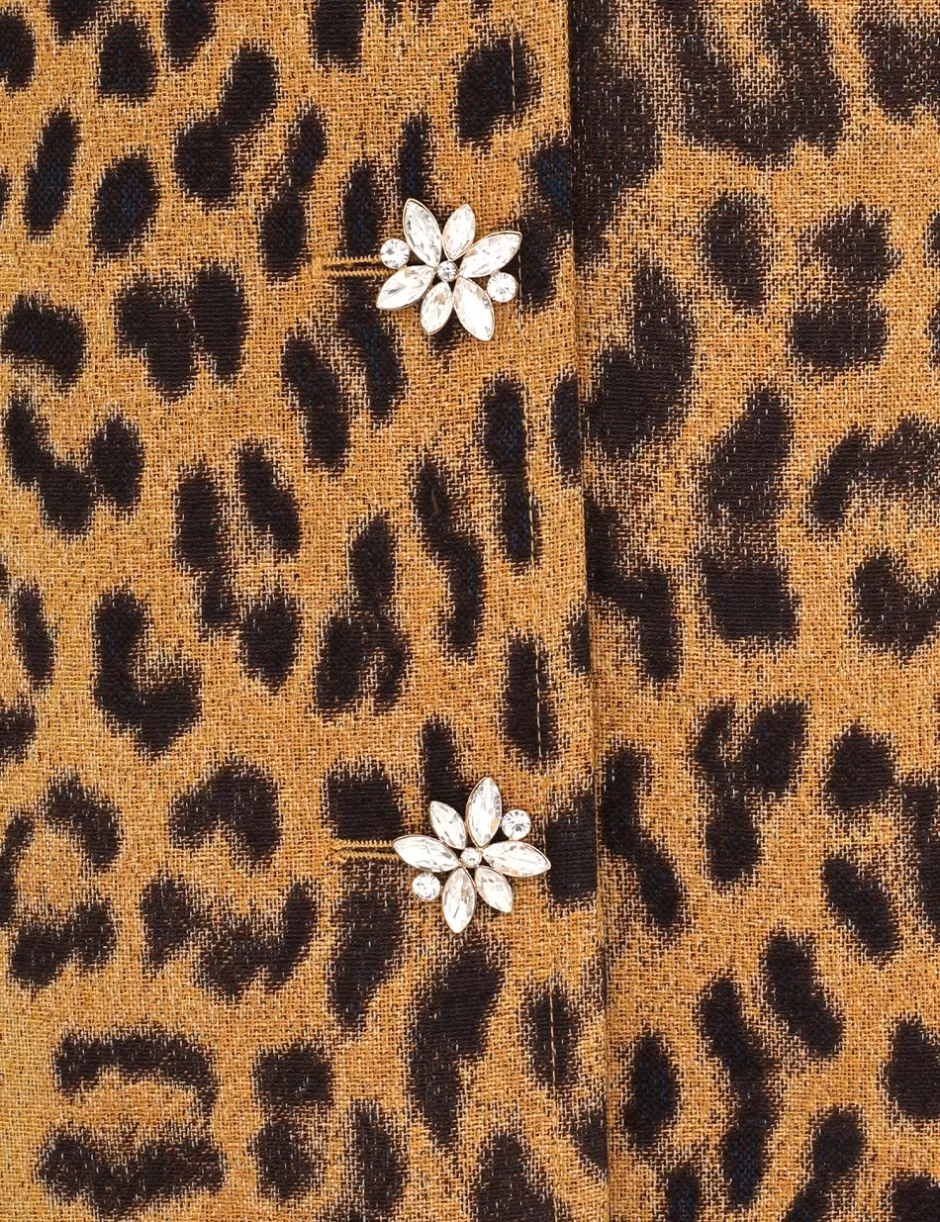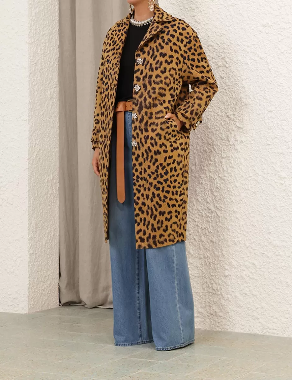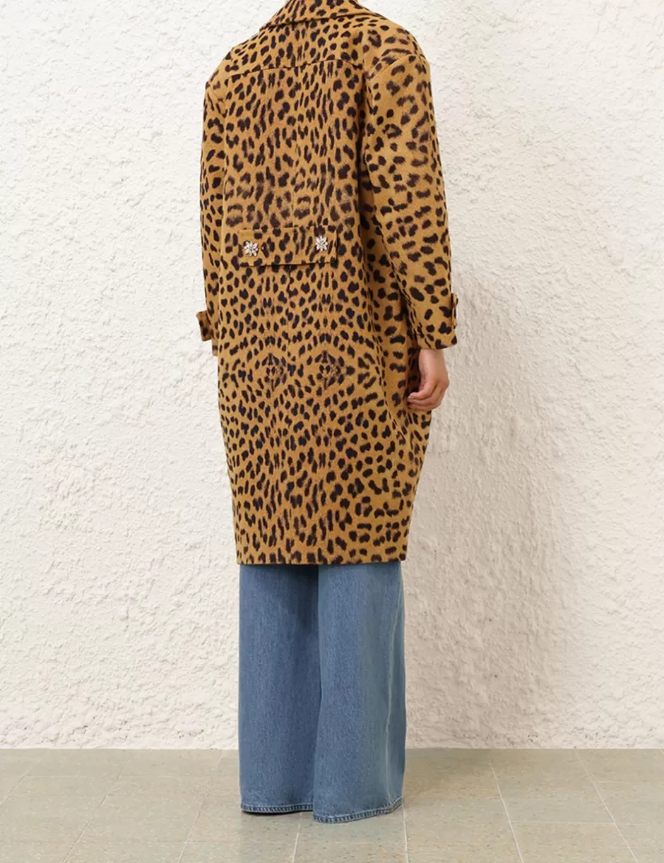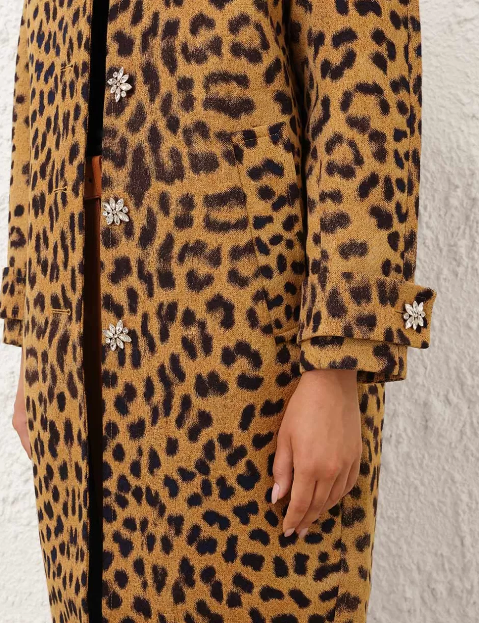The Crush Jacquard Barrel Coat in Leopard from our Resort 2025 Collection, Crush. A cotton blend midi length barrel coat featuring a single breasted closure, a classic collar and crystal buttons down the centre front placket, on the cuffs and on back tab.