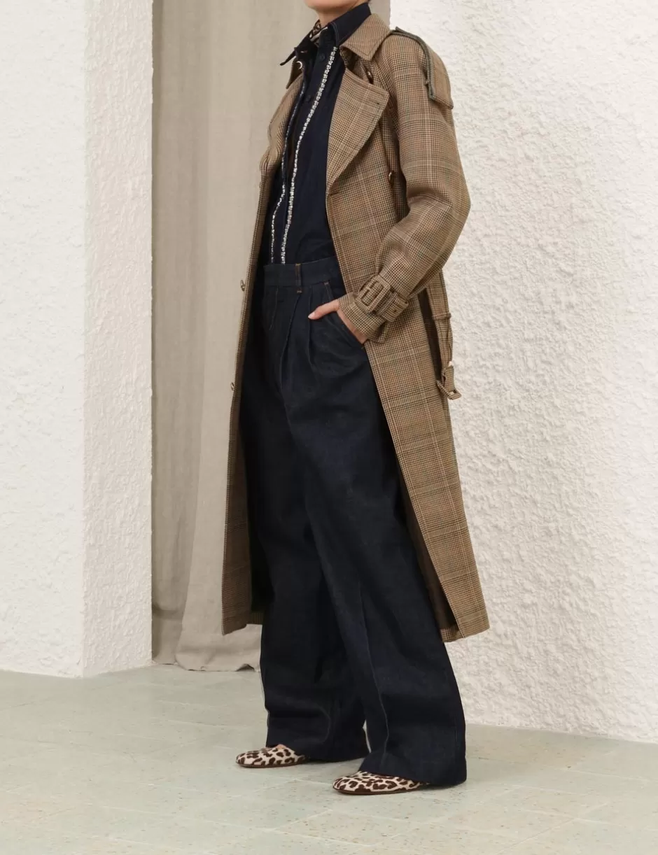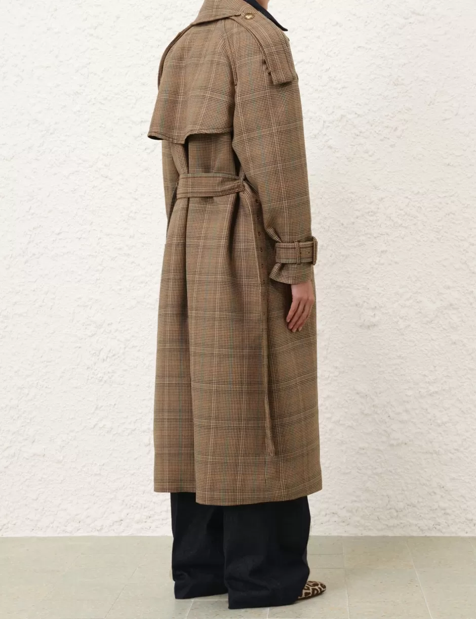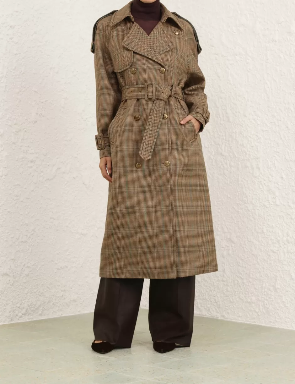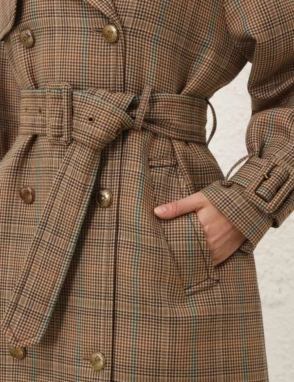 The Eden Checked Trench Coat in Check from our Fall 2024 Collection, In Illustration. A midi length double breasted trench coat featuring a centre front opening with ZIMMERMANN branded buttons, a classic collar with a hook and bar closure; finished with a self cover buckle belt.
