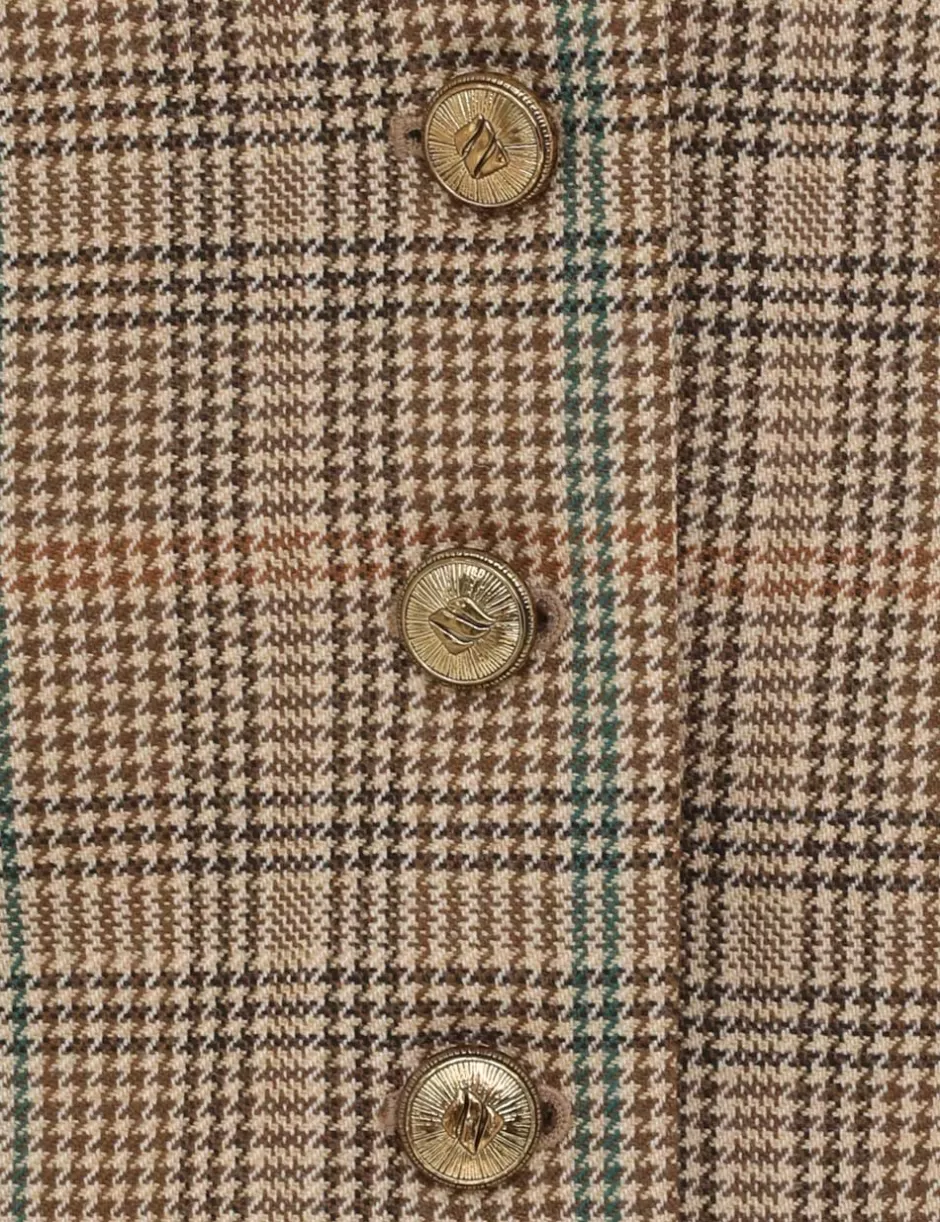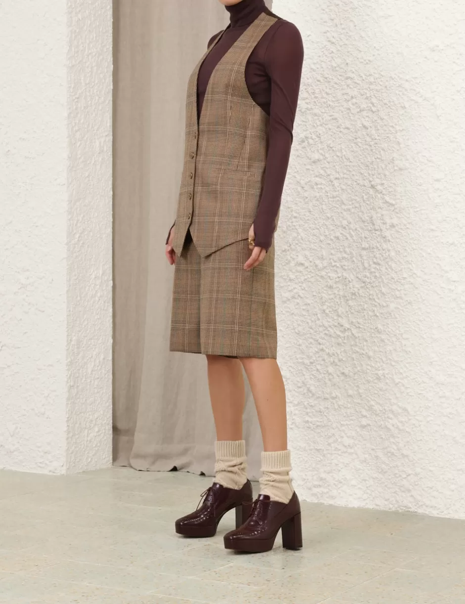The Eden Checked Vest in Check from our Fall 2024 Collection, In Illustration. A wool waistcoat featuring a deep V-neckline, buttons down the centre front with mock pockets on each side.