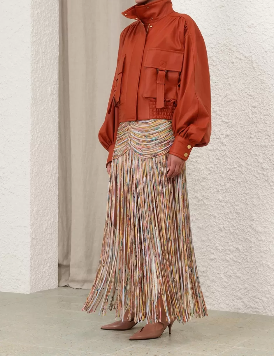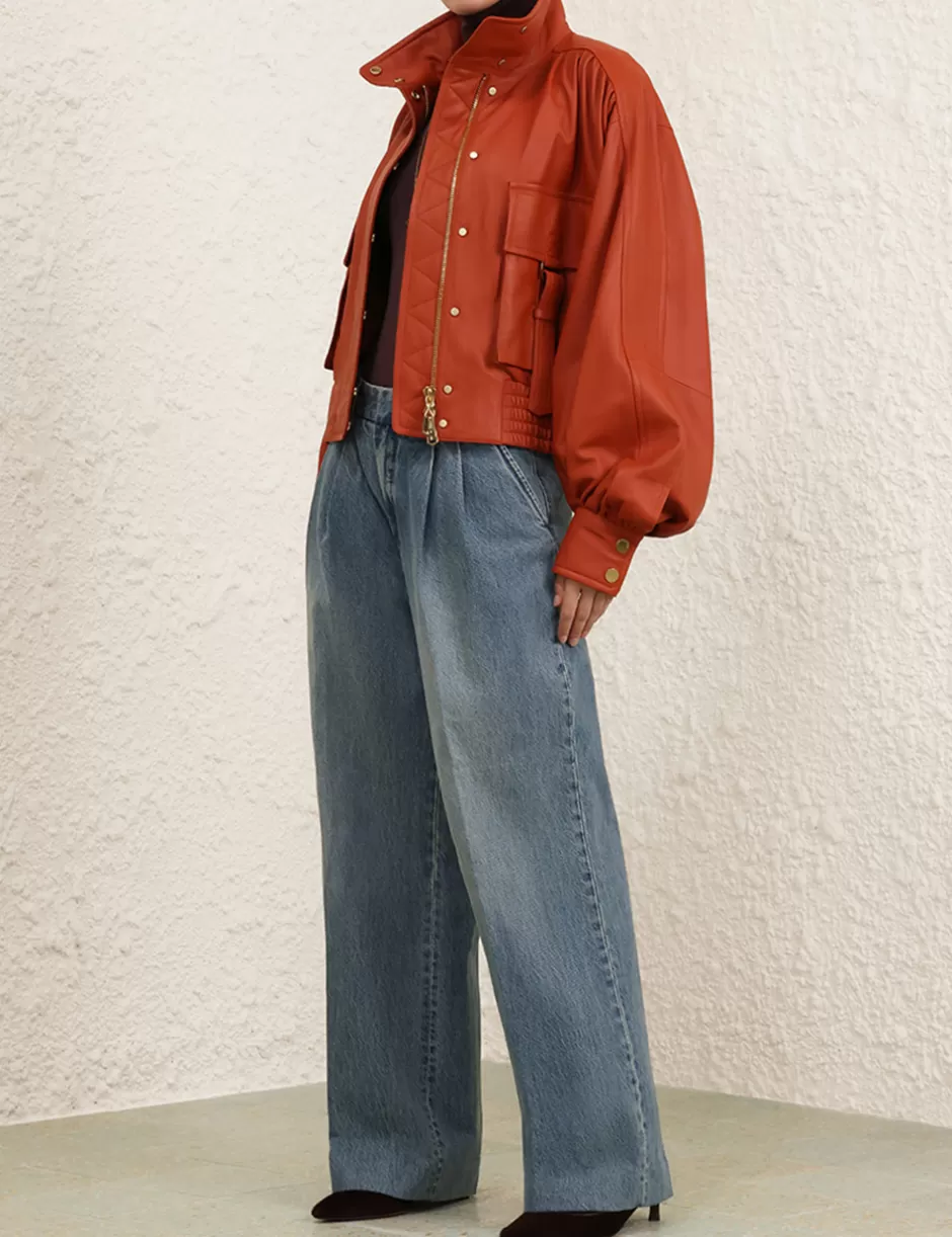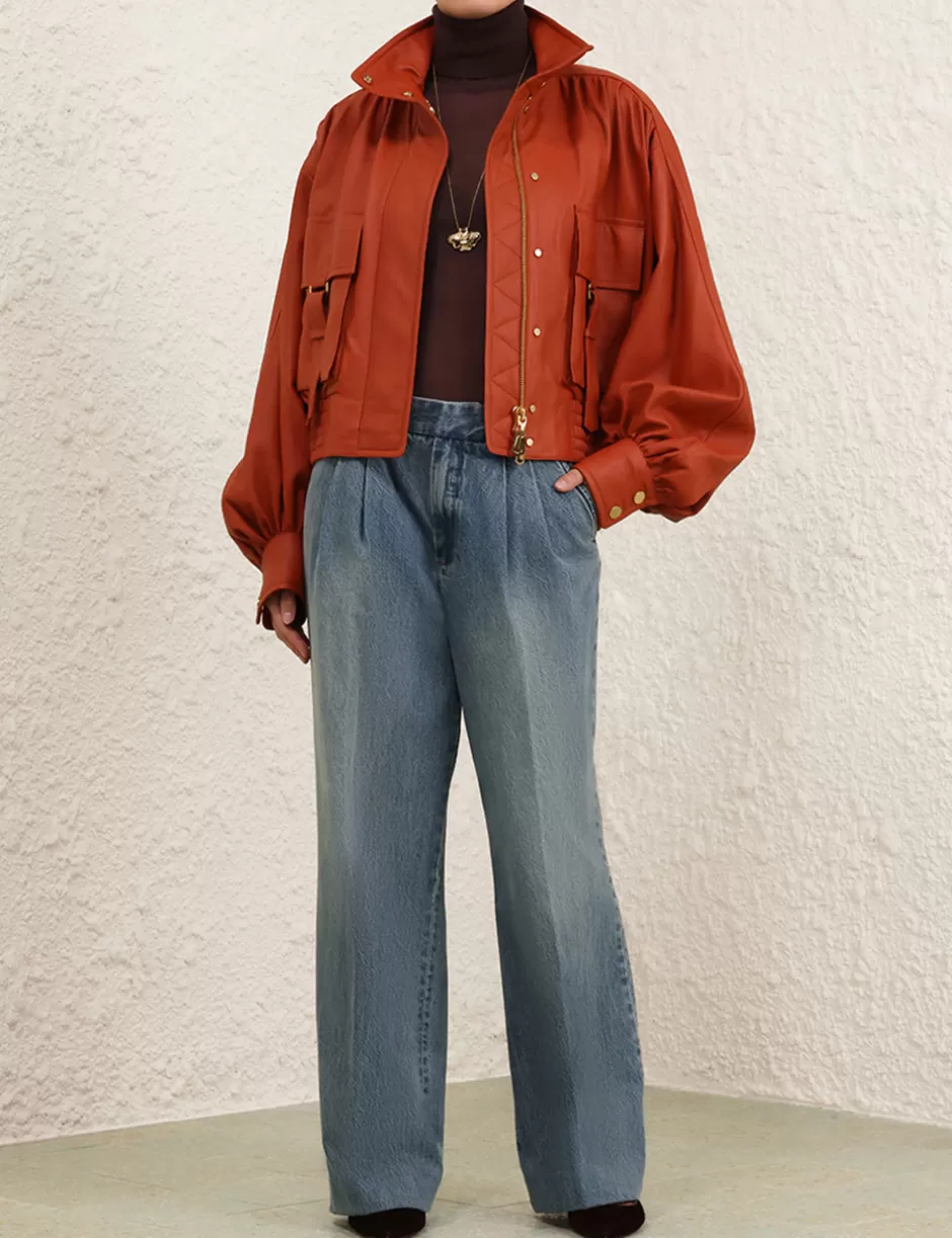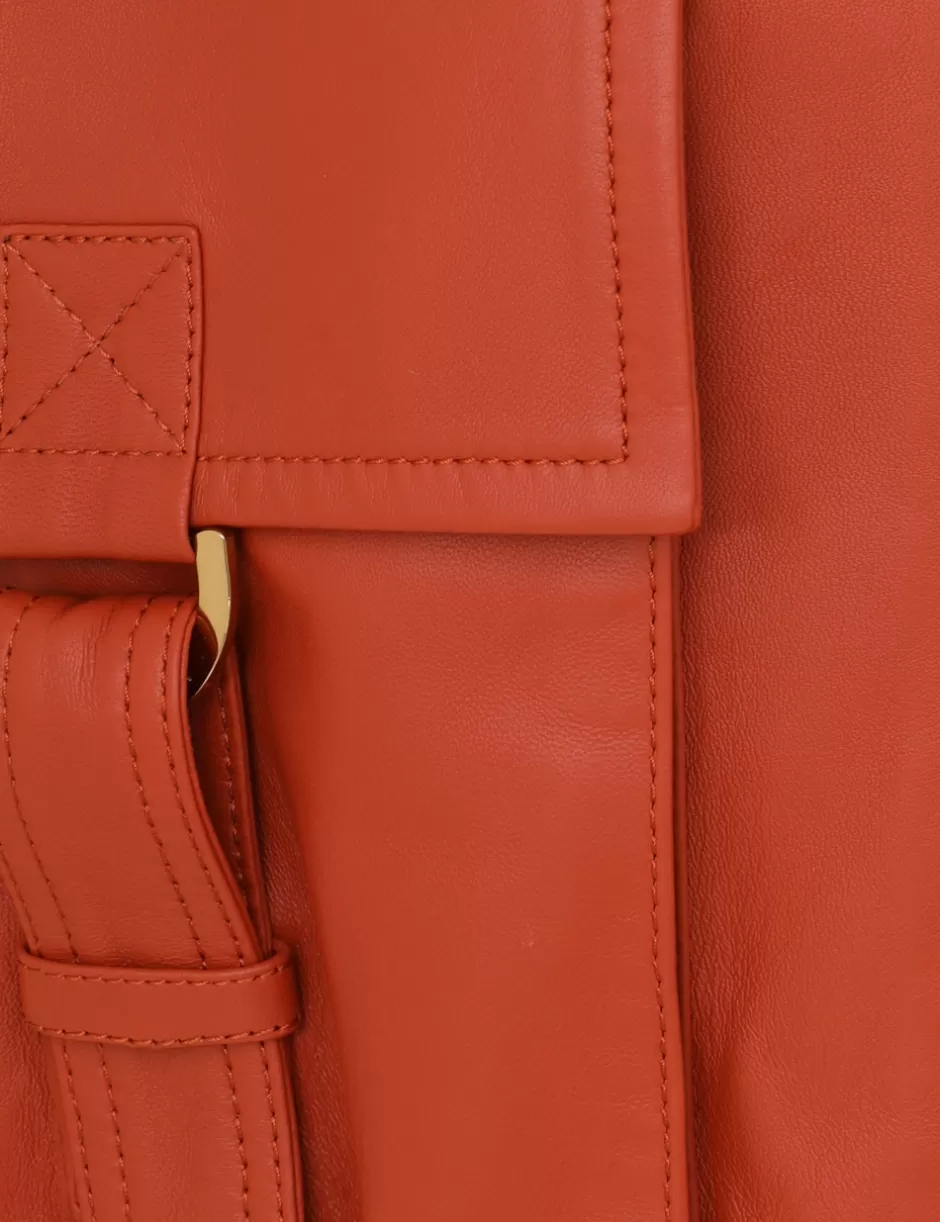 The Illustration Biker Jacket in Spice from our Fall 2024 Collection, In Illustration. A leather bomber jacket featuring a high collar, concealed centre front zip and front flap pockets with a ‘D’ buckle and a strap closure.