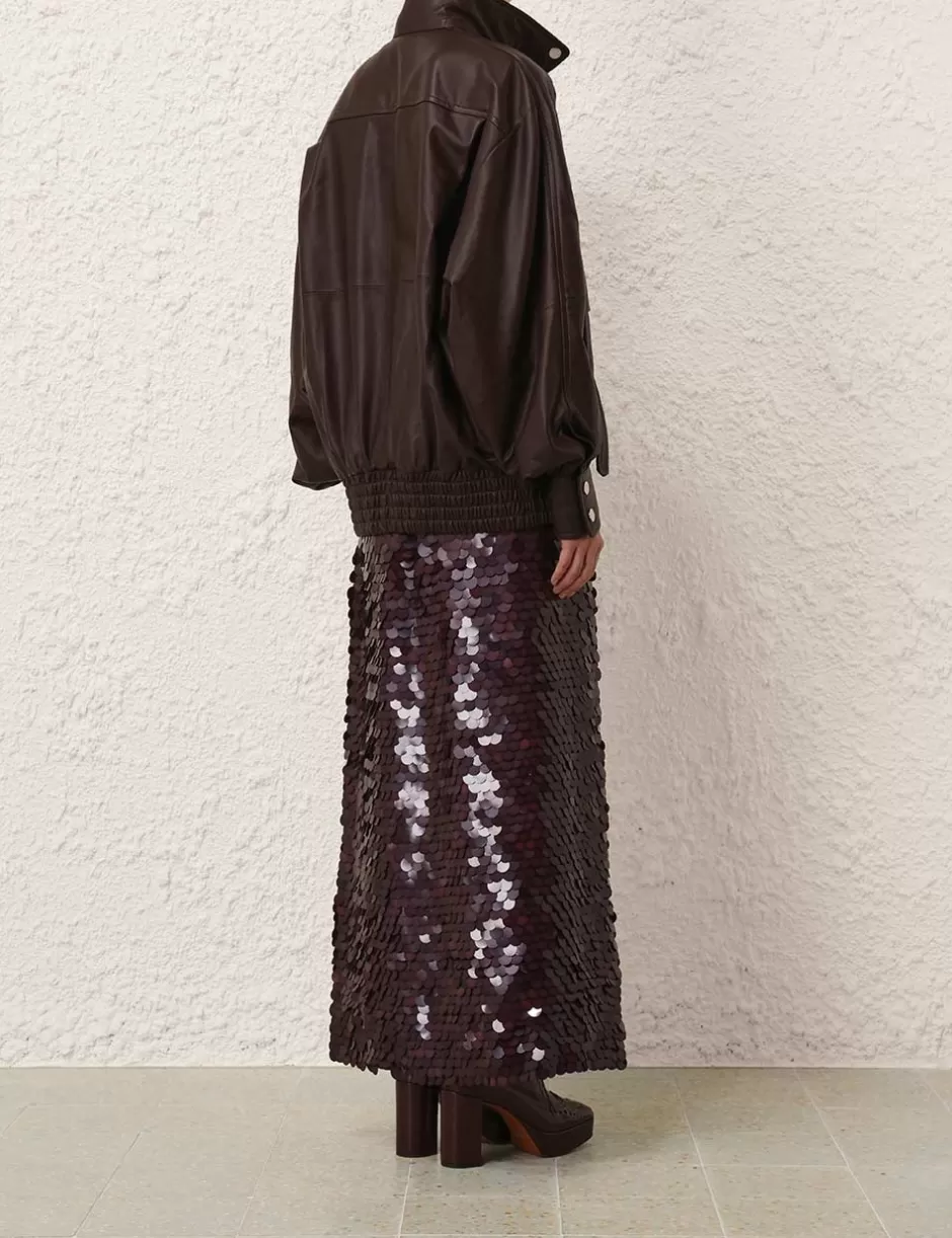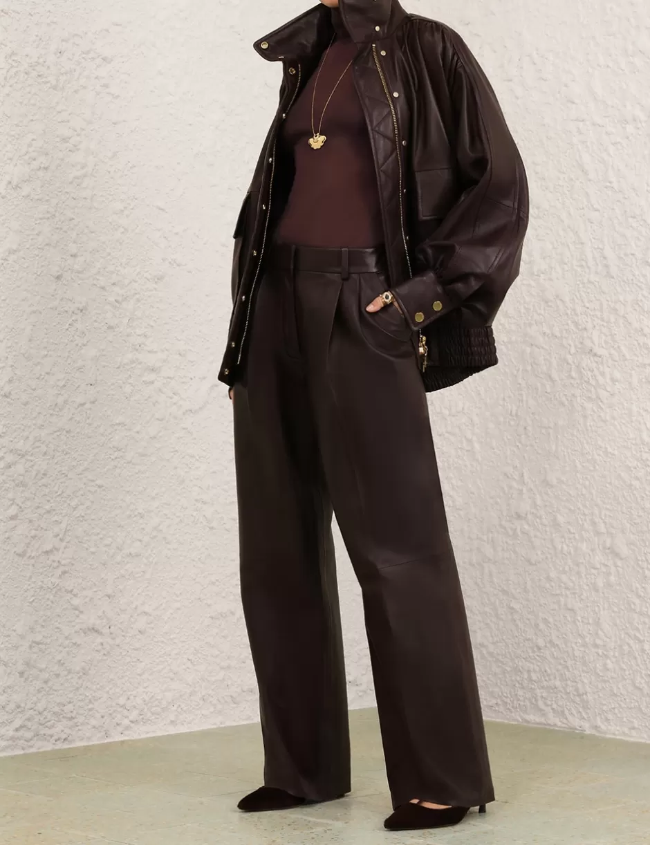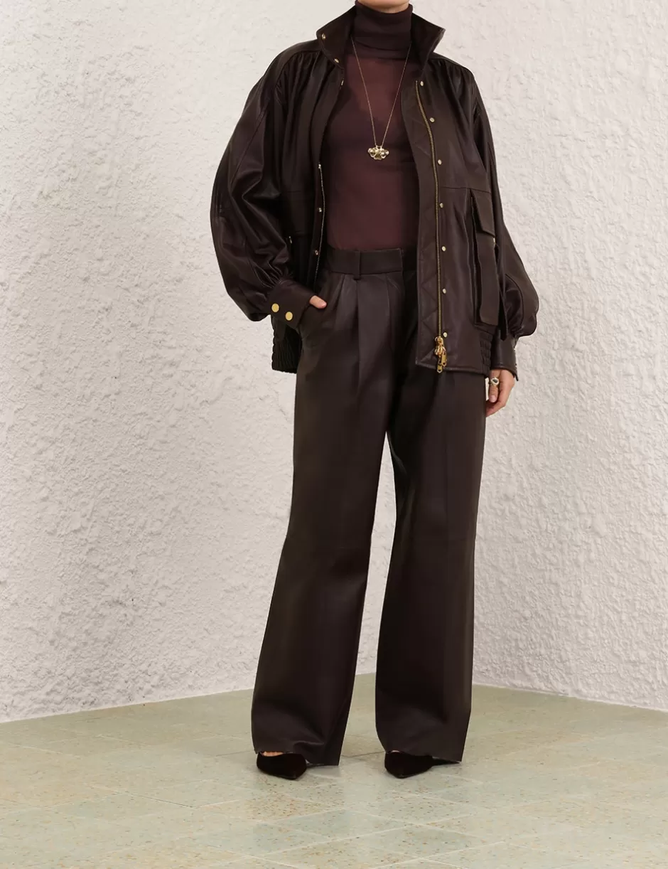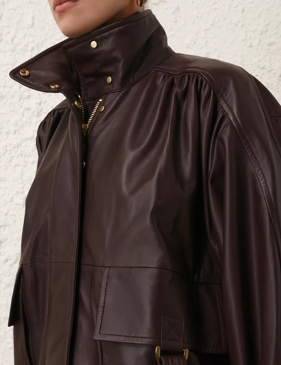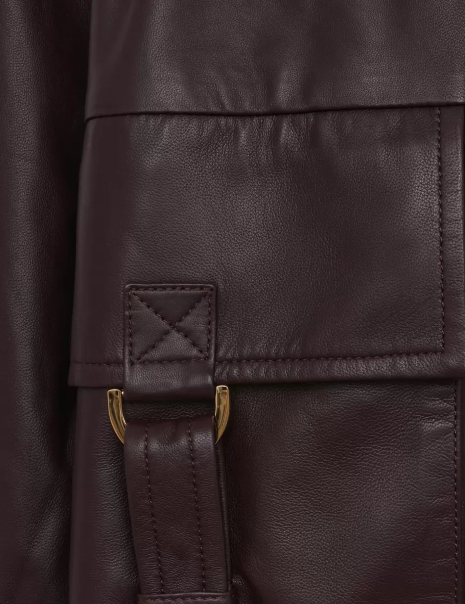 The Illustration Leather Jacket in Mahogany from our Fall 2024 Collection, In Illustration. A leather bomber jacket featuring a high collar, concealed zip and snaps down the front; finished with functional front flap pockets with a ‘D’ buckle and a strap closure.