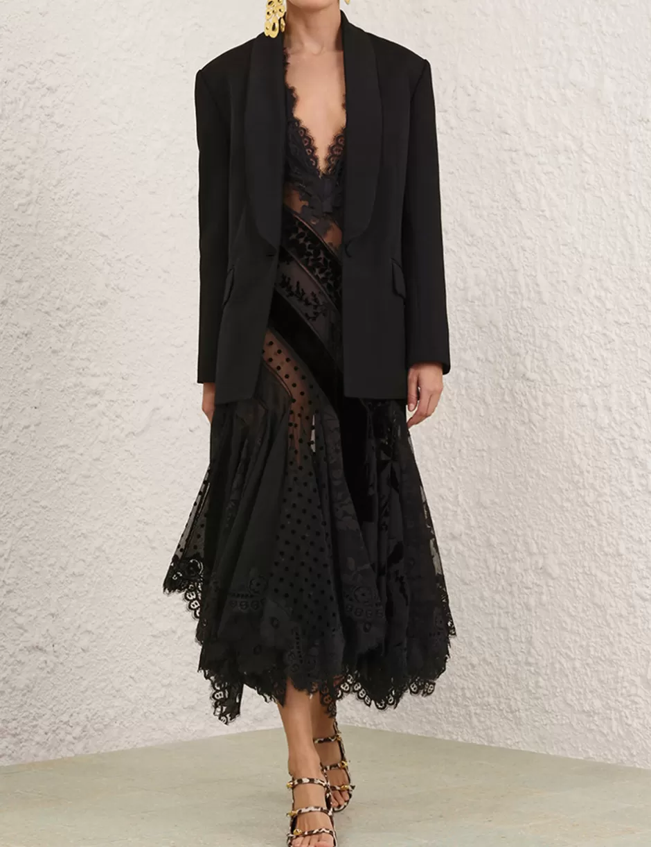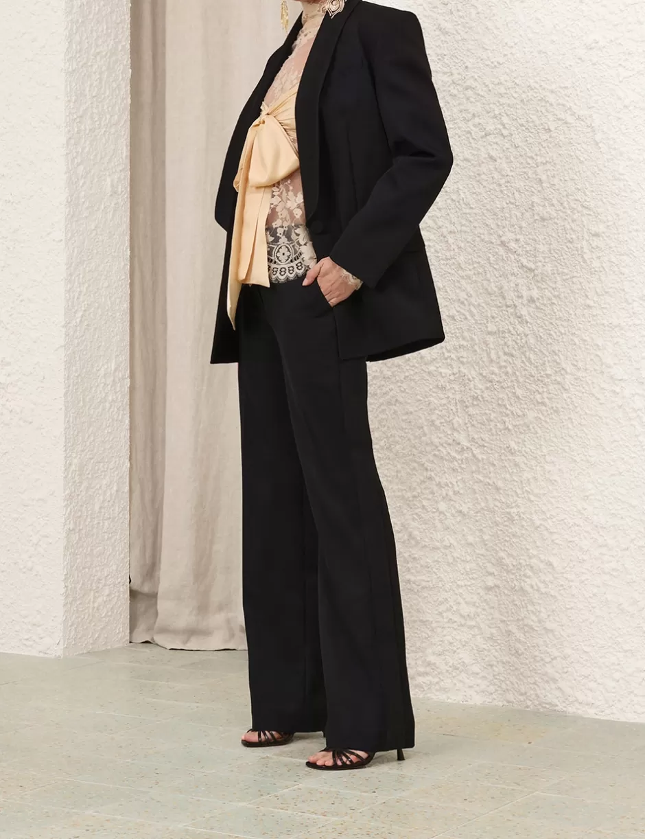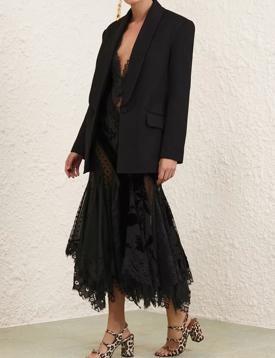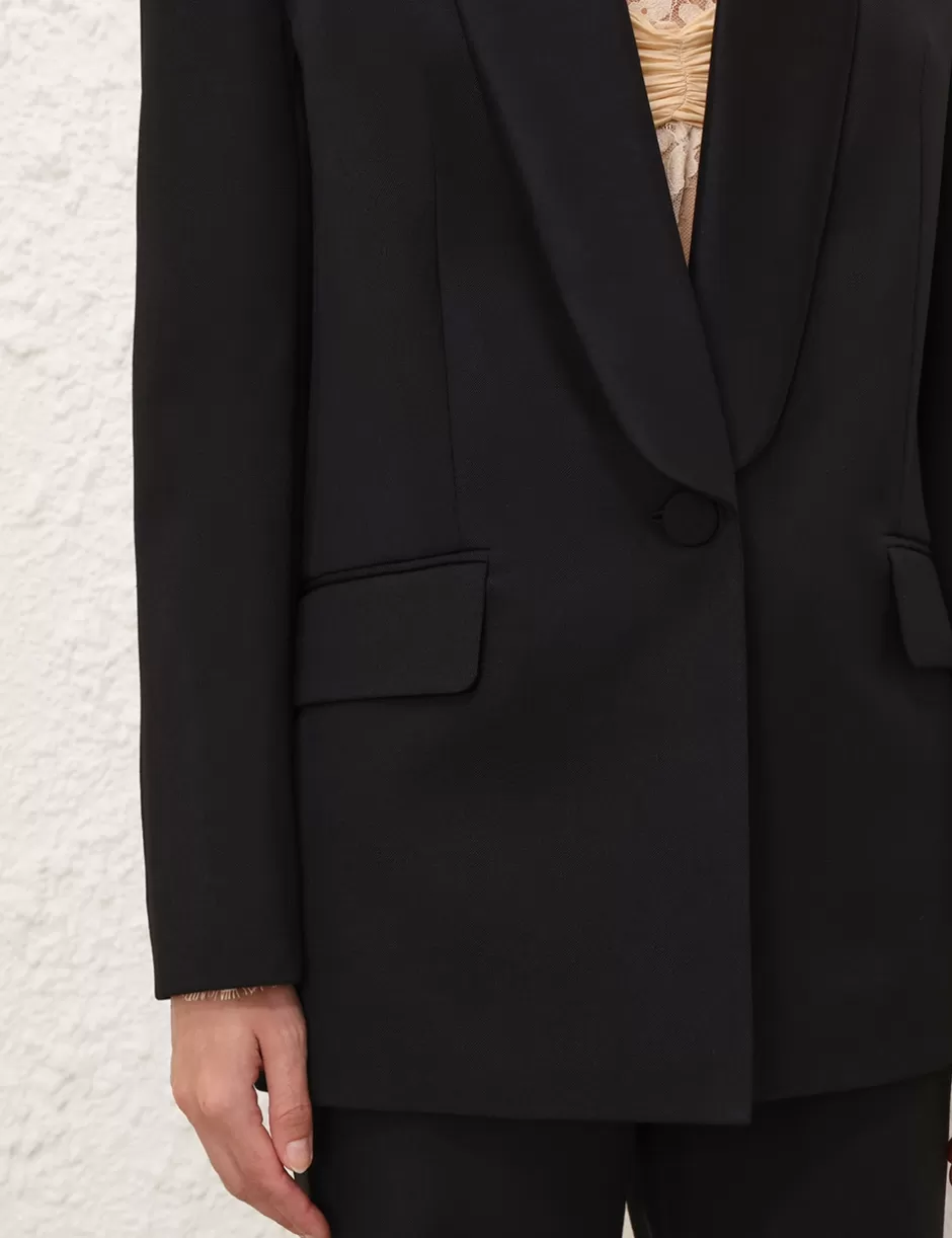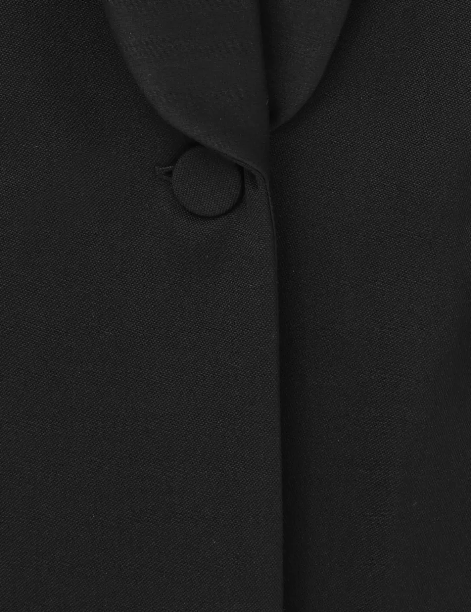 The Illustration Shawl Tux Jacket in Black from our Fall 2024 Collection, In Illustration. A wool blend jacket featuring a shawl collar, front pockets and a button closure at centre front.