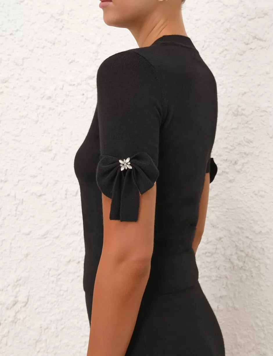 The Crush Bow Embellished Top in Black from our Resort 2025 Collection, Crush. A wool short sleeve top featuring a ribbed crew neckline and a bow trim with crystal detailing on the ribbed sleeve hemline.